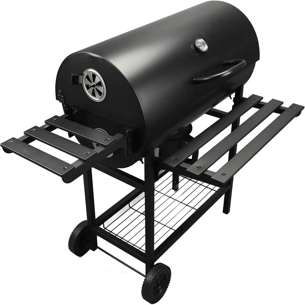 عربة شواء مدخنة من الفولاذ الأسود مع شواية فحم خارجية وحساس الحرارة مع عجلات ورفوف