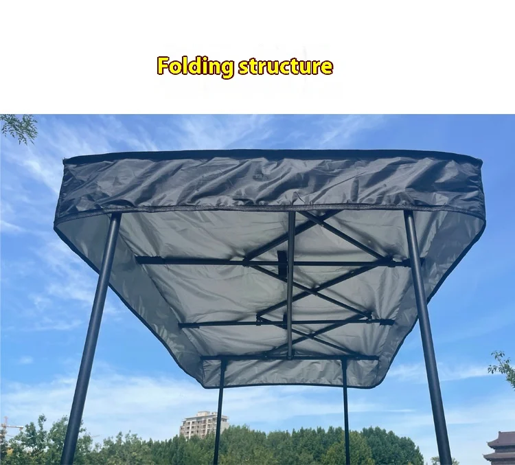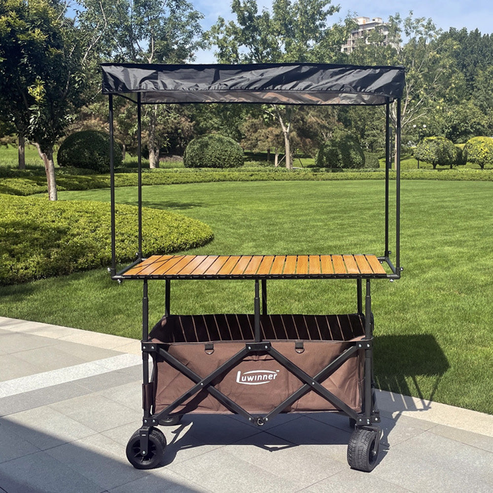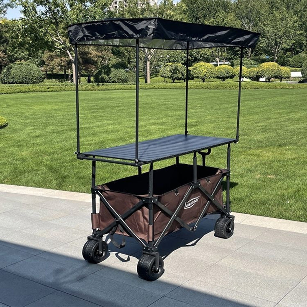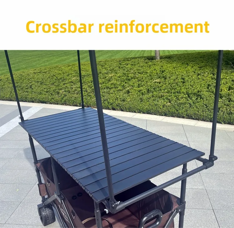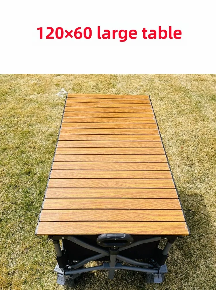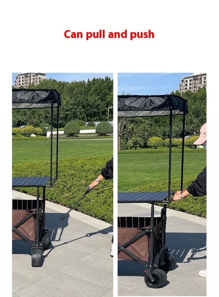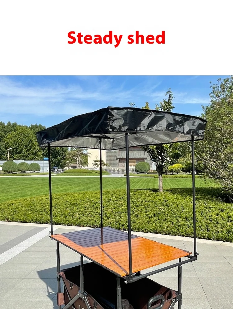 المنتج الموضح في الصور عبارة عن عربة متعددة الاستخدامات قابلة للطي، مزودة بمظلة شمسية وسطح طاولة علوي، تُستخدم عادةً في التخييم والنزهات والأسواق وأكشاك البيع المتنقلة.