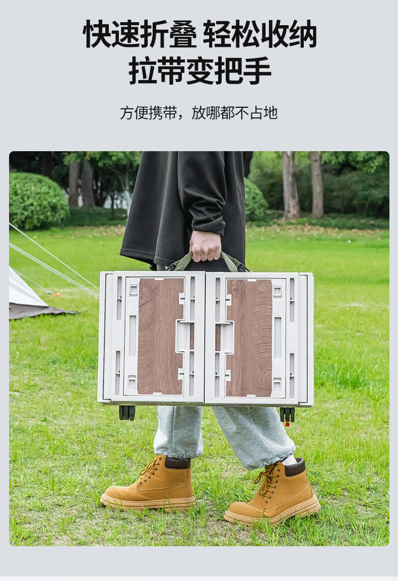 صندوق تخزين قابل للطي ومتين مع مكتب قابل للتخييم، وقوس سفلي للقضيب، و4 عجلات، ومنظم صندوق تخزين متعدد الوظائف سعة 65 لترًا للتخييم في الهواء الطلق، وتخزين مستلزمات النزهة والكتب ووجبات الإضاءة المتزايدة