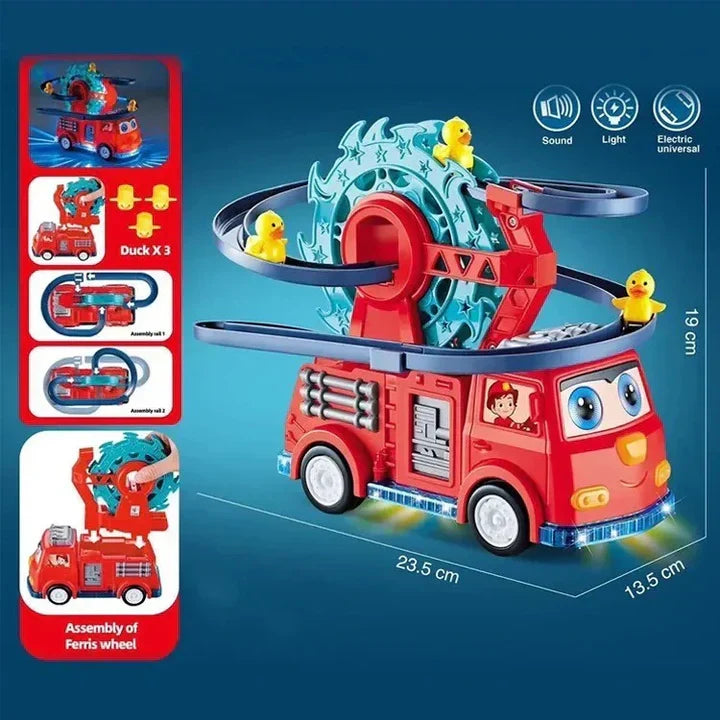 استمتع بمغامرة مدينة الملاهي المثالية مع لعبة عجلة فيريس ويل سكيت فايرتراك! شاهد عجلة فيريس وهي تأخذ لعبة البطة الصغيرة الكهربائية إلى الأعلى وترسلها إلى أسفل المسار في حلقة مستمرة. تجلب الموسيقى وأضواء LED رباعية الأبعاد عنصرًا ممتعًا وخياليًا إلى هذه الرحلة المثيرة بالفعل. يسمح مفتاح تشغيل/إيقاف الموسيقى باللعب الهادئ عند الحاجة، كما أن التجميع السهل والمركبات اللطيفة تجعلها اللعبة المثالية للأطفال من جميع الأعمار. تعمل إما بواسطة USB أو بطارية 3*AA (اختياري). ستجذب الأضواء الملونة والموسيقى الجميلة انتباه الأطفال وتبقيهم مستمتعين لساعات متواصلة. تأتي مجموعة اللعب هذه بثلاثة أوضاع مختلفة: الوضع الأول مغلق، والوضع الثاني مشغل بمؤثرات صوتية وضوئية ودوران، والوضع الثالث مشغل بالدوران بدون مؤثرات صوتية وضوئية. التركيب سهل للغاية بفضل تعليماتنا سهلة المتابعة. ببساطة، قم بمحاذاة عجلة فيريس واضغط عليها، ثبّت إطار M، ثبّت المسار النهائي أولاً، اربط المسارات المتبقية، ثبّت الملحقات الصغيرة، ألصق الملصقات، ضع السيارة، وابدأ اللعبة! ألعاب شاحنة الإطفاء مع مسار انزلاق سكة حديدية، عجلات فيريس برسومات البط. لا تدع المرح يفوتك، وأضف هذه اللعبة الرائعة إلى سلة مشترياتك اليوم!