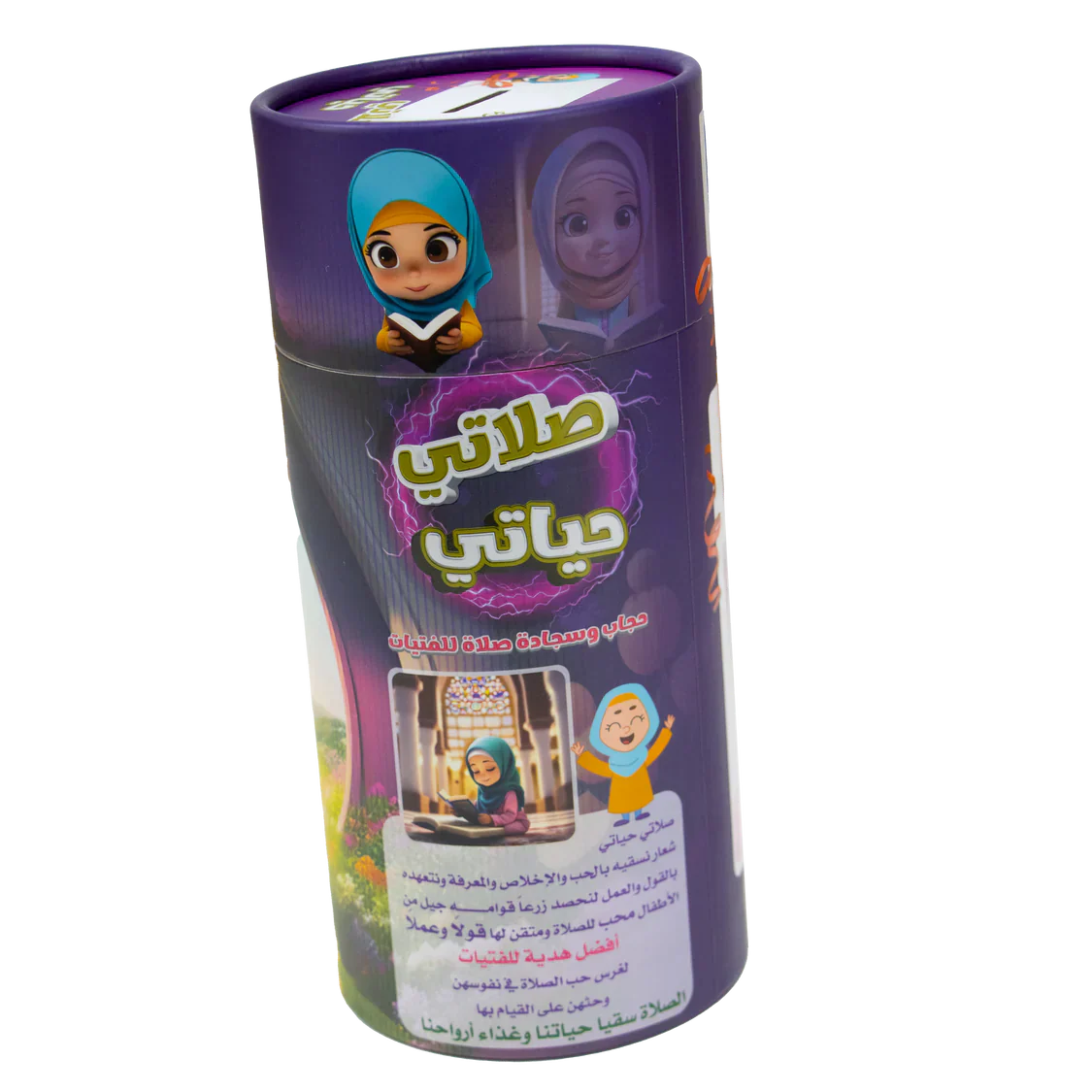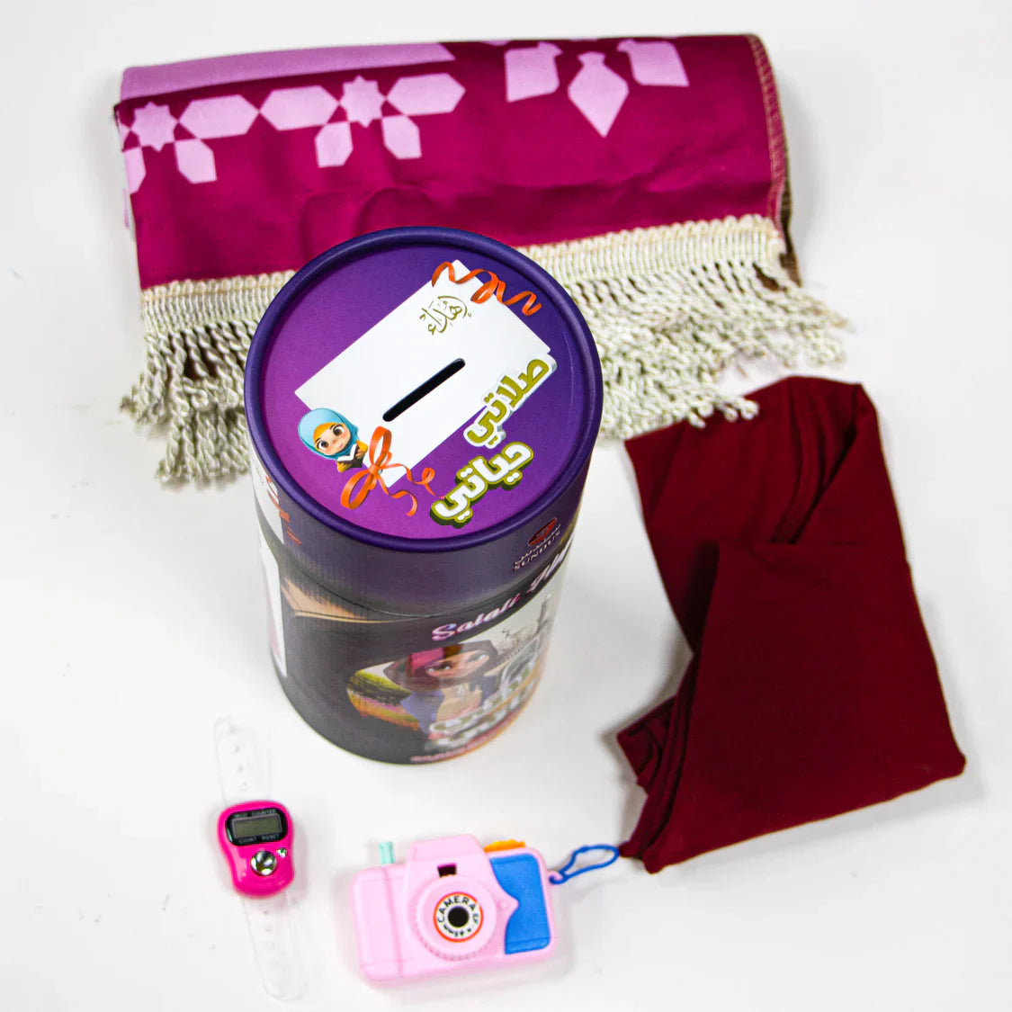 تحتوي على سجادة صلاة وحجاب وخاتم تسبيح، مقدمة في علبة اسطوانية أنيقة وسهلة التخزين.