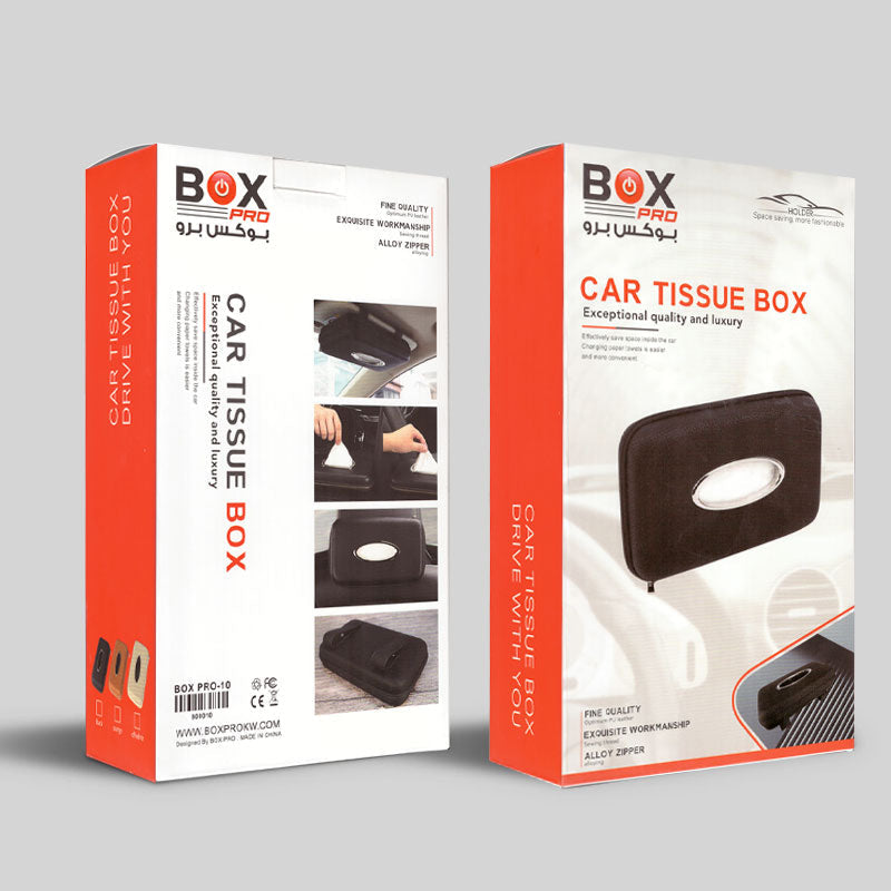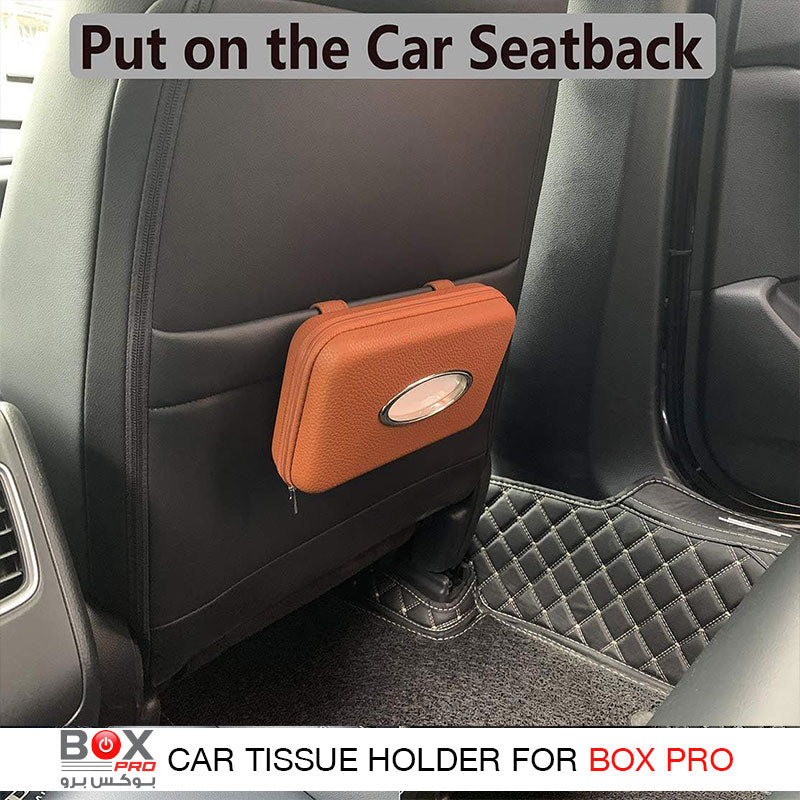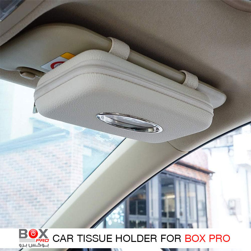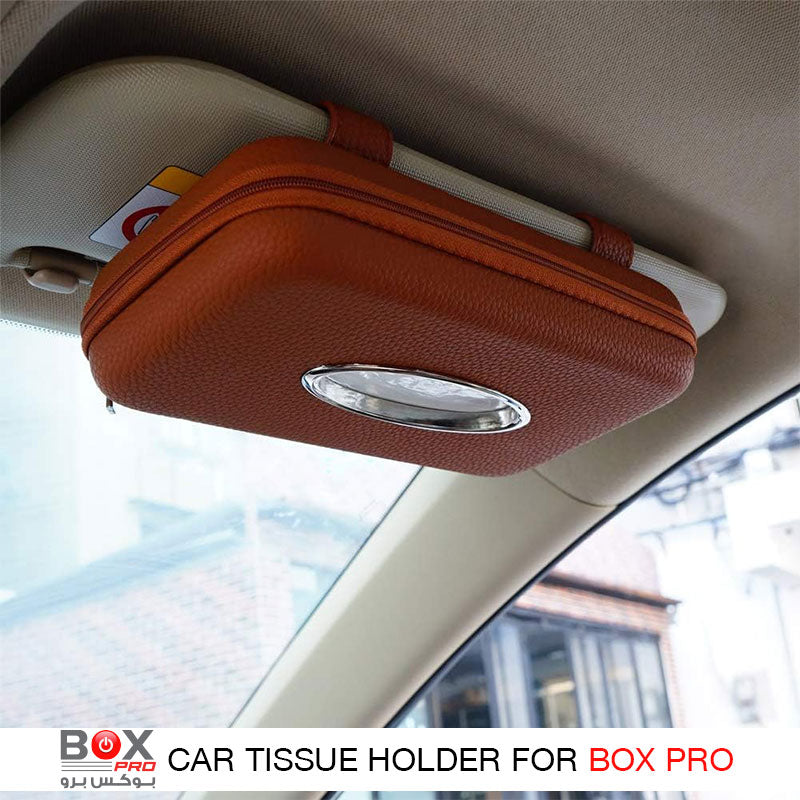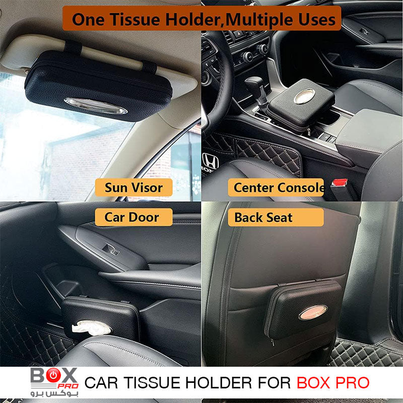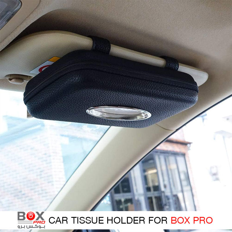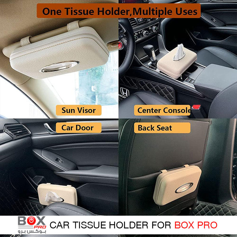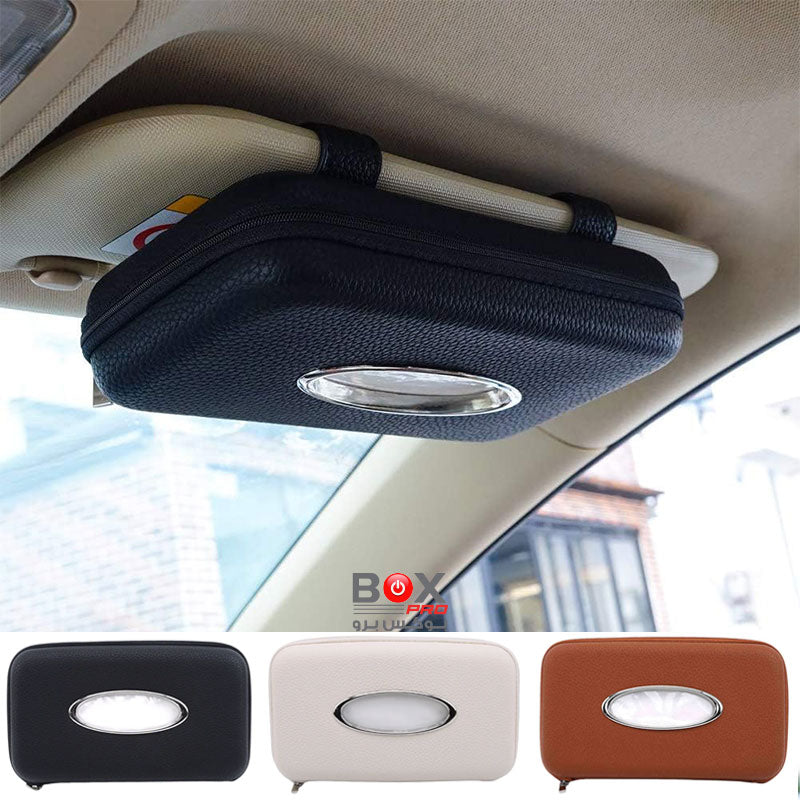 يمكن تعليق حامل مناديل السيارة على حاجب الشمس والمقعد الخلفي ل Box Pro ، وهي علبة مناديل مصنوعة من جلد البولي يوريثين للسيارات والمركبات