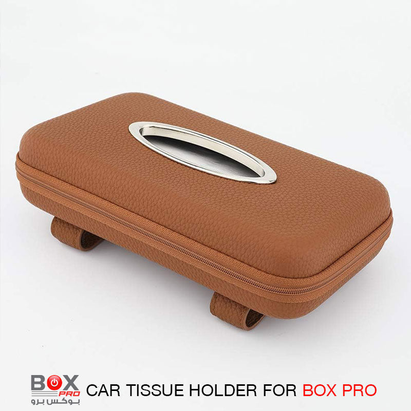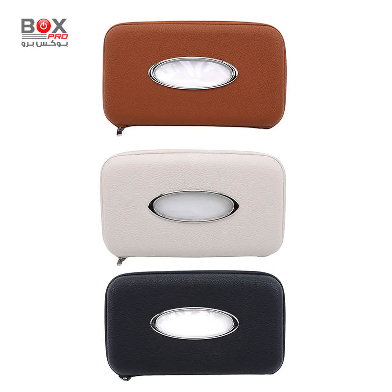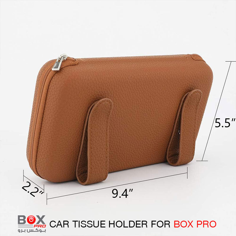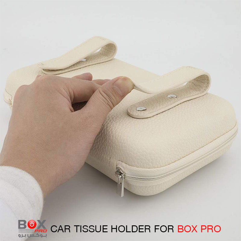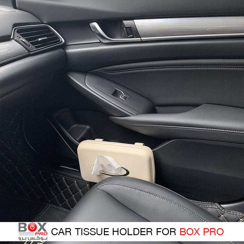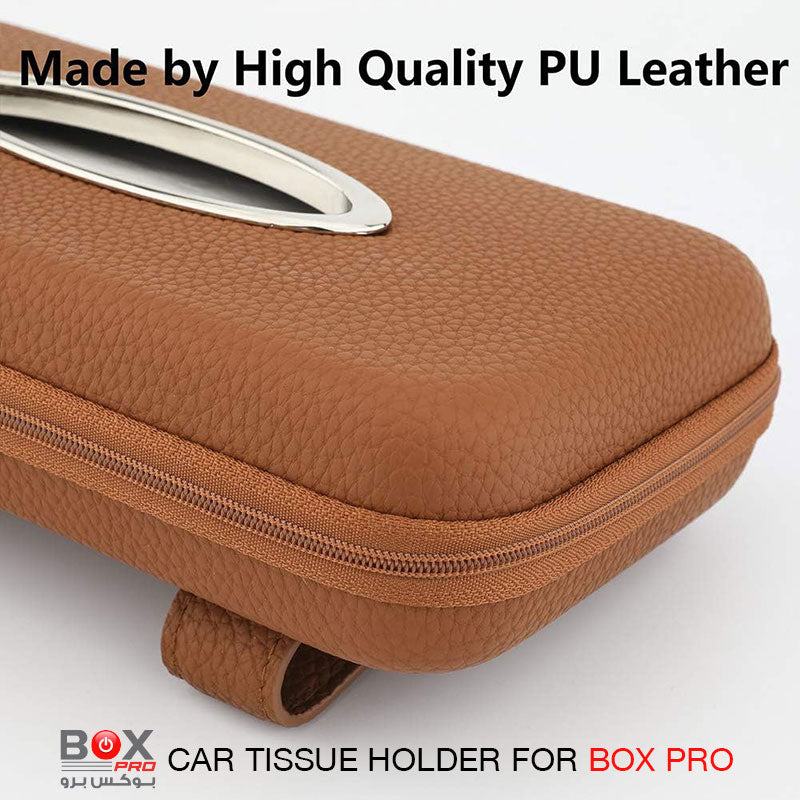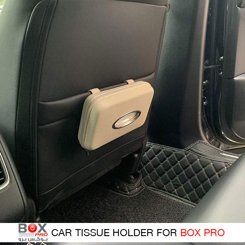 يمكن تعليق حامل مناديل السيارة على حاجب الشمس والمقعد الخلفي ل Box Pro ، وهي علبة مناديل مصنوعة من جلد البولي يوريثين للسيارات والمركبات