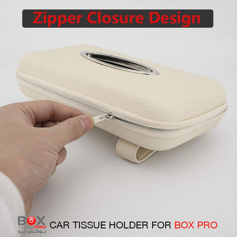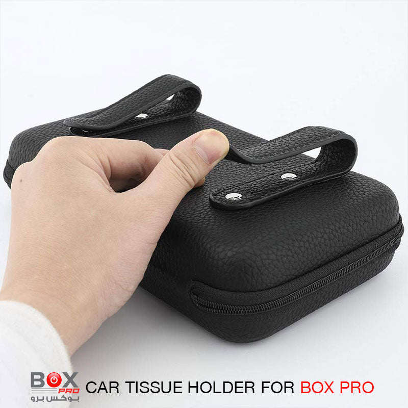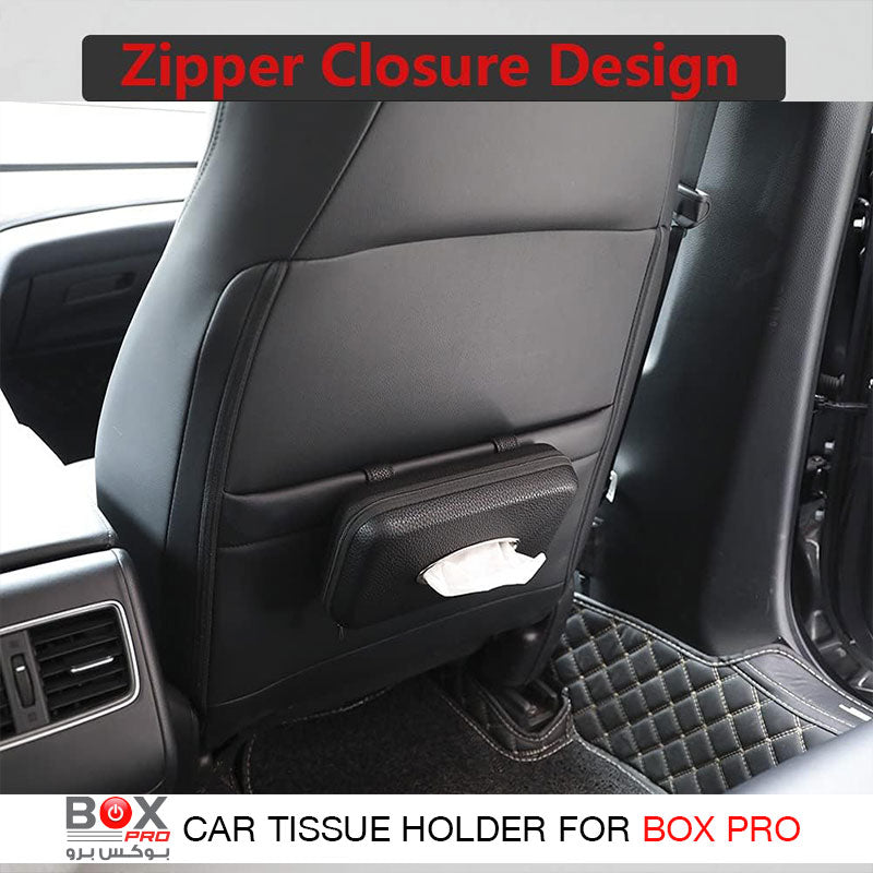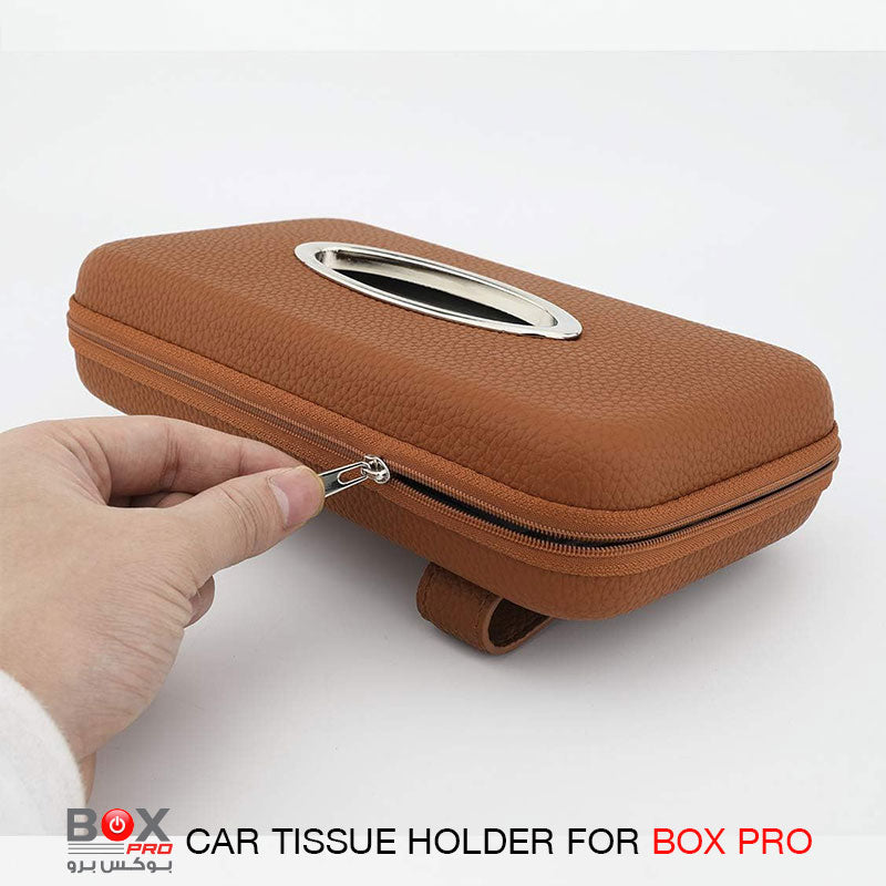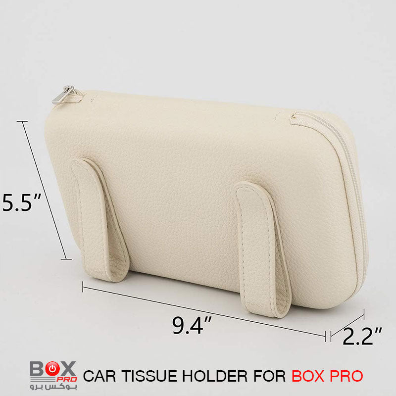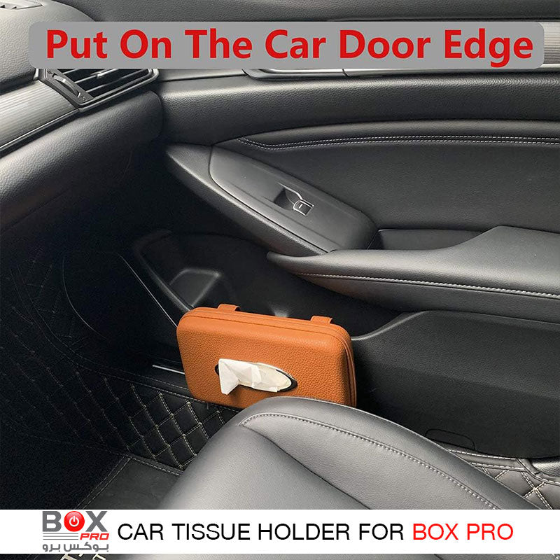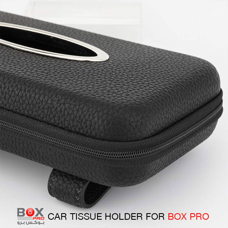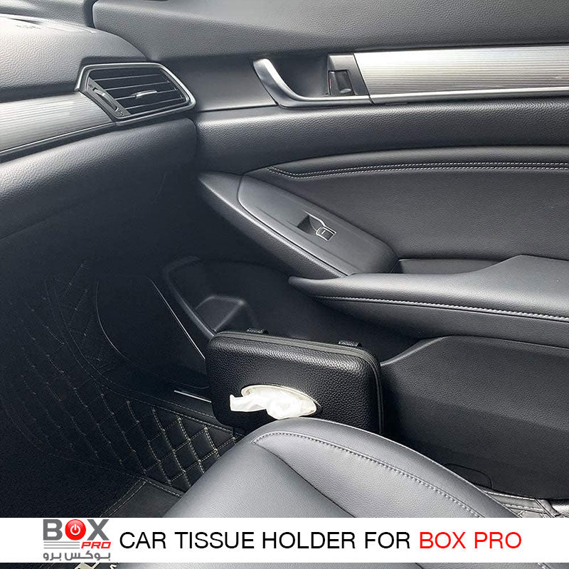 يمكن تعليق حامل مناديل السيارة على حاجب الشمس والمقعد الخلفي ل Box Pro ، وهي علبة مناديل مصنوعة من جلد البولي يوريثين للسيارات والمركبات