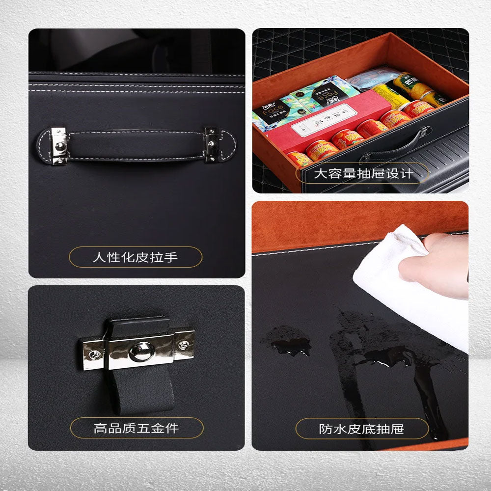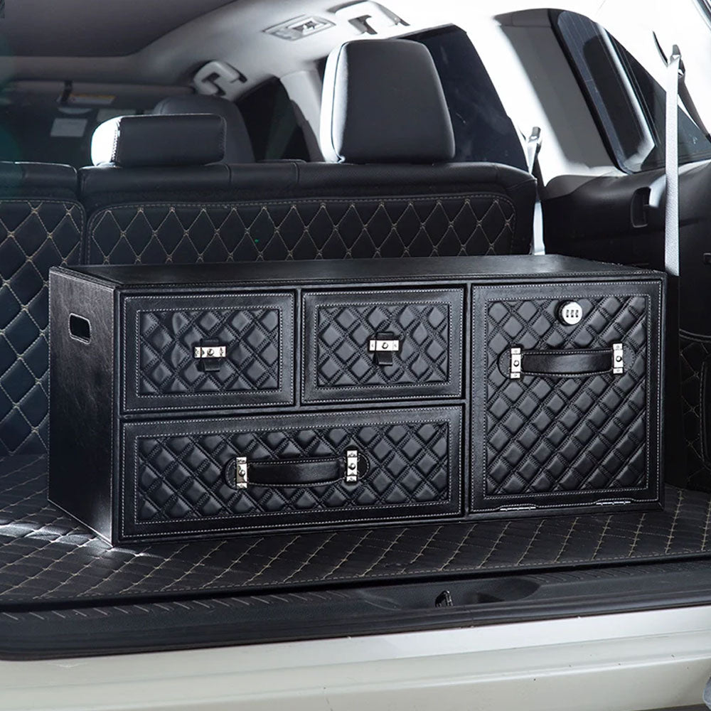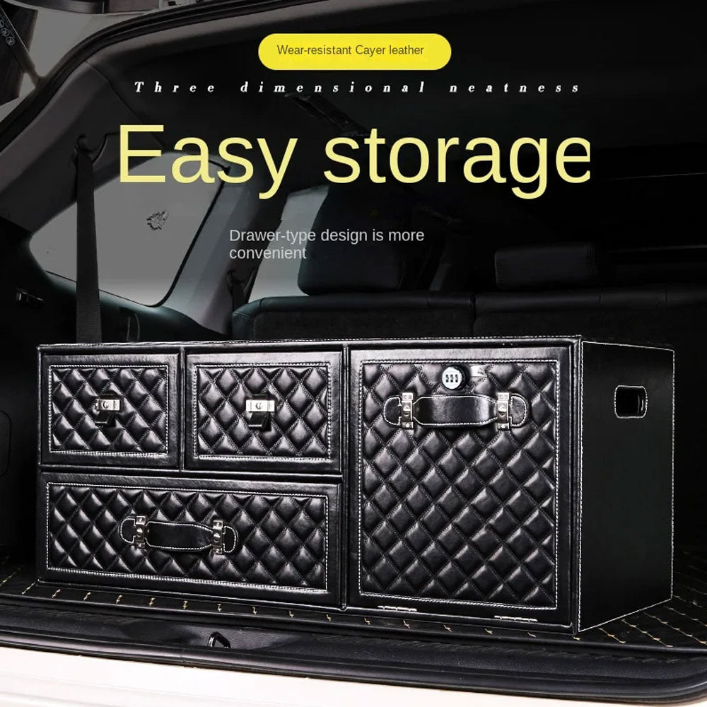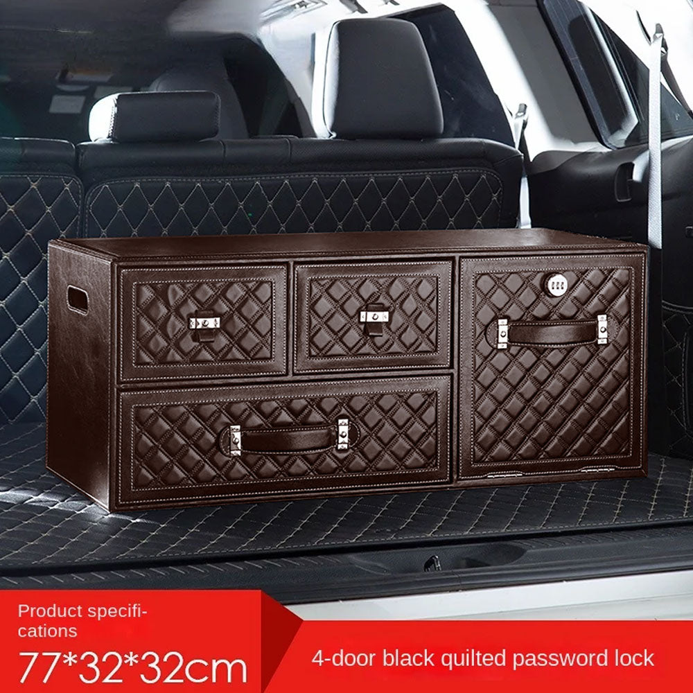 صندوق قوي لتخزين الأمتعة والأغراض المختلفة للسيارة مصنوع من الجلد الفاخر مع 4 أدراج للتخزين متعدد الوظائف وقفل بكلمة مرور