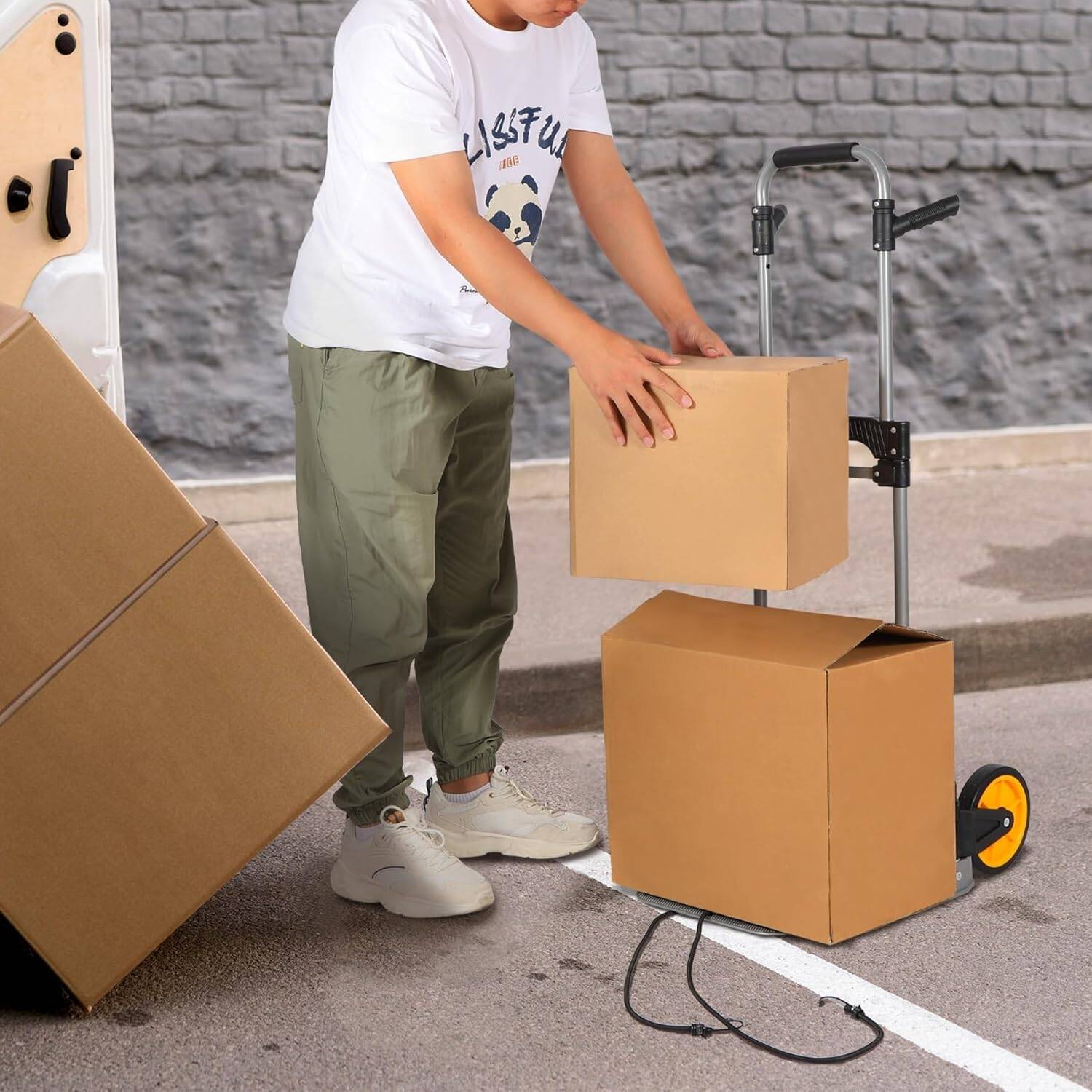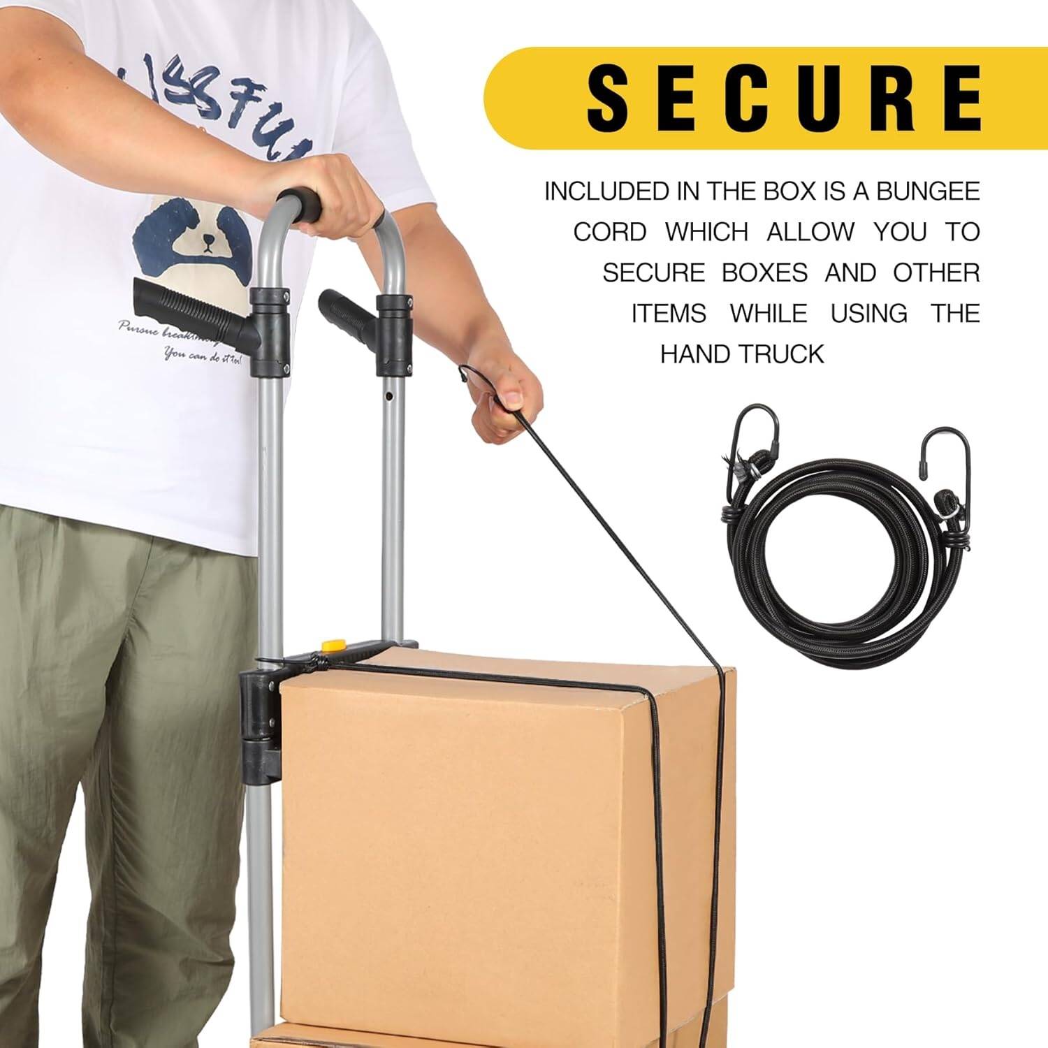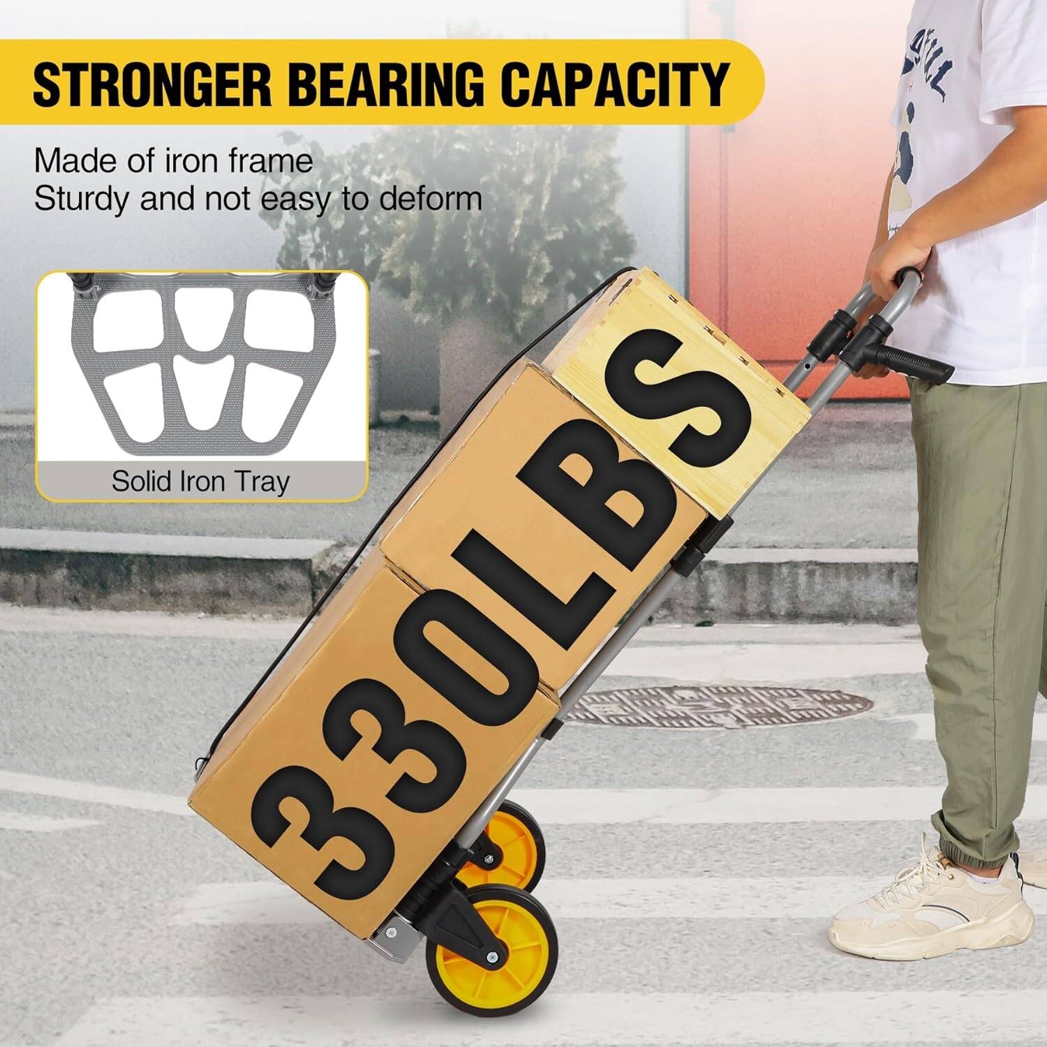 - حمل بضائع أثقل أو أكثر هيكل العربة مصنوع من الحديد. معظم المنتجات الموجودة في السوق مصنوعة من الألومنيوم. على النقيض من ذلك، فإن الحديد أكثر متانة ويصعب تشويهه، ويمكنه تحمل وزن أثقل. علاوة على ذلك، يتم ربط حبل مطاطي بالعبوة لتثبيت البضائع على العربة.