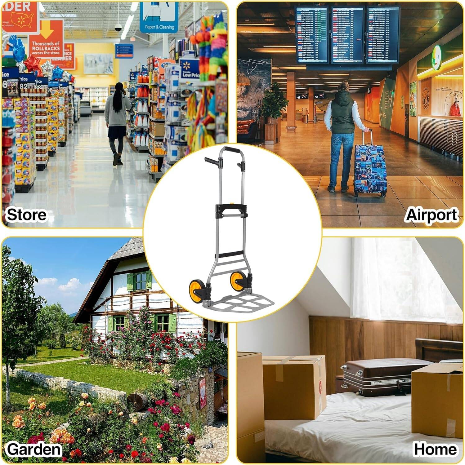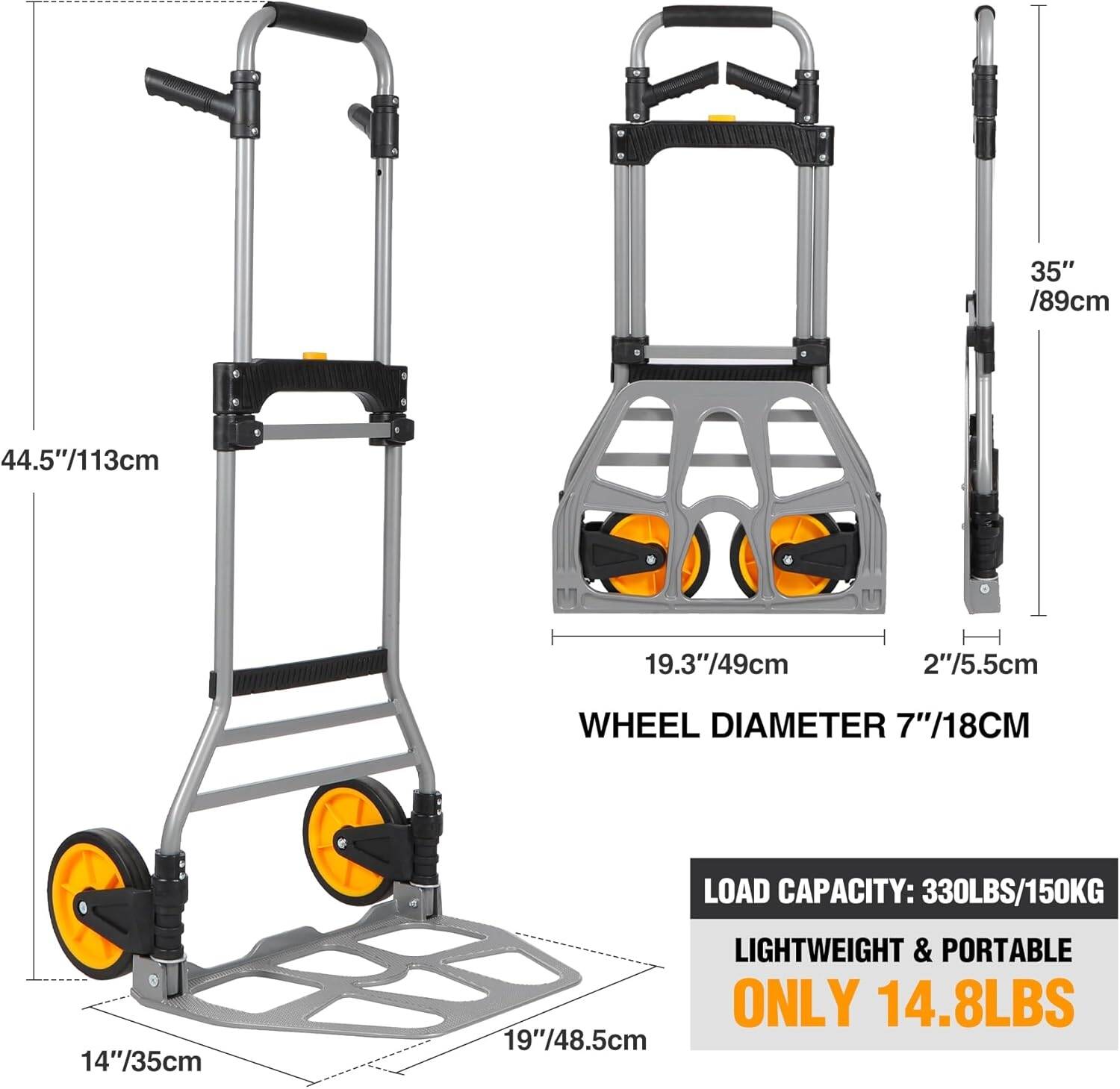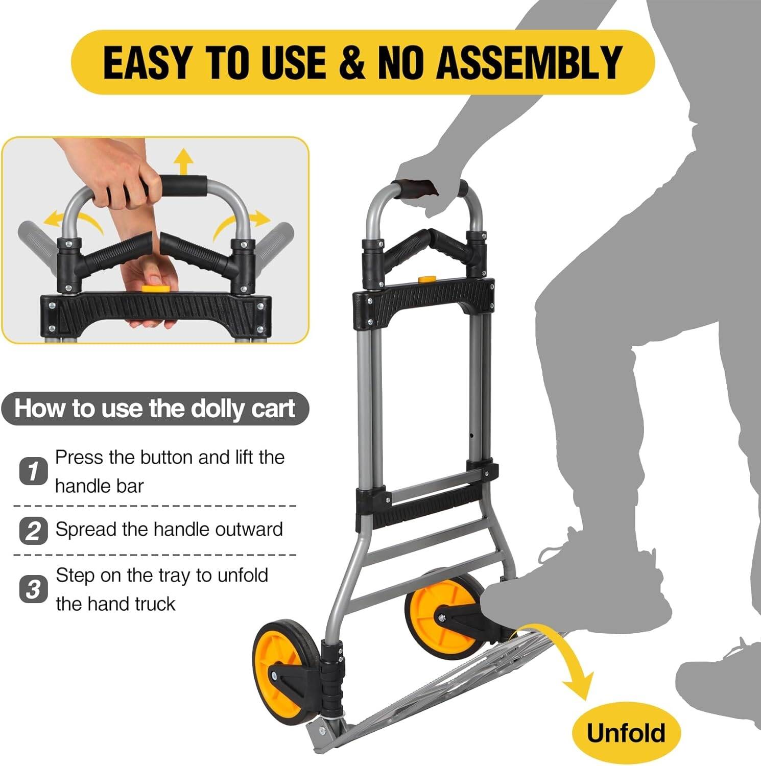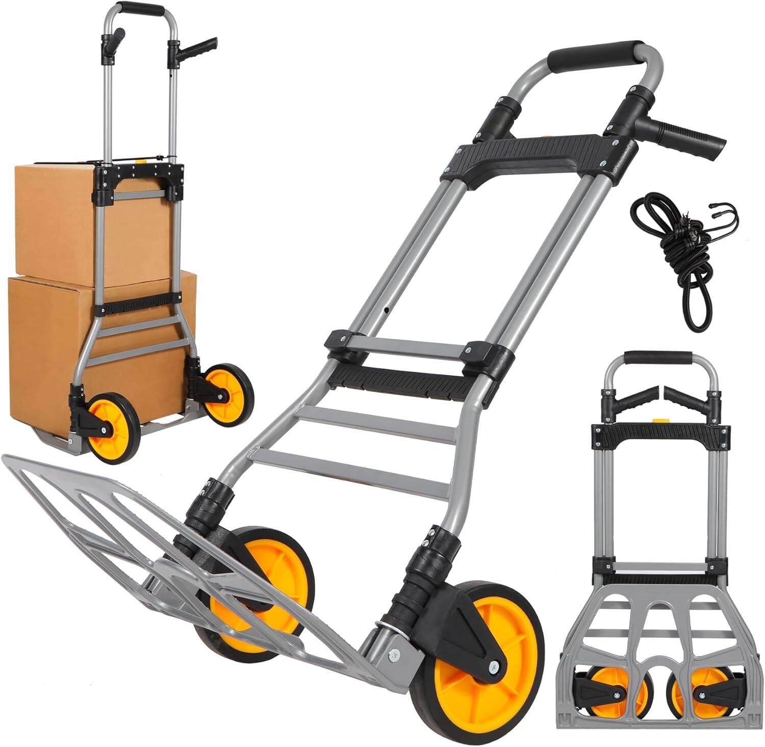 عربة يد قابلة للطي من RedSwing، سعة 330 رطلاً ( 150 كيلو )، عربة يد خفيفة الوزن محمولة بحبل مطاطي وعجلتين مطاطيتين، عربة يد قابلة للطي شديدة التحمل للتسوق المنزلي والانتقال والسفر والمكتب، باللون الأصفر