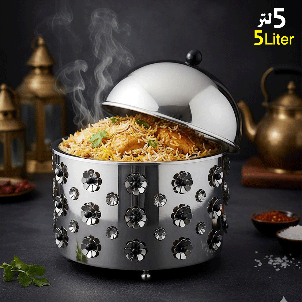 - سعة 5 لتر – مثالي لتقديم الحساء، واليخنات، والأرز، والأطباق الرئيسية مع الحفاظ على حرارتها.