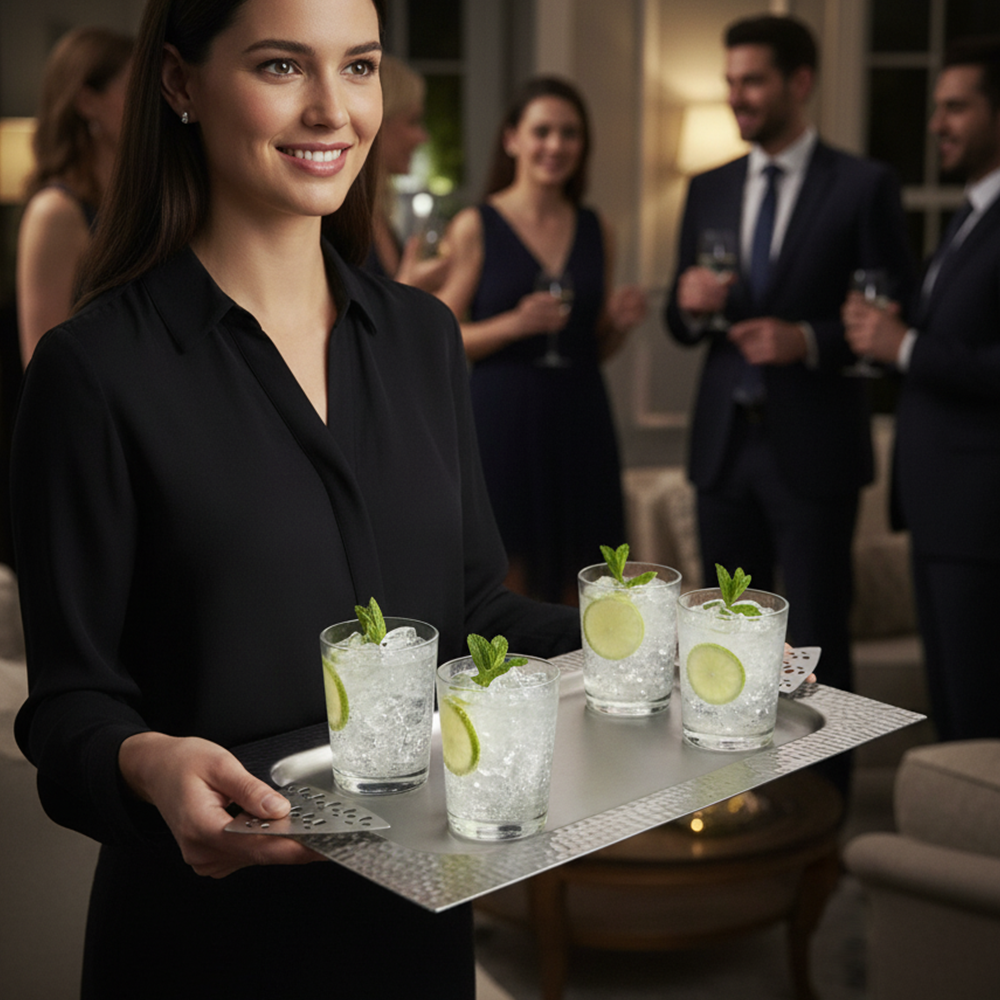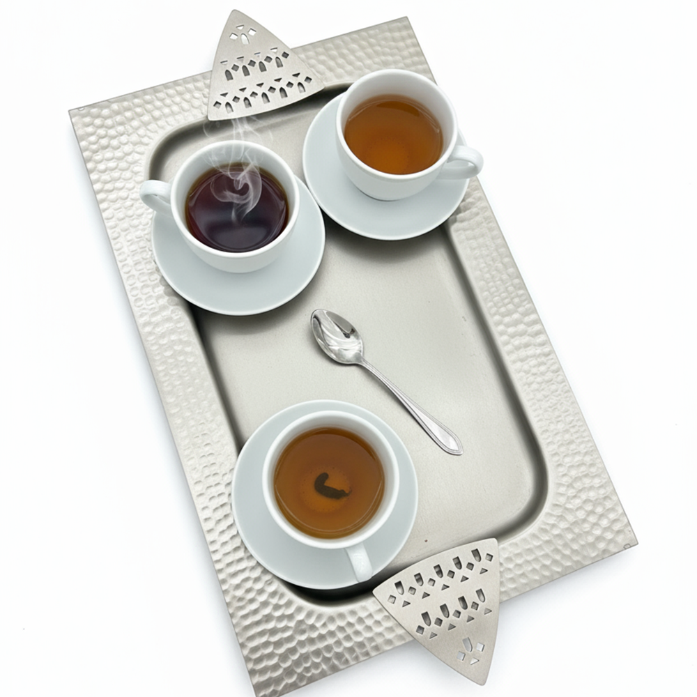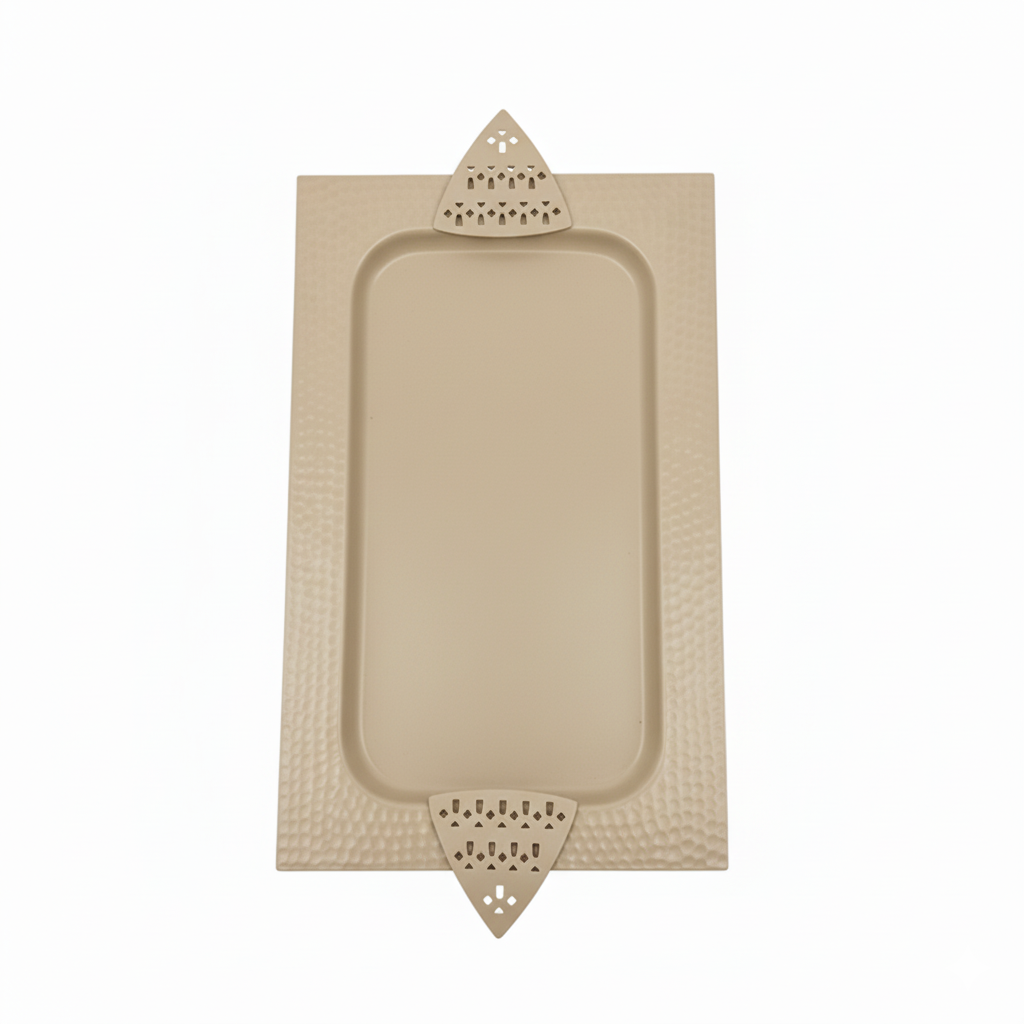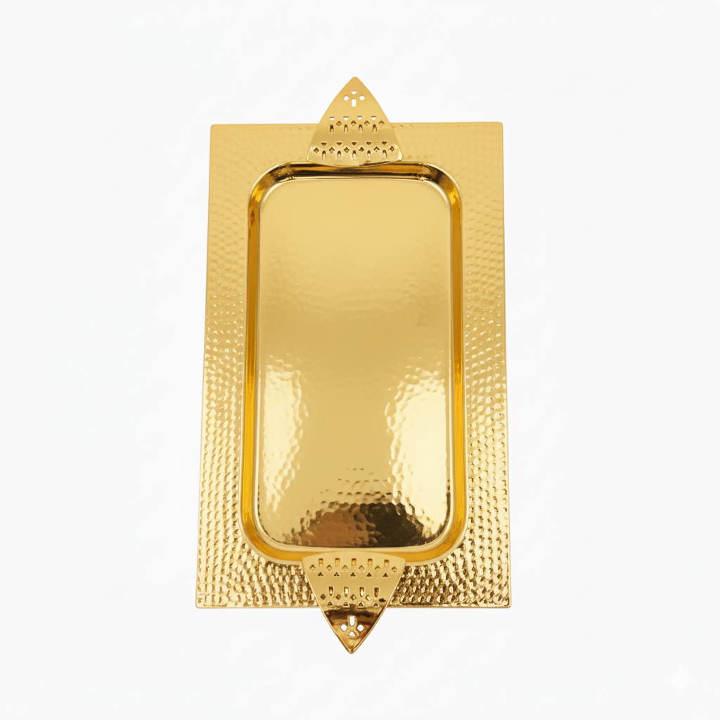 أضيفي لمسة من الفخامة والرقي إلى ضيافتك مع صينية التقديم المعدنية الفاخرة بتصميم مستطيل مميز (الطول 43 سم × العرض 23 سم).