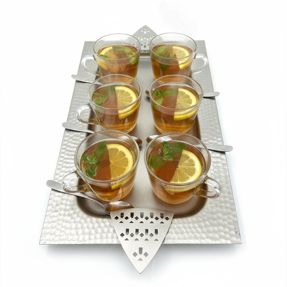 مصنوعة من معدن متين مقاوم للصدأ بلمسة فضية لامعة مع نقوش هندسية أنيقة عند الأطراف، تمنحها مظهرًا راقيًا يليق بكل مناسبة.