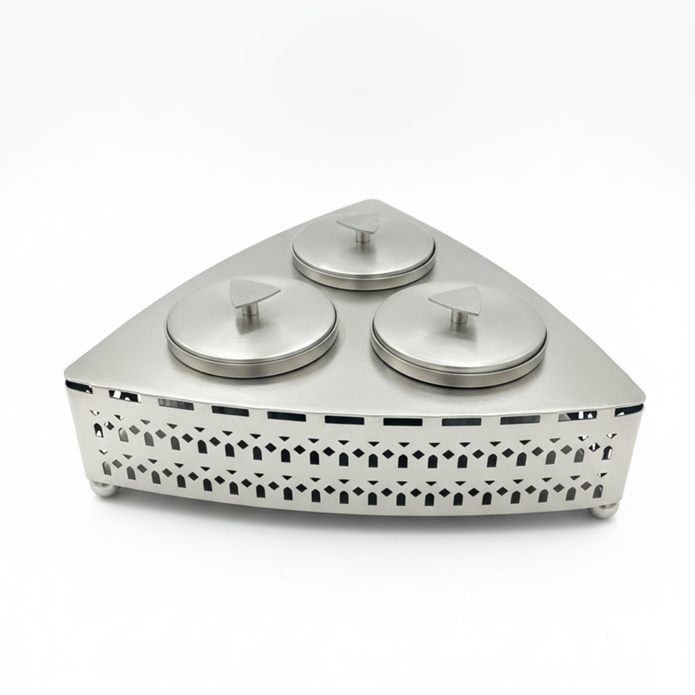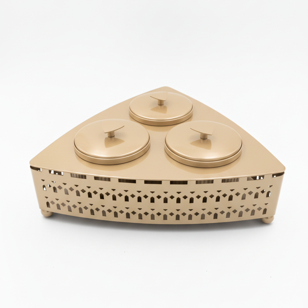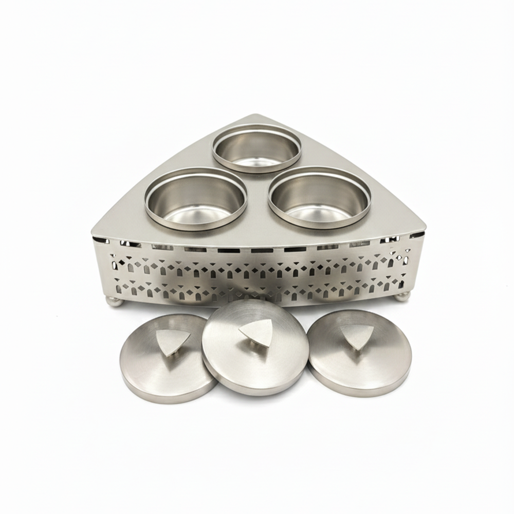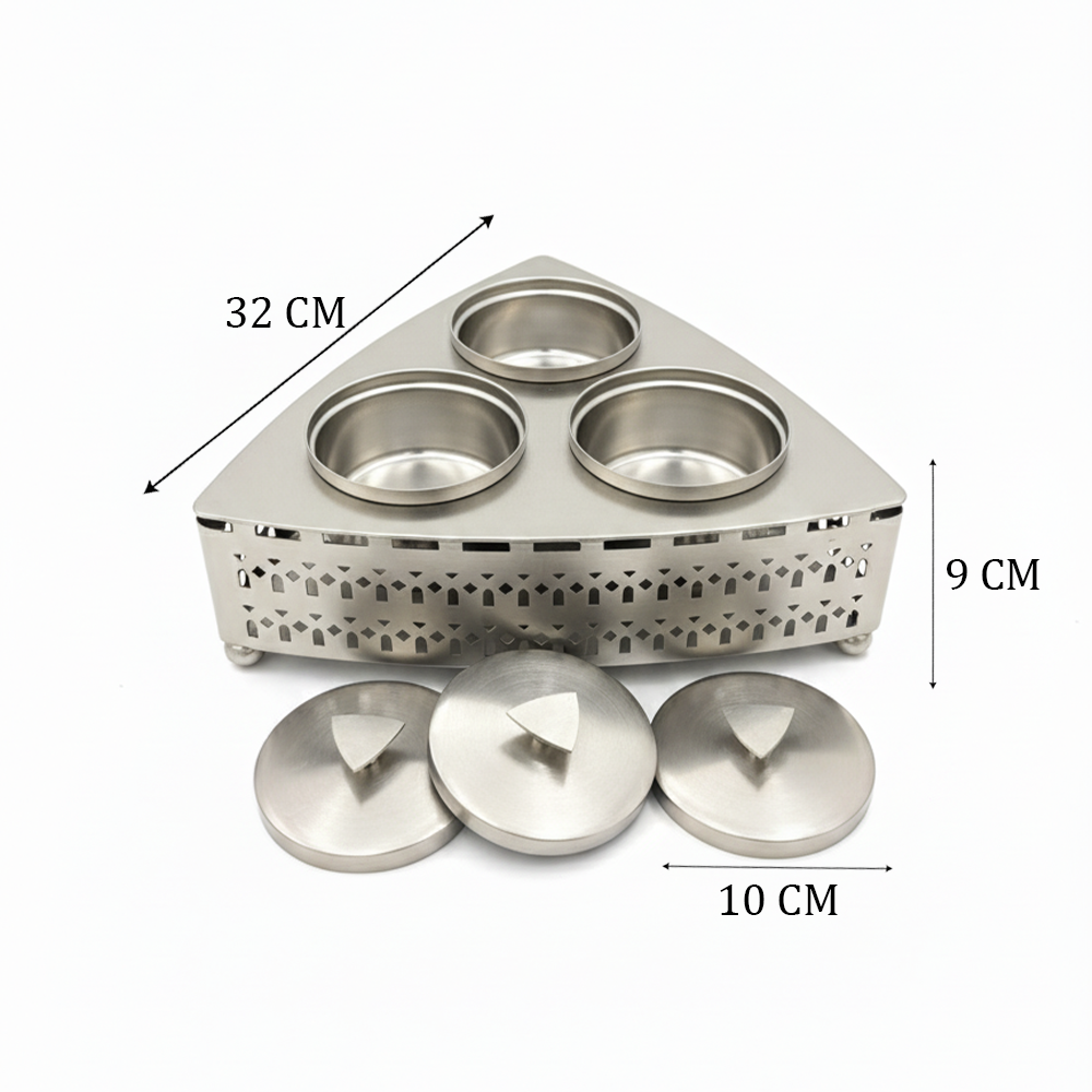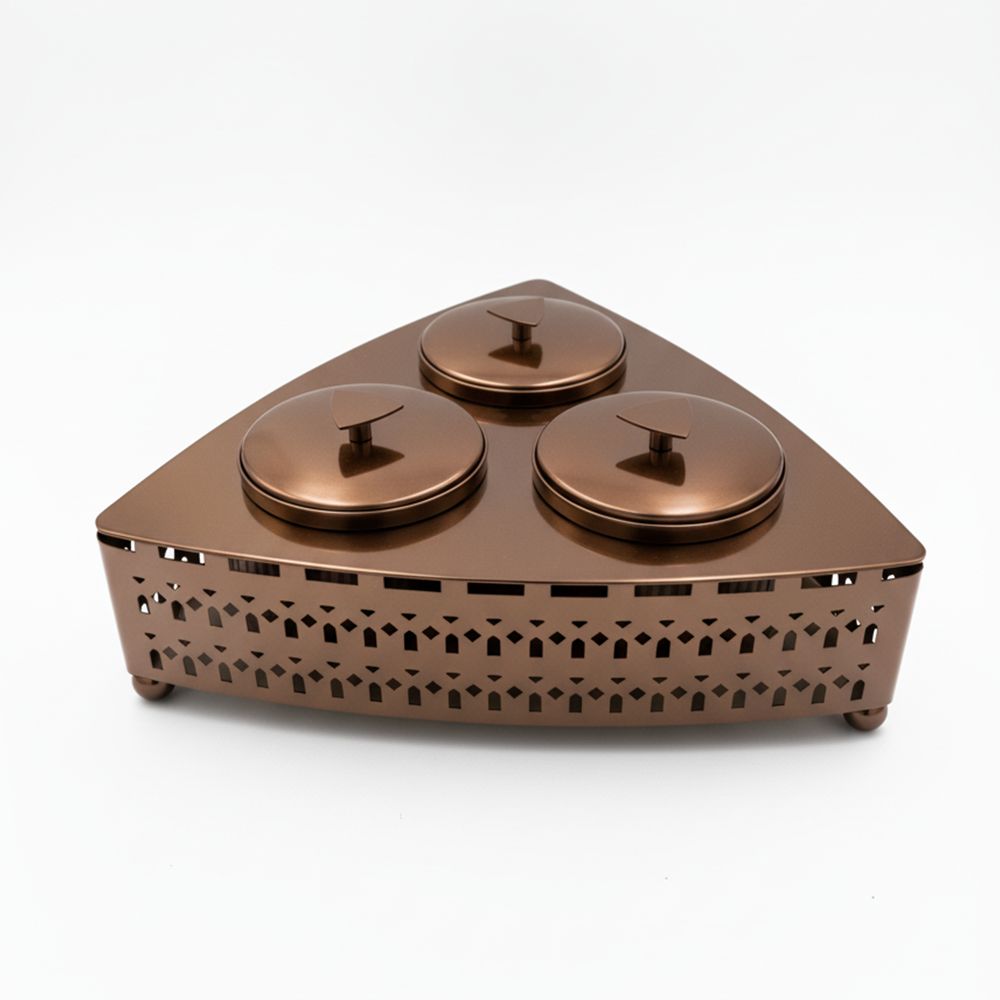 تتميز بثلاث أوعية دائرية مع أغطية معدنية أنيقة تحفظ الطعم والنكهة، ضمن قاعدة مثلثة التصميم بنقوش هندسية فاخرة تضيف لمسة جمالية لأي مجلس أو مائدة ضيافة.