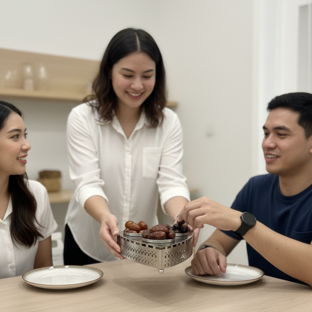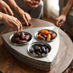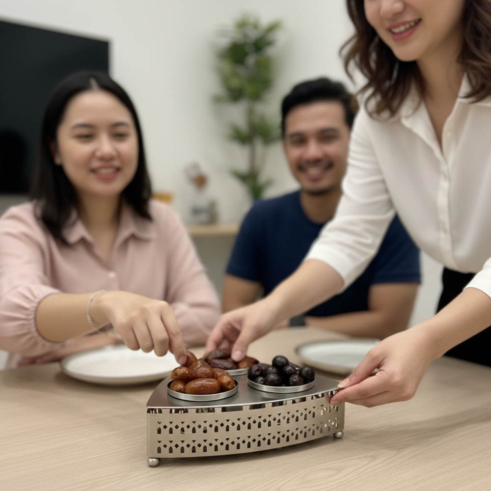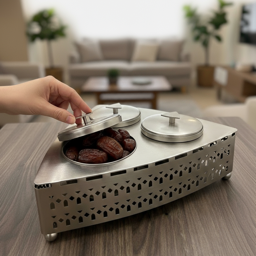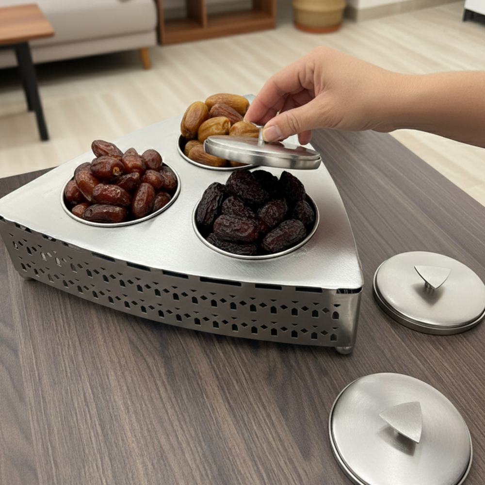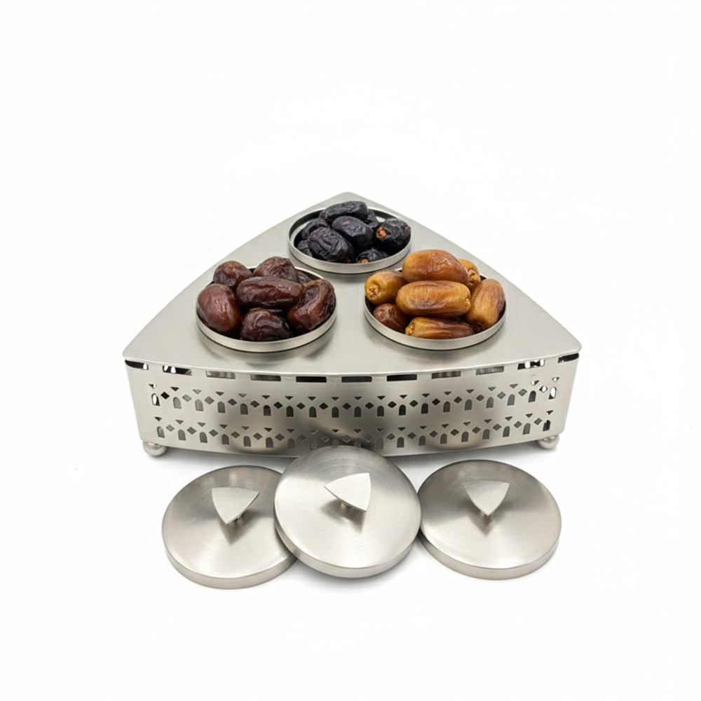 مصنوعة من معدن مقاوم للصدأ بلمسة فضية أنيقة تضمن المتانة وسهولة التنظيف. مثالية لتقديم التمور أو المكسرات أو الحلويات العربية في المناسبات الرسمية واليومية.