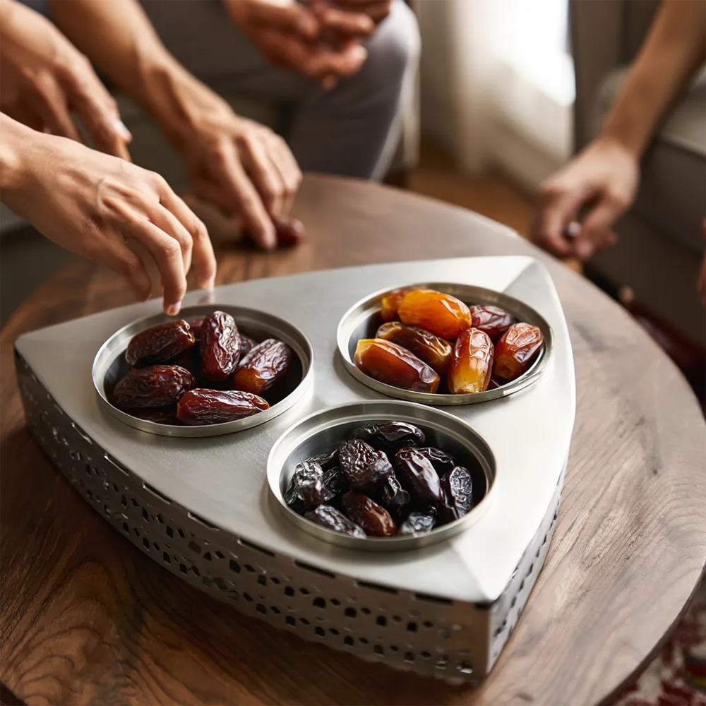 أبهري ضيوفك بتقديم التمور بأسلوب يجمع بين الفخامة والحداثة مع علبة التمر الثلاثية المعدنية ذات التصميم الهندسي الراقي.