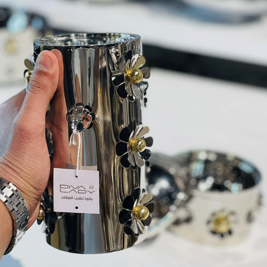 أضف لمسة من الفخامة إلى منزلك مع المبخرة المعدنية من ديفا ليدي، المصممة بعناية لتجمع بين الجمال والوظيفة في آنٍ واحد. تتميز هذه المبخرة بتصميمها العصري المصنوع من المعدن اللامع المزخرف بزهور معدنية أنيقة تضيف طابعًا راقيًا يناسب جميع الديكورات.