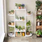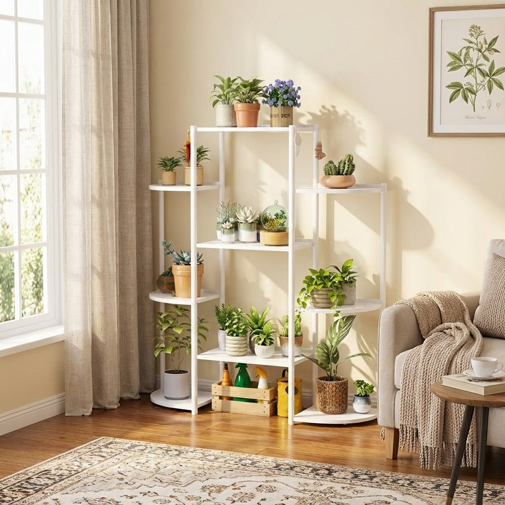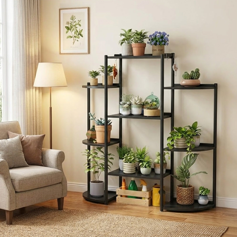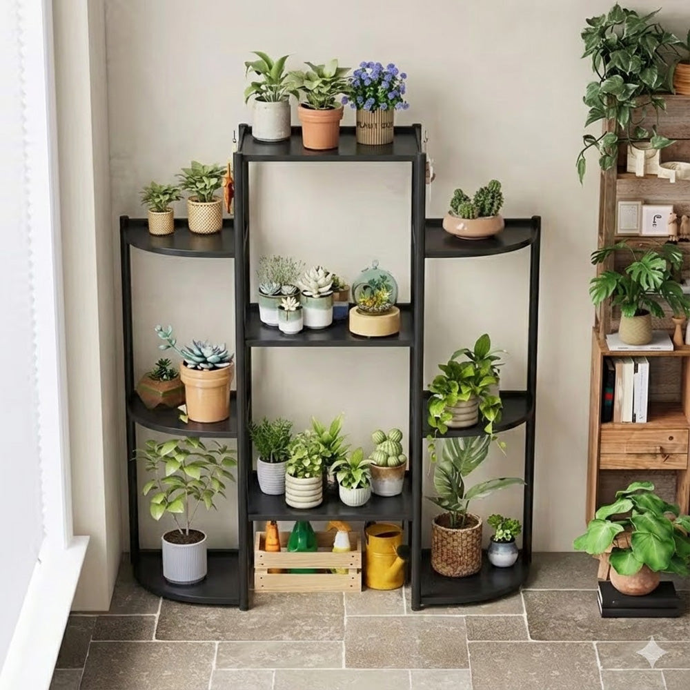 يتميز الحامل بستة صواني جانبية منحنية ونظام رفوف مركزي كبير، مما يوفر تصميمًا أنيقًا وعمليًا يناسب غرف المعيشة، والشرفات، والفناءات، والمساحات المكتبية. يساعد تصميم الصينية المُهوية على منع تراكم المياه، مما يعزز نمو النباتات بشكل صحي.