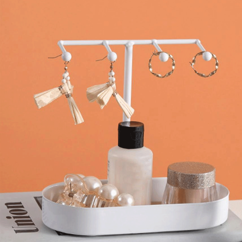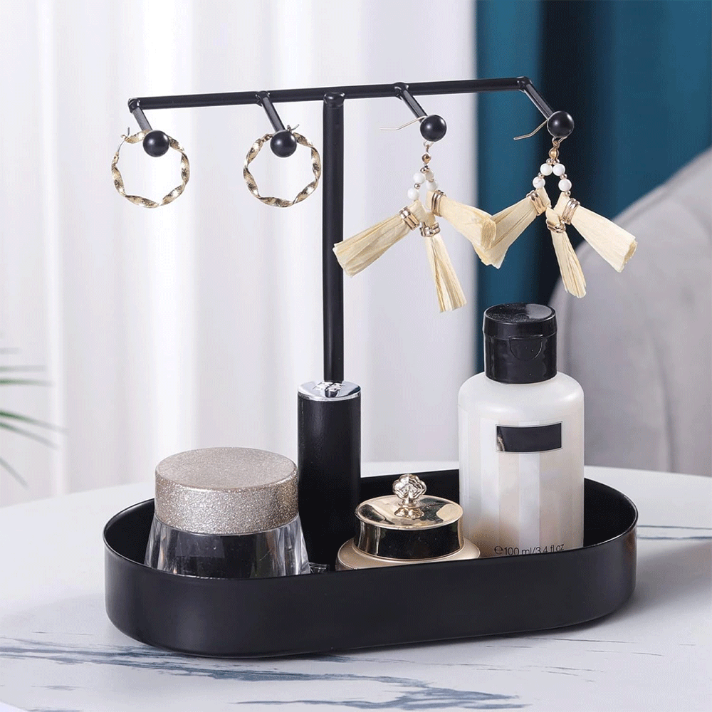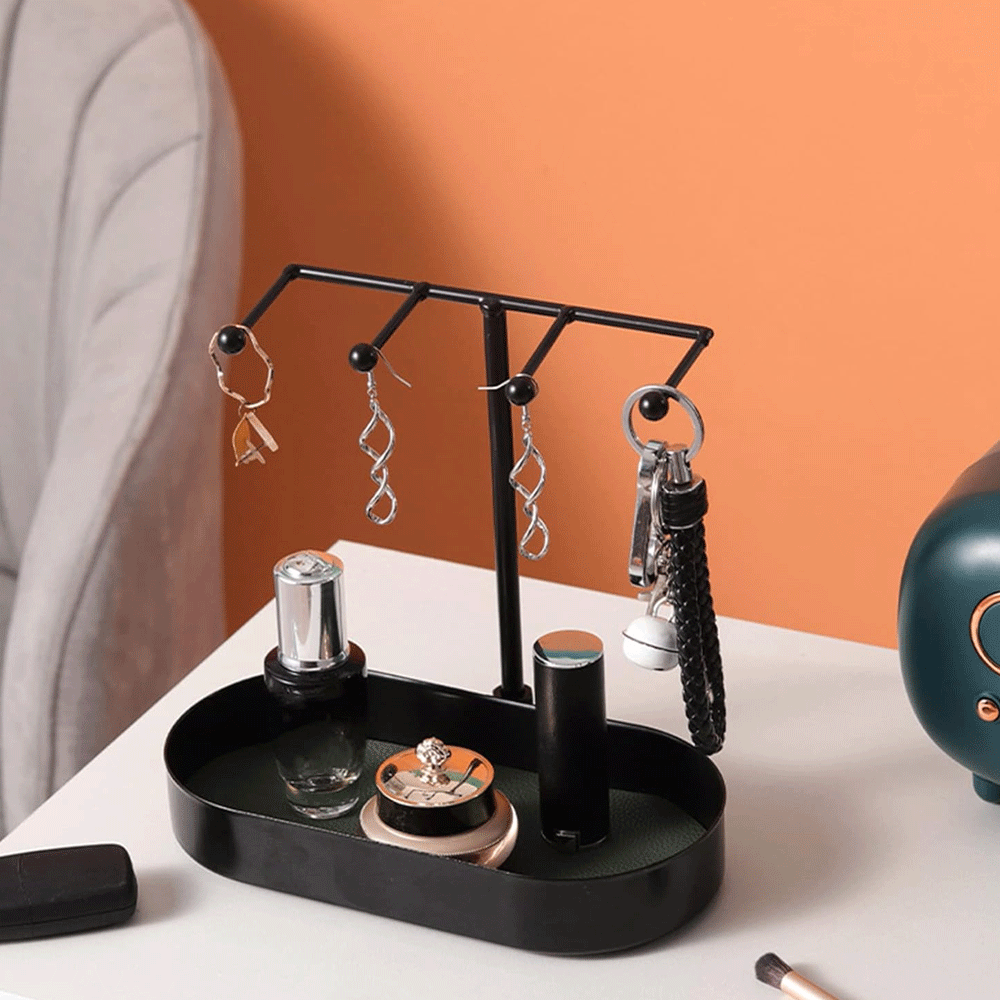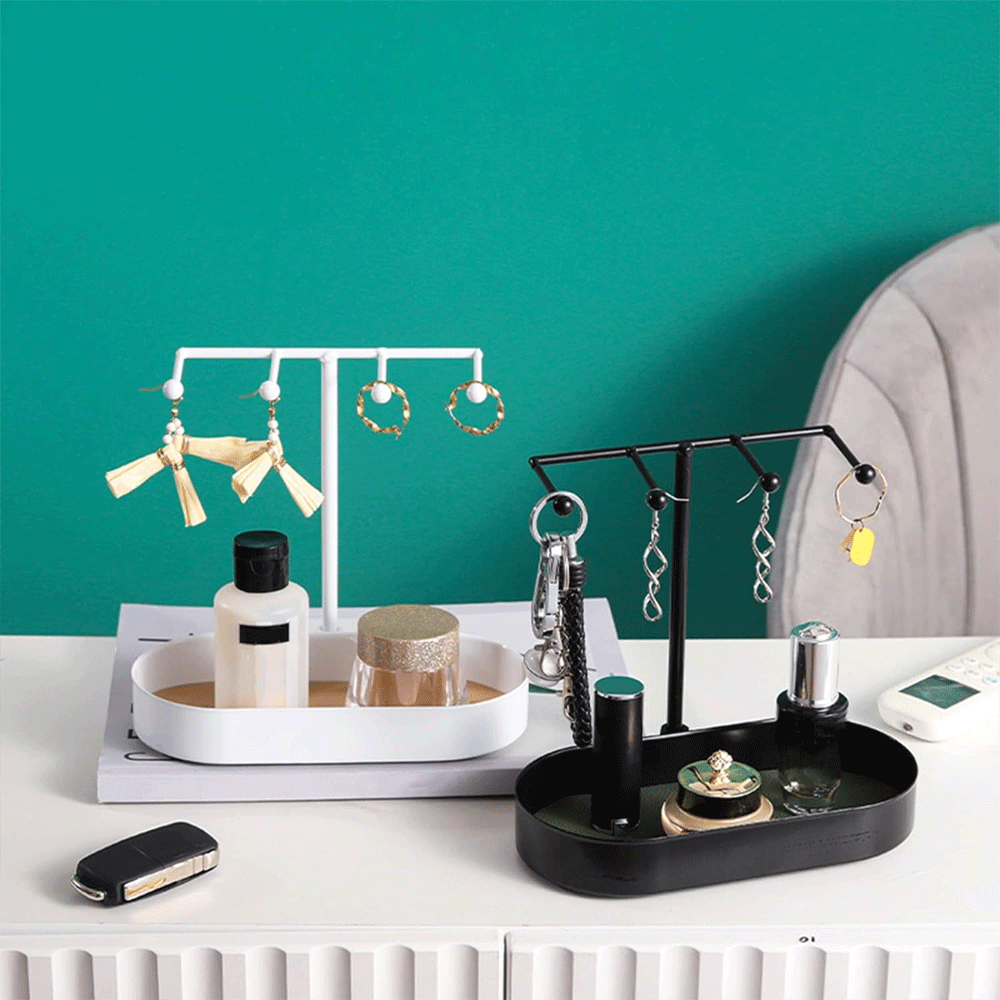 حامل منظم المجوهرات الصغير الحديث البسيط، حامل منظم المجوهرات، حامل القلادة، حامل المجوهرات الحديدي مع صينية للأقراط والقلائد والأساور والخواتم