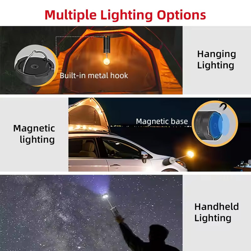 حامل ثلاثي مغناطيسي وتصميم فتحة تثبيت دبوس التثبيت: يمكن تثبيت الحوامل الثلاثية المغناطيسية القوية بشكل آمن على أي سطح معدني مثل السيارات. دبوس التثبيت المتضمن يجعل من السهل تأمين مصباح التخييم على الأرض حسب الحاجة، وهو مناسب تمامًا للخارج.
