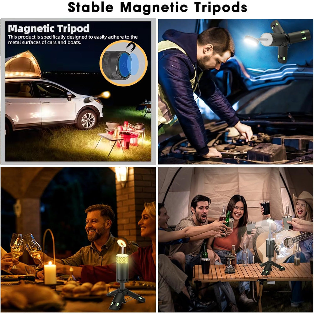 مصباح تخييم خارجي محمول قابل لإعادة الشحن مع بطارية 10000 مللي أمبير في الساعة وحامل ثلاثي مغناطيسي مدمج مقاوم للماء IPX65 مصباح تخييم LED مع وضع SOS للطوارئ