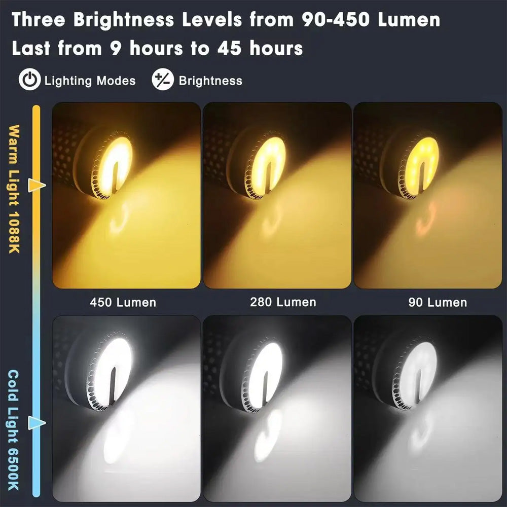 3 أوضاع إضاءة قابلة للتعديل ورأس ضوء دوار: تم تصميم مصباح التخييم LED القابل للطي المحمول هذا في 3 مستويات سطوع مع وظيفة ذاكرة درجة حرارة اللون، ودرجة حرارة اللون المتدرجة من 1800 كلفن إلى 6500 كلفن، وضوء دافئ/بارد حسب الرغبة، مما يتيح لك تخصيص نطاق الإضاءة الخاص بك بسهولة ليناسب أي موقف.