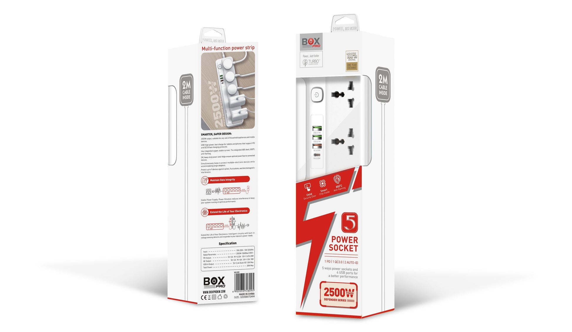 اجعل شحن أجهزتك أسهل وأكثر أمانًا مع بوكس برو BSL3305، شريط الطاقة المتكامل الذي يجمع بين الأداء العالي والتصميم الذكي. يتميز بخمسة مقابس تيار متناوبة، منفذ PD بقدرة 20 واط للشحن السريع، و3 منافذ USB لشحن متعدد في وقت واحد.