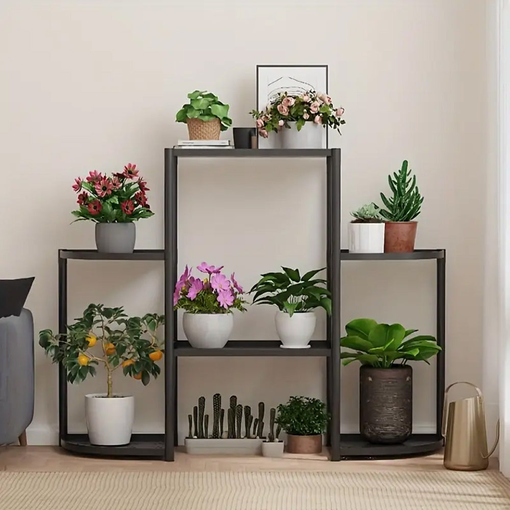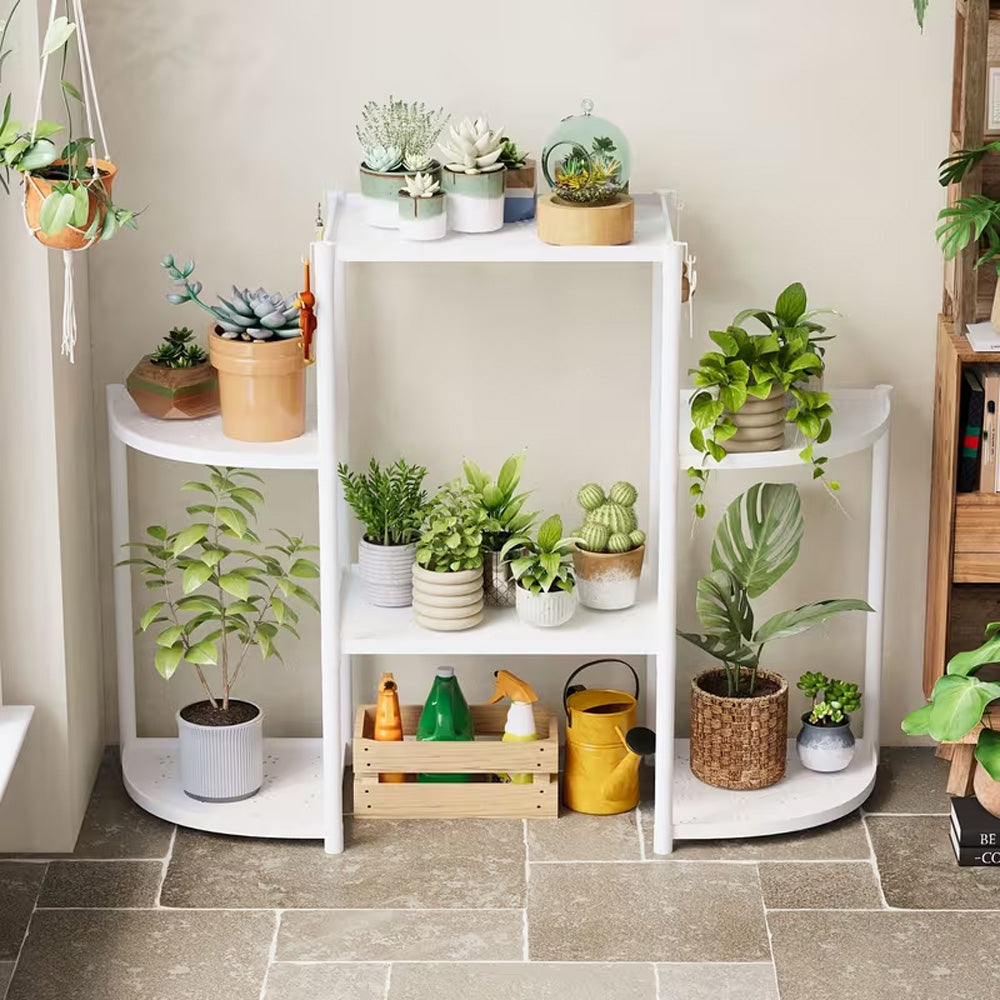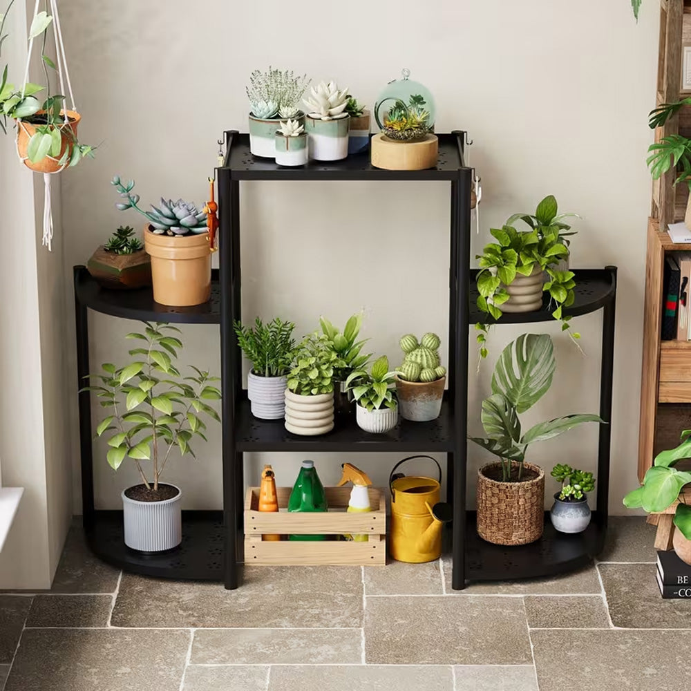 حسّن مساحة عرض نباتاتك مع حامل النباتات الداخلي متعدد الطبقات هذا، المصنوع من إطار فولاذي متين وصواني بلاستيكية عالية الجودة لضمان أقصى قدر من الثبات والأداء طويل الأمد. يتضمن التصميم رفًا مركزيًا كبيرًا بثلاثة مستويات وصينيتين جانبيتين أنيقتين على شكل هلال، بعرض إجمالي يبلغ 99 سم لترتيب النباتات بأحجام مختلفة.