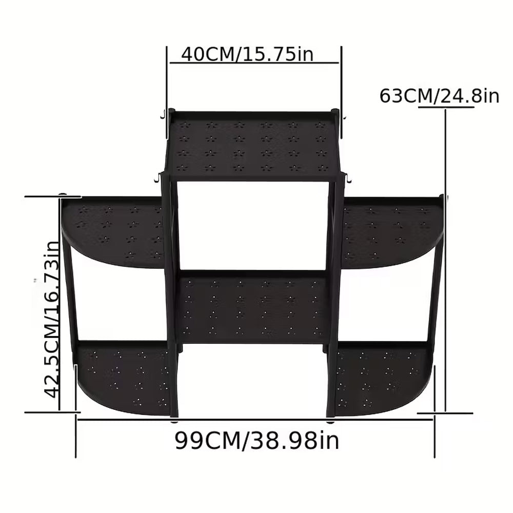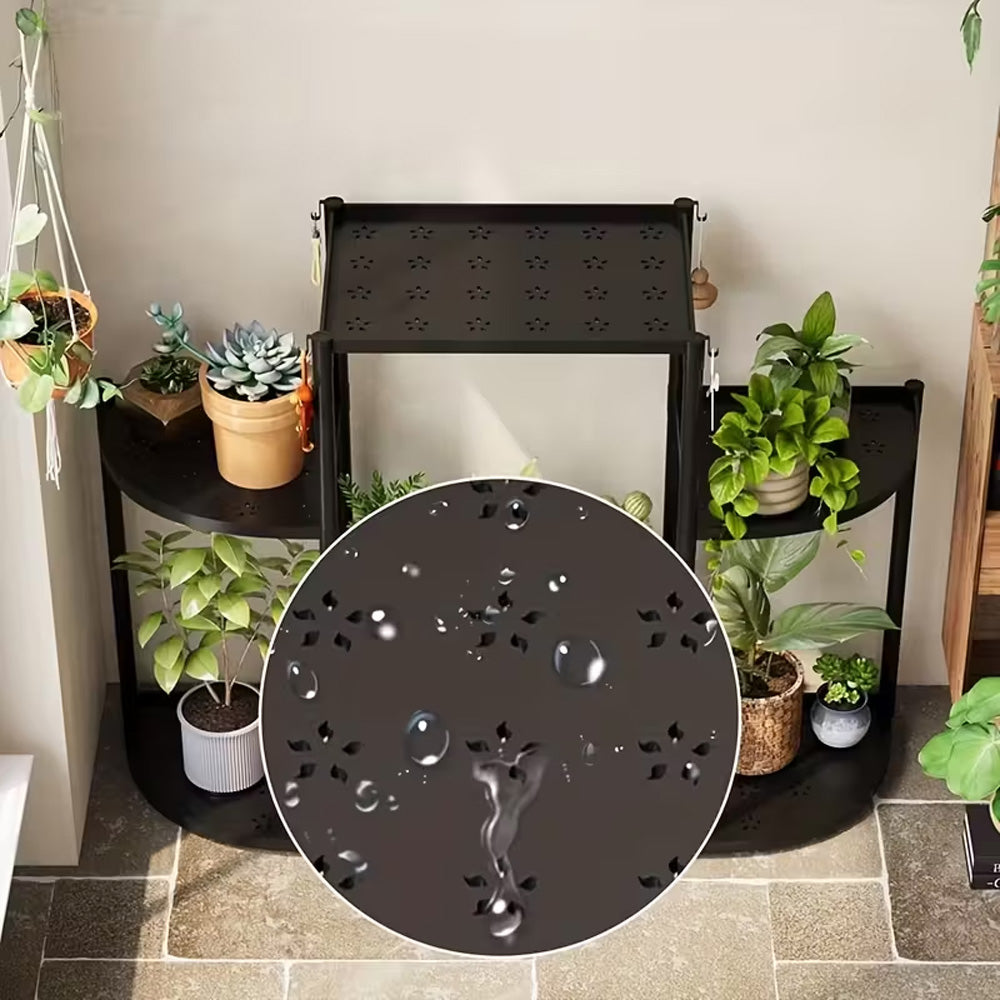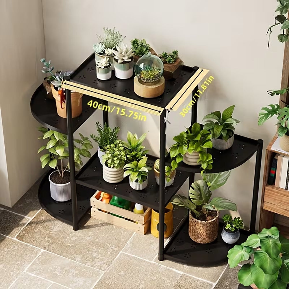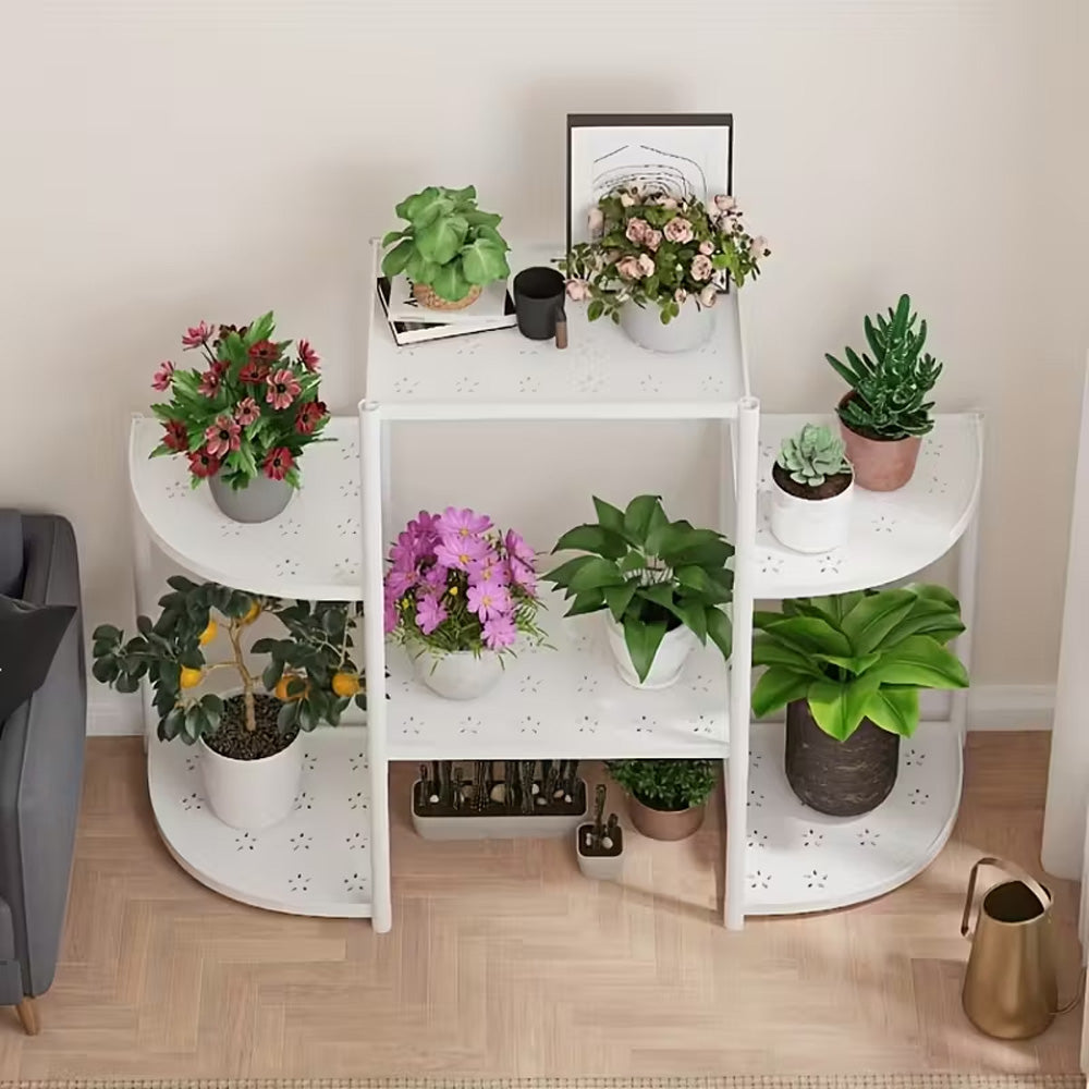 حسّن مساحة عرض نباتاتك مع حامل النباتات الداخلي متعدد الطبقات هذا، المصنوع من إطار فولاذي متين وصواني بلاستيكية عالية الجودة لضمان أقصى قدر من الثبات والأداء طويل الأمد. يتضمن التصميم رفًا مركزيًا كبيرًا بثلاثة مستويات وصينيتين جانبيتين أنيقتين على شكل هلال، بعرض إجمالي يبلغ 99 سم لترتيب النباتات بأحجام مختلفة.