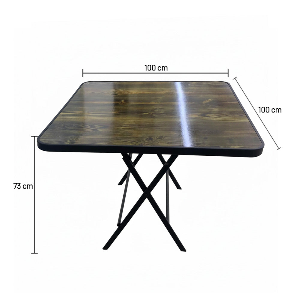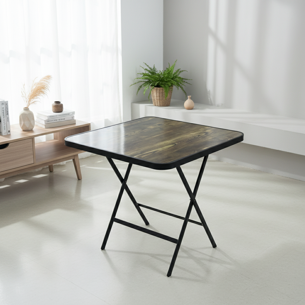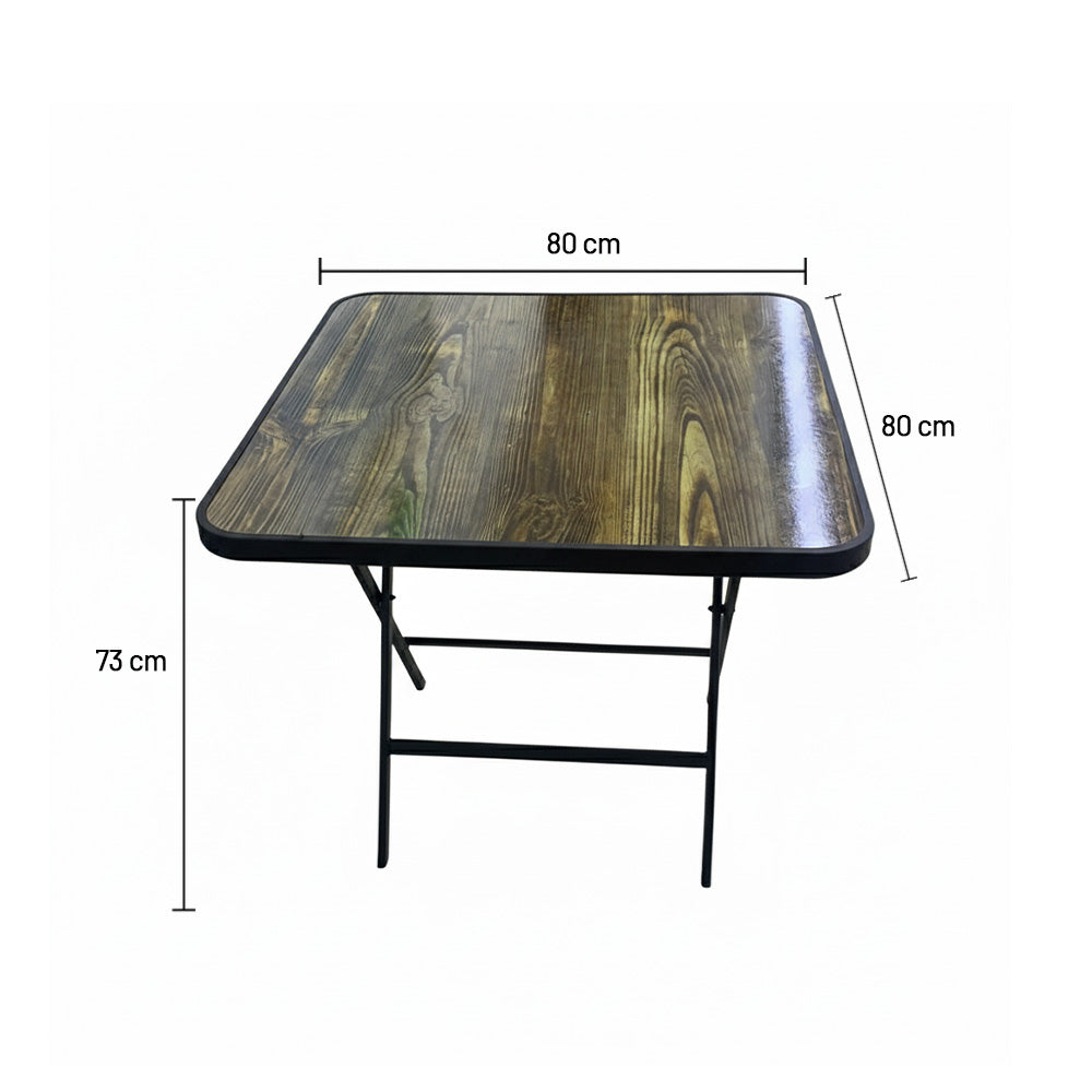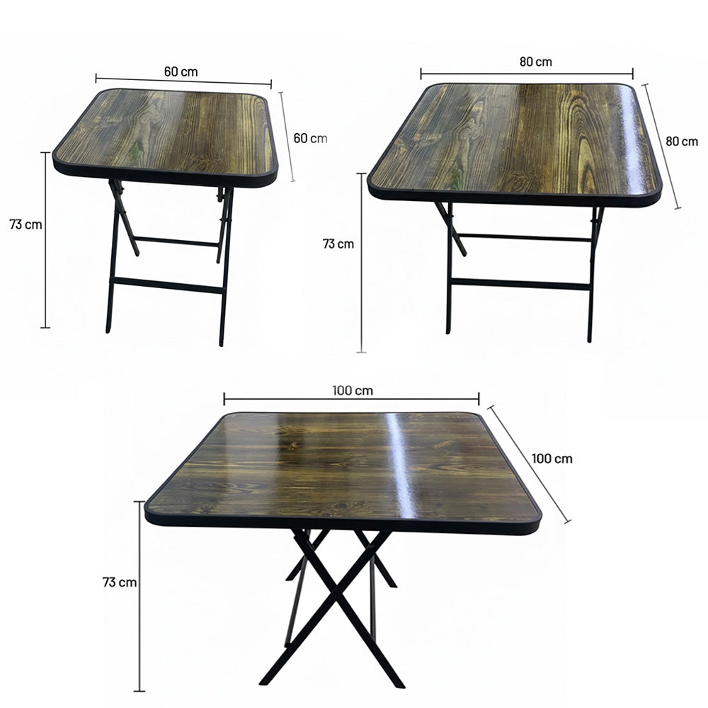 طاولة متينة قابلة للطي، بسطح خشبي وإطار معدني. متوفرة بأحجام 60 سم، 80 سم، و100 سم، مثالية لتناول الطعام، والدراسة، والعمل، والتجمعات المنزلية.