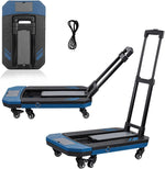 عربة نقل أمتعة يدوية قابلة للطي وشديدة التحمل بمنصة متينة قابلة للتوسيع بسعة حمل قصوى 150 كيلوجرام مع 6 عجلات دوارة صامتة ومقبض تلسكوبي وصندوق تخزين وحبل مرن للمكتب والتسوق والسفر وتوصيل البضائع