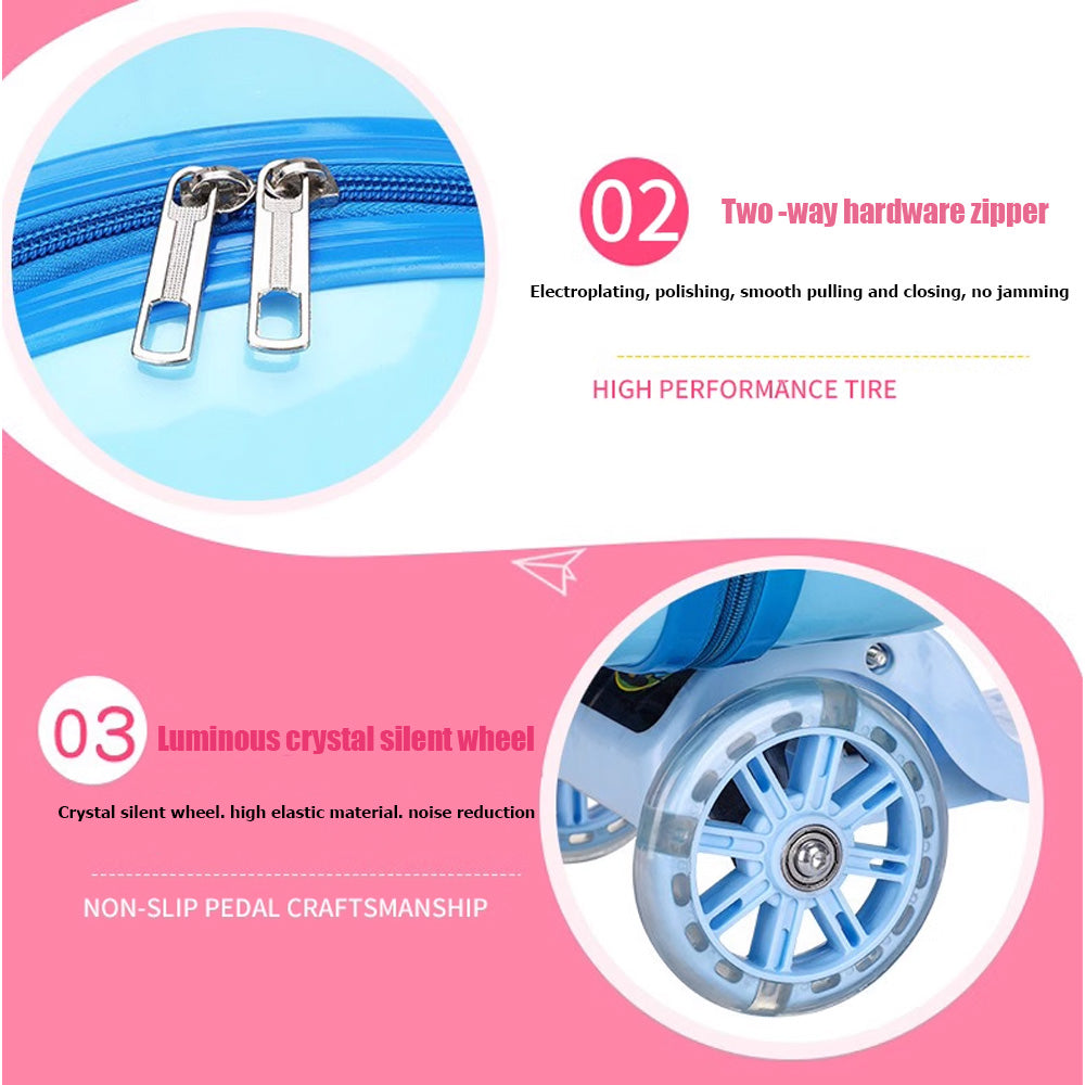 يتميز السكوتر بصندوق حقيبة واسع يوفر مساحة كافية لتخزين الأدوات المدرسية، الألعاب أو مستلزمات السفر. مثالي للذهاب إلى المدرسة، النزهات الخارجية أو الرحلات العائلية، ويجمع بين المرح والفائدة. -