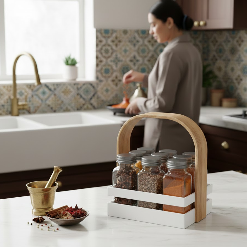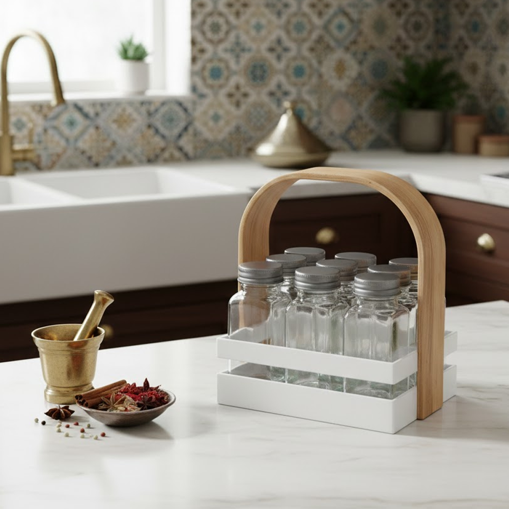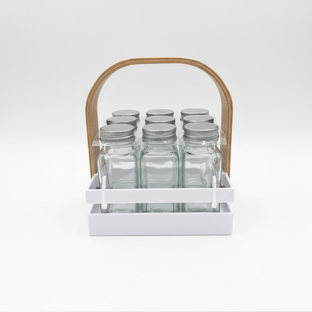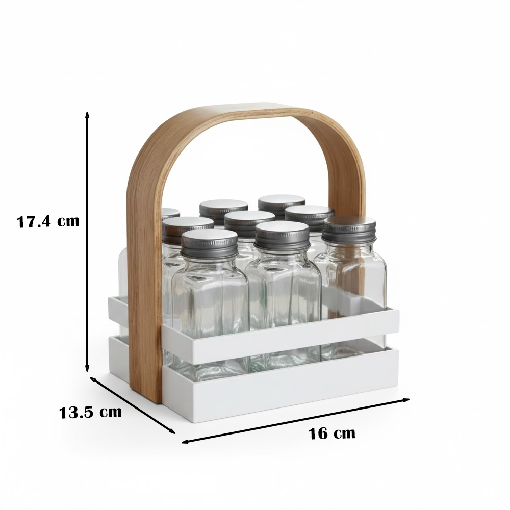 أضف لمسة من الأناقة والتنظيم إلى مطبخك مع حامل التوابل العصري المصمم بعناية ليجمع بين الجمال والعملية. يتميز الحامل بتصميم أنيق مع مقبض خشبي مريح يسهل الحمل والنقل، بالإضافة إلى عبوات زجاجية شفافة تتيح رؤية المحتوى بسهولة.