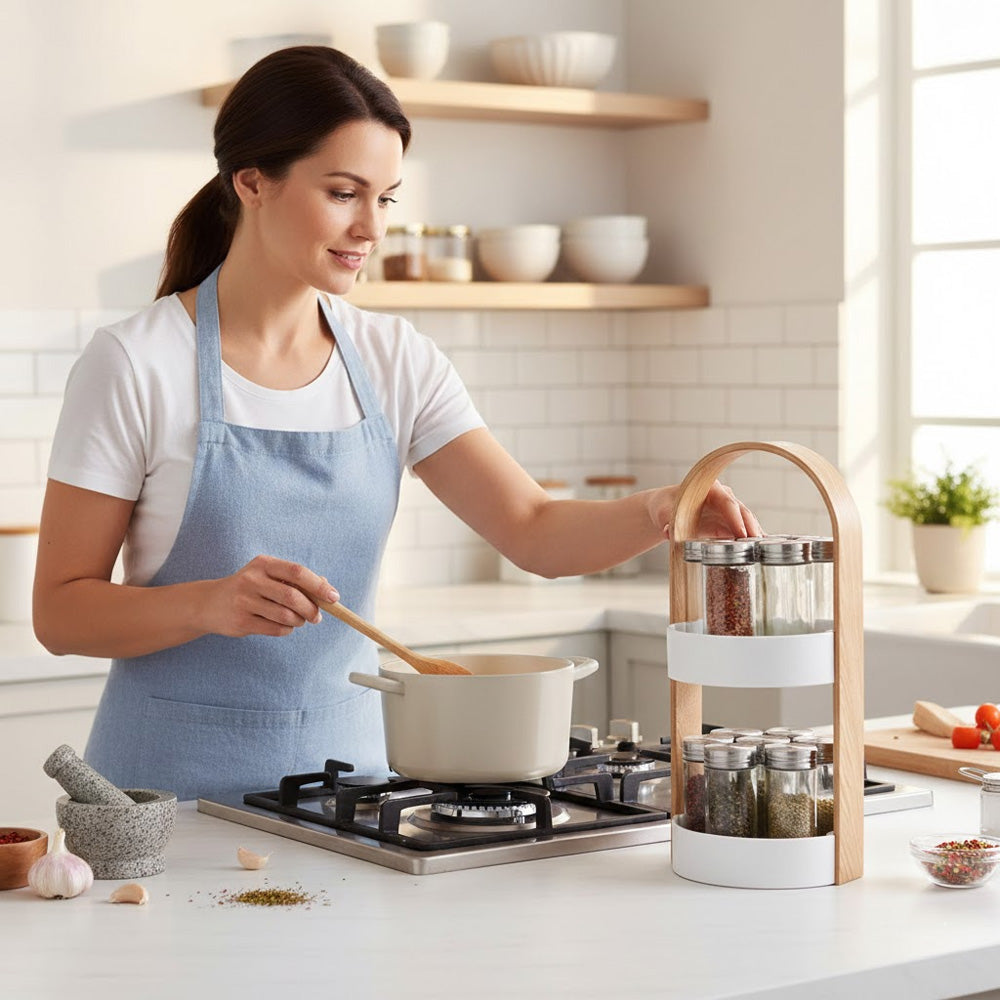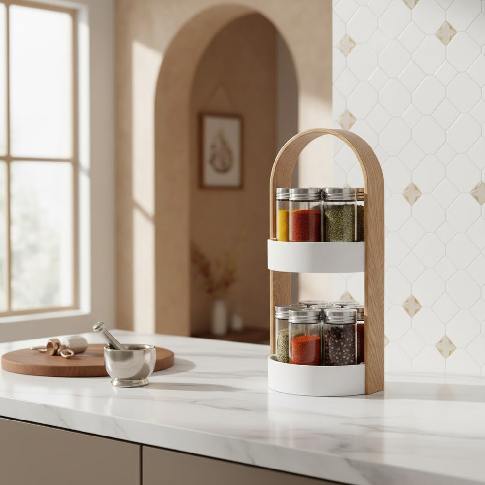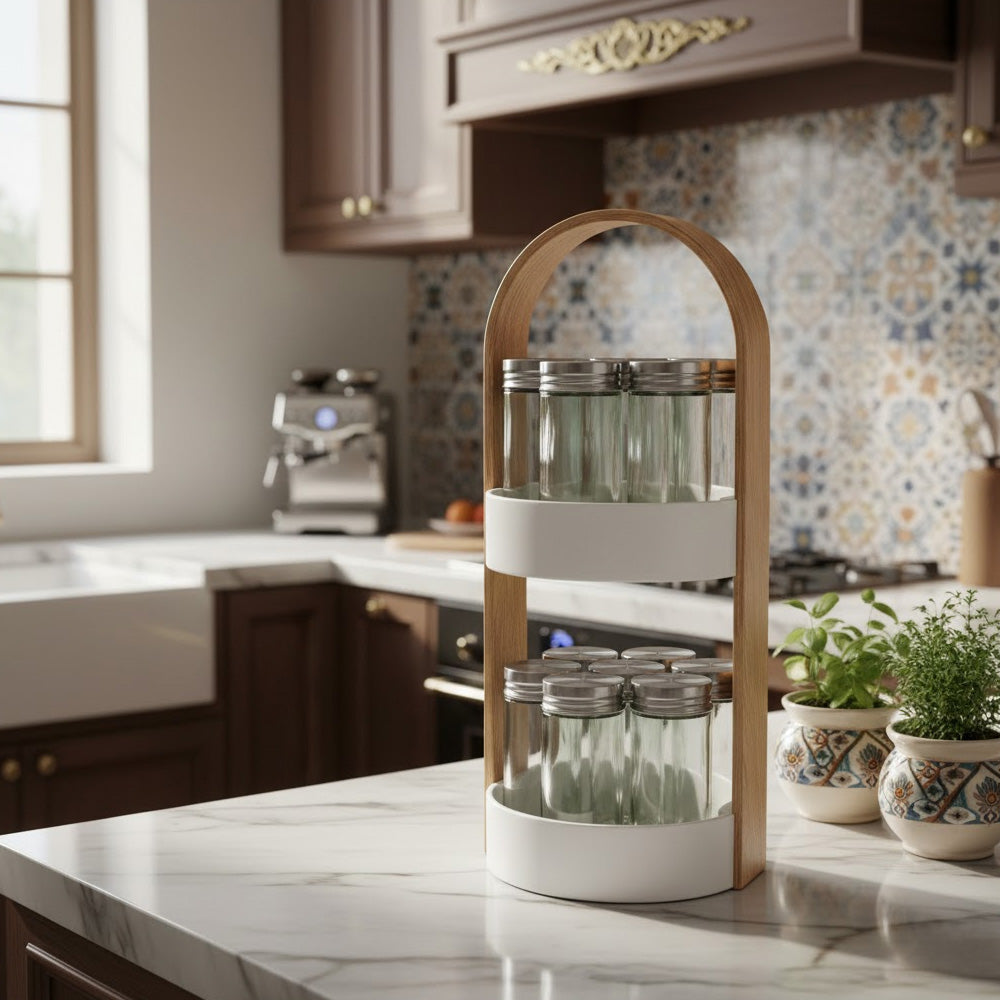 يضفي تصميمه الأنيق والعصري لمسة من الرقي على مطبخك، بينما تتيح لك المرطبانات الشفافة التعرف على التوابل بسهولة. سواء كنت طاهيًا محترفًا أو هاويًا للطبخ.
