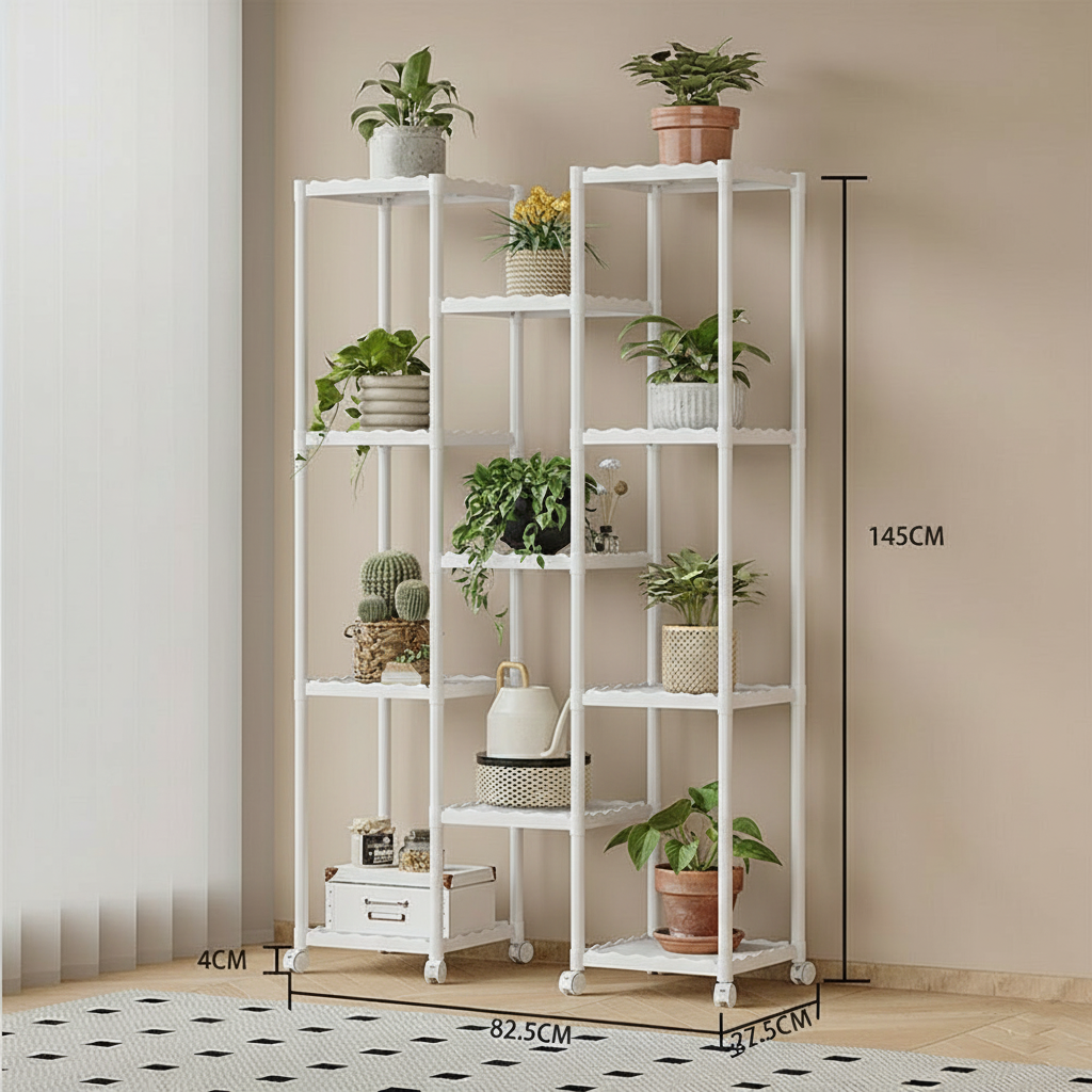 حامل نباتات أنيق ومتين متعدد الطبقات، بارتفاع ١٤٥ سم، مصمم بعجلات متحركة وأرفف متعددة الطبقات لتنظيم نباتاتك الداخلية بشكل أنيق. مثالي لغرف المعيشة والشرفات وزوايا الحدائق.
