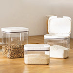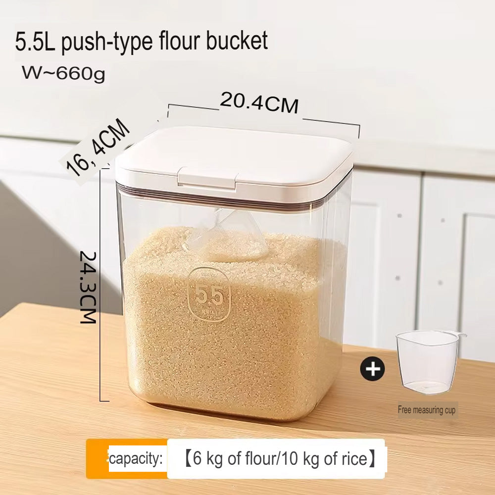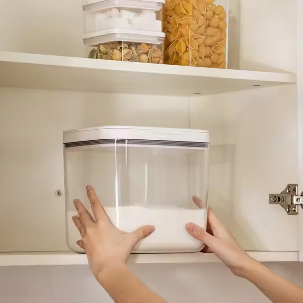 حافظ على نضارة أطعمتك الجافة مع هذه الحاوية المُحكمة الإغلاق التي تُفتح بالضغط. مصنوعة من مادة متينة وشفافة مزودة بحلقة إغلاق سميكة، وهي مثالية لتخزين الأرز والدقيق والحبوب والمعكرونة وغيرها. يُسهّل الغطاء الذي يُفتح بالضغط بإصبع واحد عملية الفتح، بينما يُضفي كوب القياس المُرفق مزيدًا من الراحة. متوفرة بسعات 2.8 لتر، 4.5 لتر، و5.5 لتر.