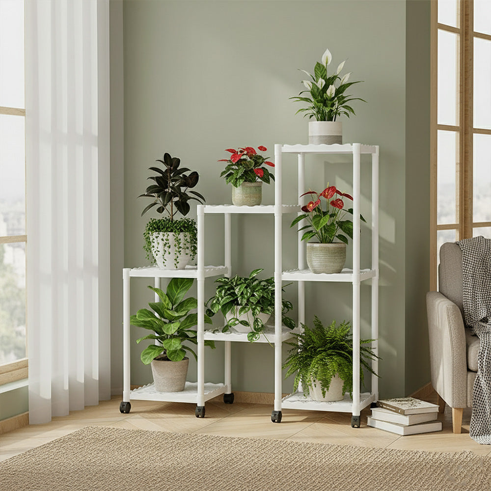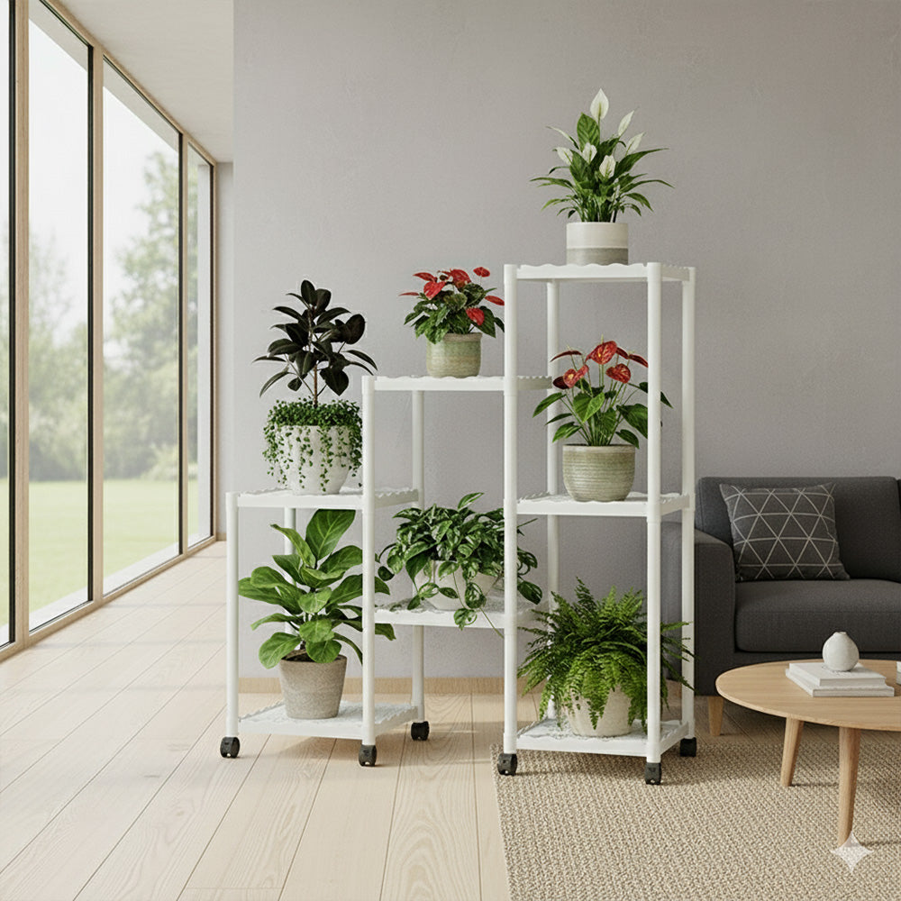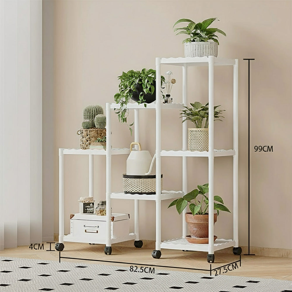 بتصميمه الأنيق على شكل درج، يُضفي هذا الرف توازنًا بصريًا وأناقة على أي غرفة، مثالي لغرف المعيشة والشرفات والمطابخ والمكاتب. عجلاته الأربع المتحركة بسلاسة تُسهّل تحريكه، بينما يضمن هيكله المتين ثباته ومتانته.