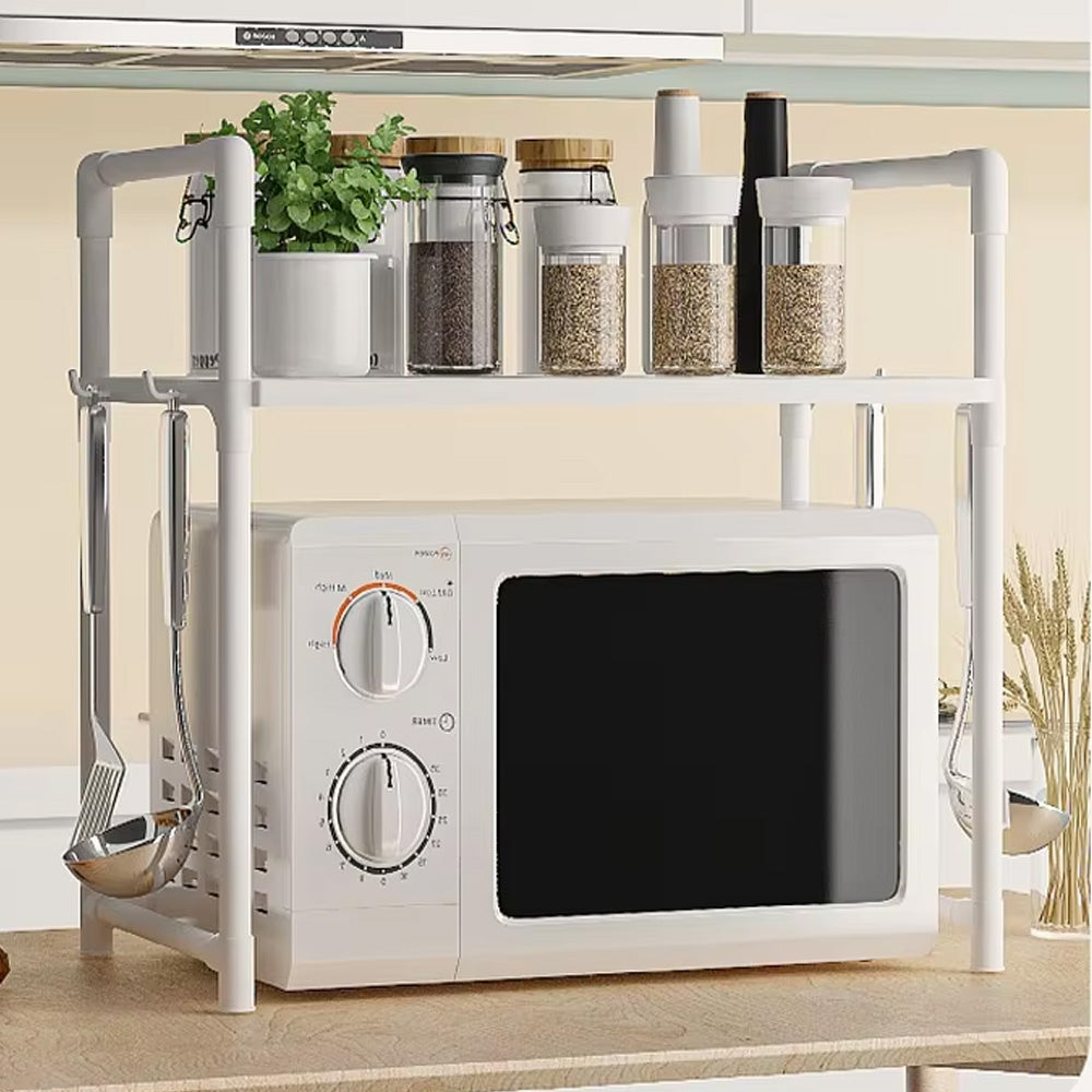رف تخزين موفر للمساحة للميكروويف، مزود بأرفف متينة وخطافات جانبية للأواني. متوفر بتصميمين من طابق واحد وطابقين، يُساعد على تنظيم التوابل والبرطمانات وأدوات المطبخ، مع توفير مساحة على سطح العمل.