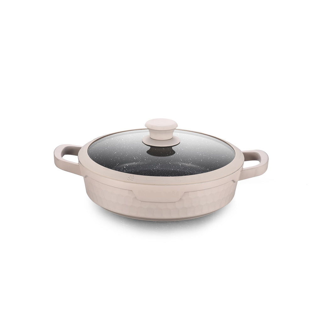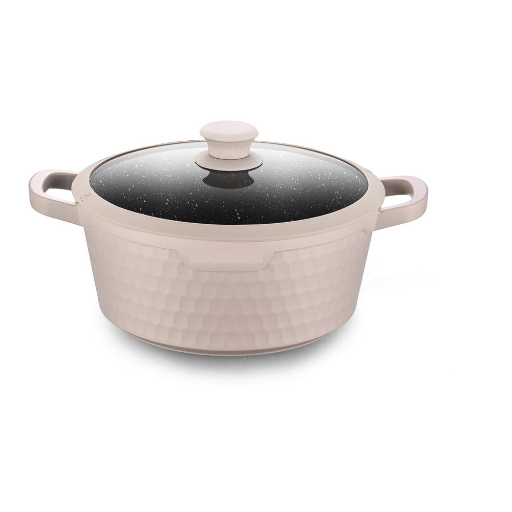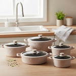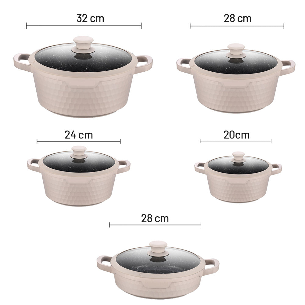 حسّن مطبخك مع طقم أواني الطهي الجرانيتية الفاخر غير اللاصق والأنيق هذا، المصمم للطهي اليومي بنتائج احترافية. يتميز هذا الطقم بهيكل خارجي بيج أنيق مطروق وطبقة داخلية متينة غير لاصقة مطلية بالجرانيت، مما يضمن توزيعًا متساويًا للحرارة، وإخراجًا سلسًا للطعام، وسهولة في التنظيف.