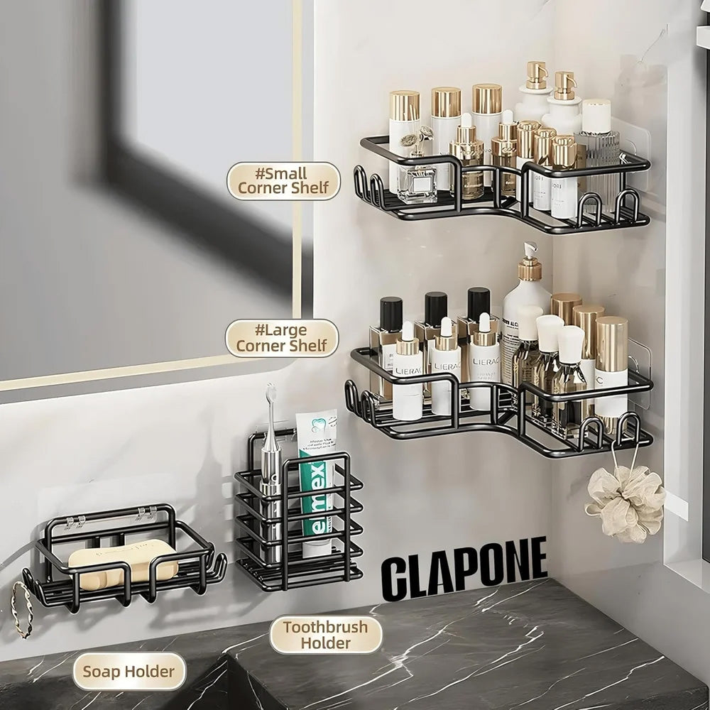 يتضمن الطقم رفين زاوية، وحامل صابون، وحامل فرشاة أسنان، مما يجعله الحل الأمثل لتخزين مستحضرات العناية بالبشرة، ومستحضرات التجميل، والمستلزمات اليومية.
