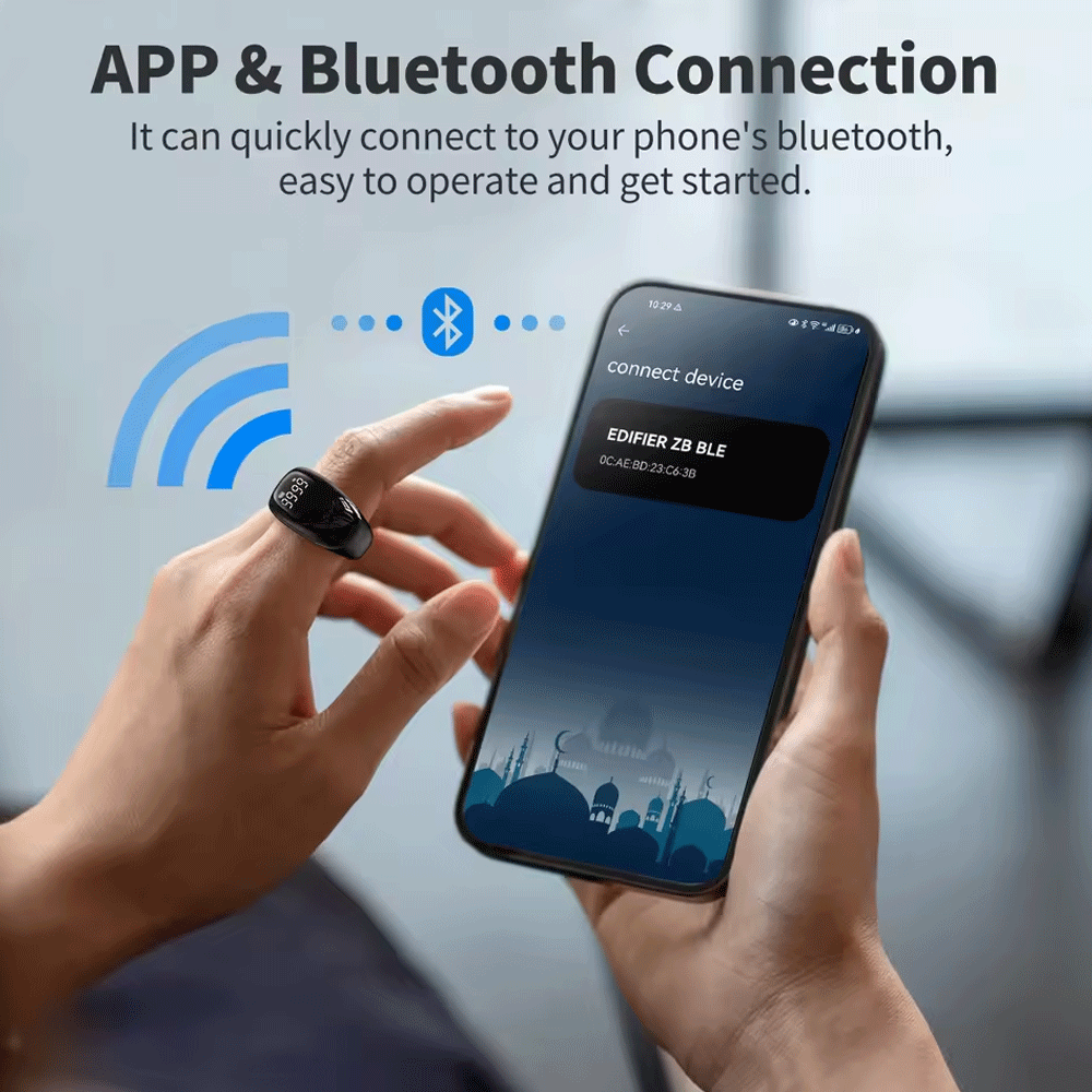 استخدم هاتفك الذكي لمسح الأشعة السينية المسبقة إلى Google Play أو App Store لتنزيل E-Zikr. أدخل إلى واجهة إضافة الجهاز وحدد "حلقة الذكر". تحديد الجهاز الذي تريد توصيله عبر البلوتوث. أكمل ربط حلقة الذكر.