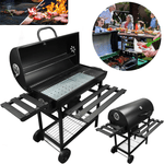 عربة شواء مدخنة من الفولاذ الأسود مع شواية فحم خارجية وحساس الحرارة مع عجلات ورفوف