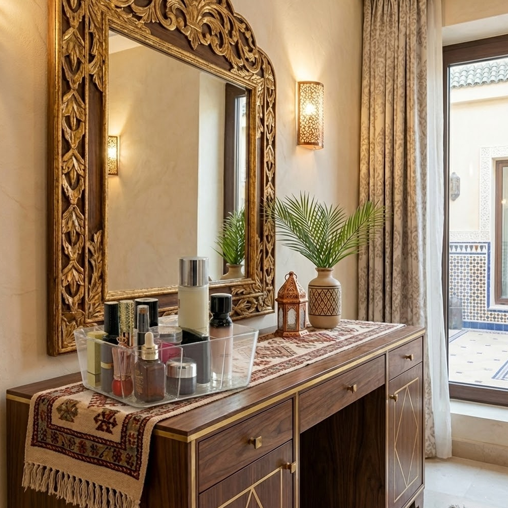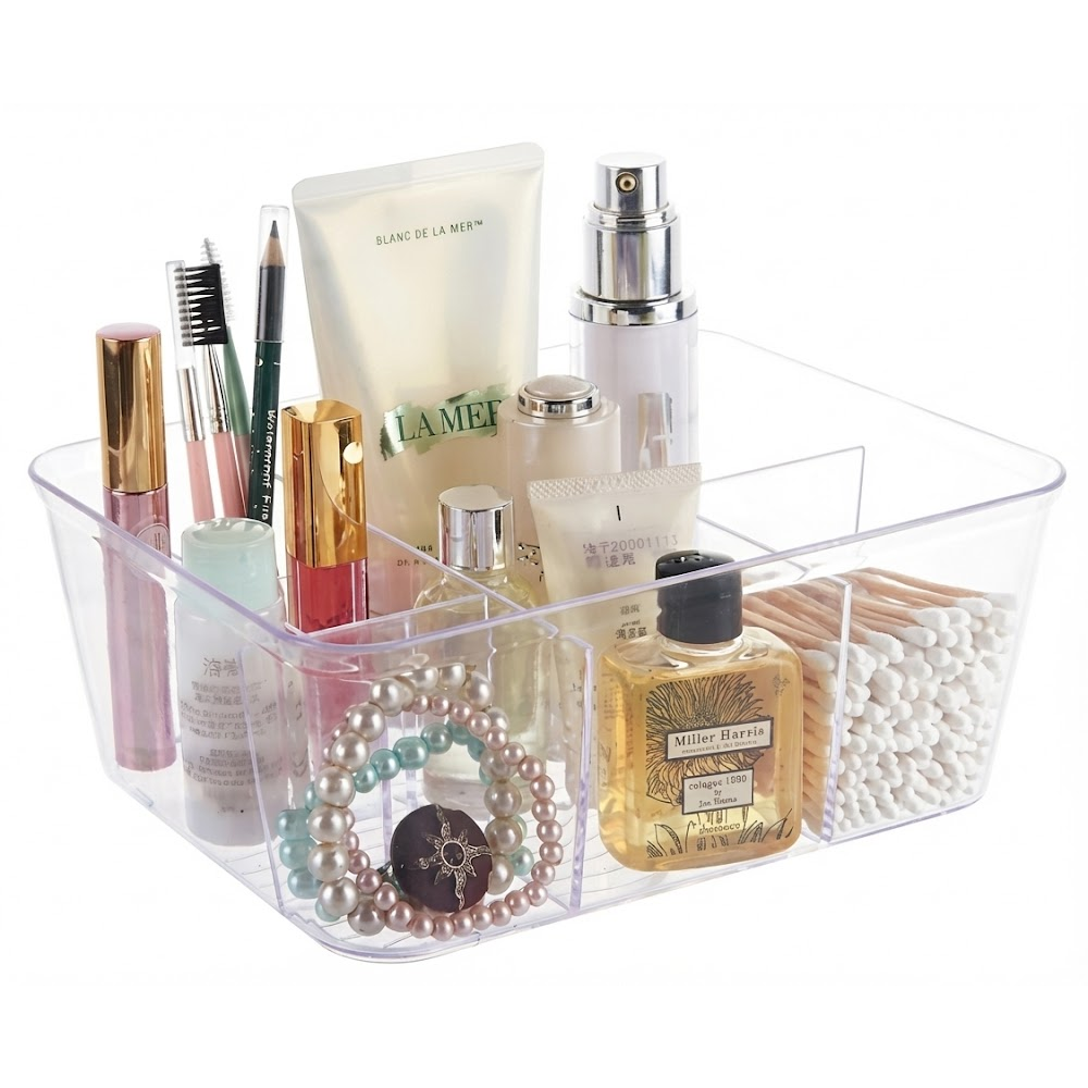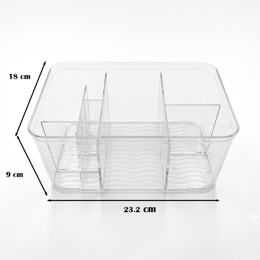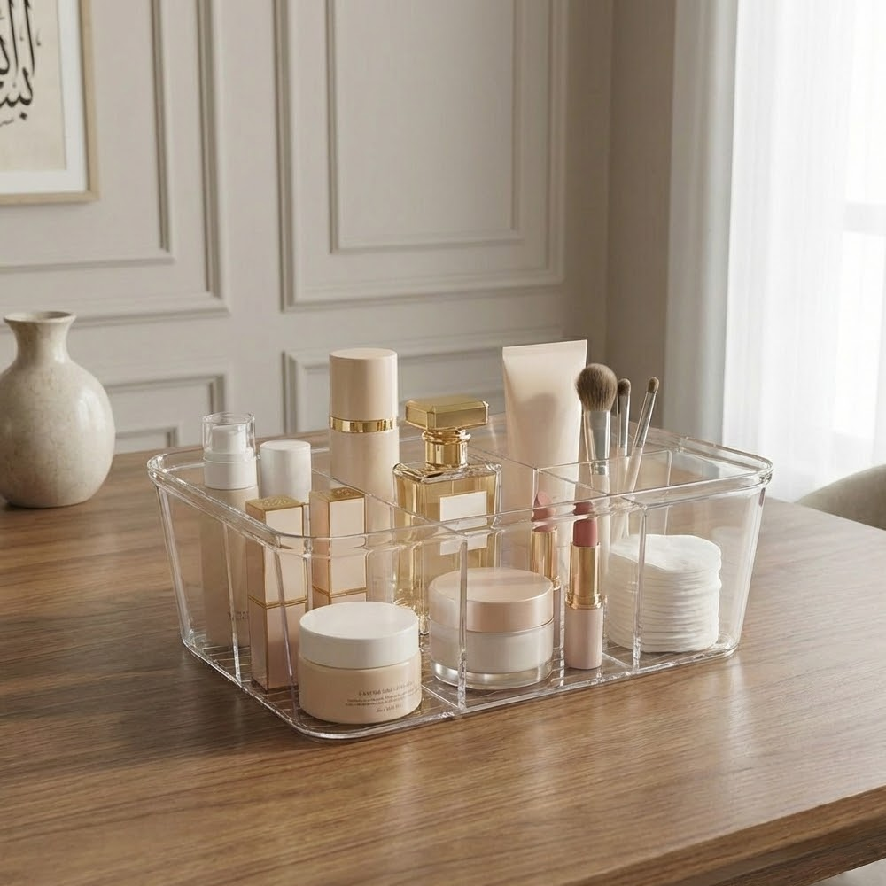يتميز بتقسيمات عملية بأحجام مختلفة تناسب الفرش، أحمر الشفاه، الكريمات، العطور، الإكسسوارات القطنية، والإكسسوارات الصغيرة، مما يجعله مثاليًا لطاولة الزينة أو الحمام أو غرفة النوم.