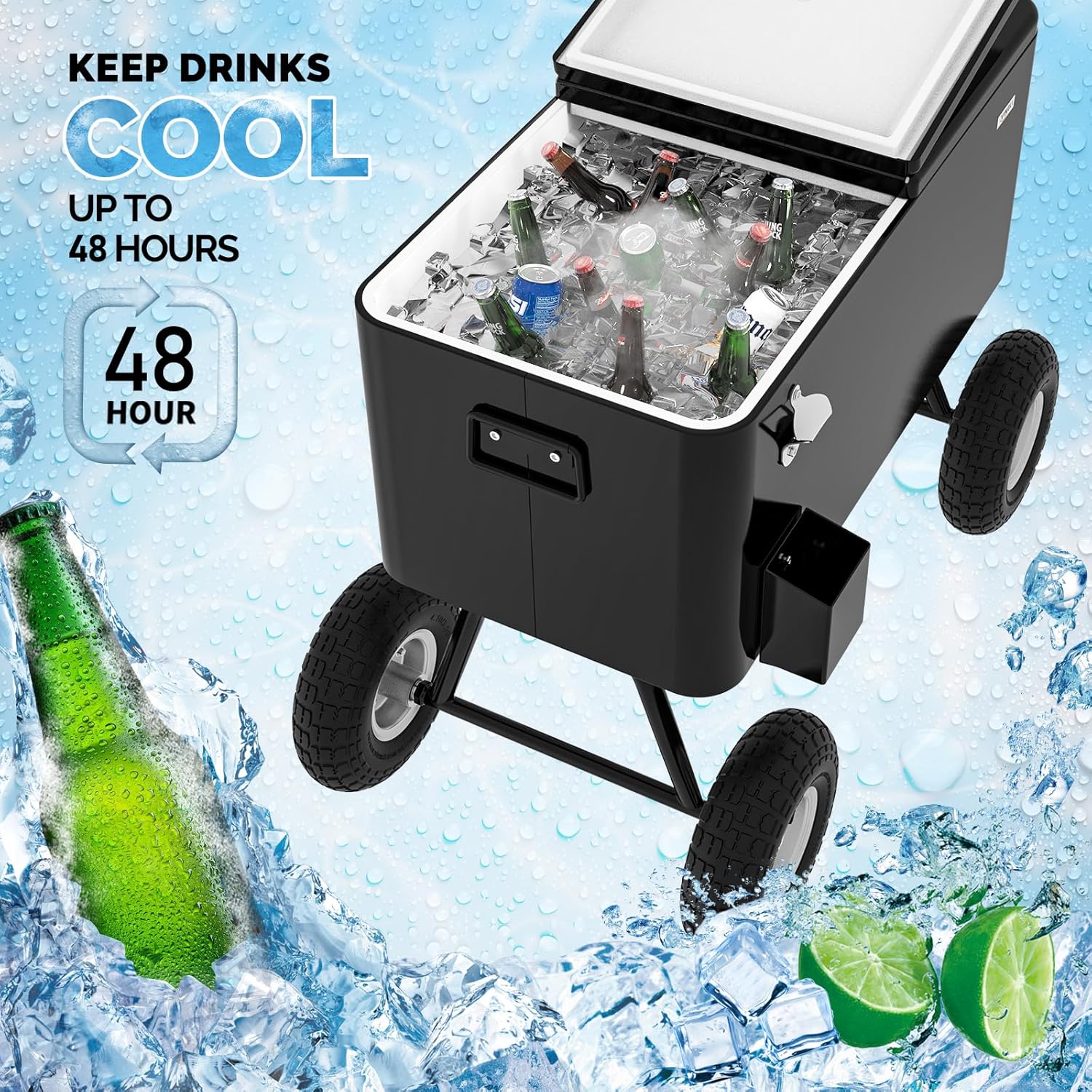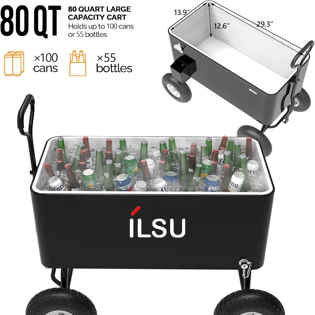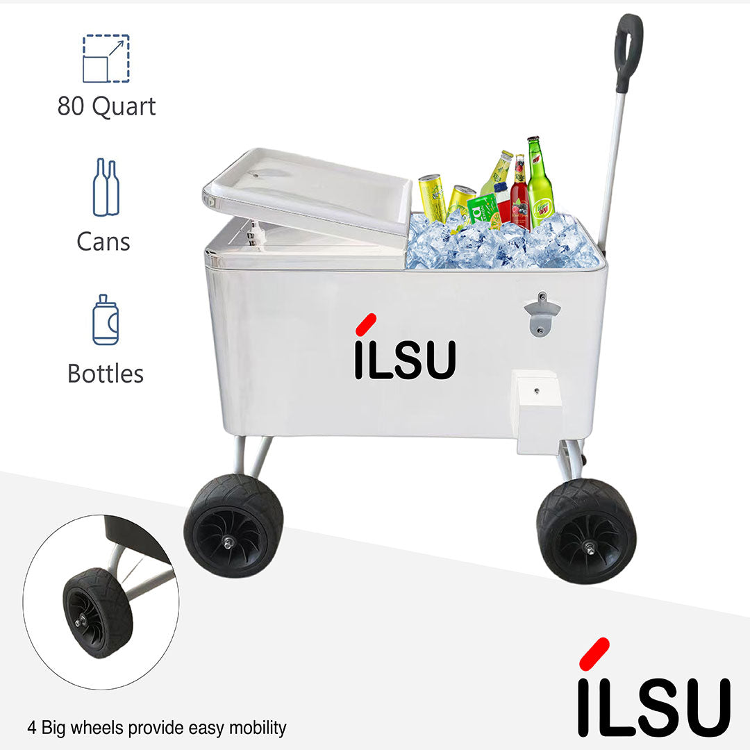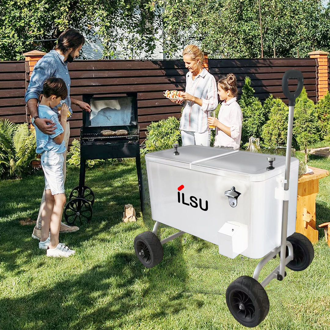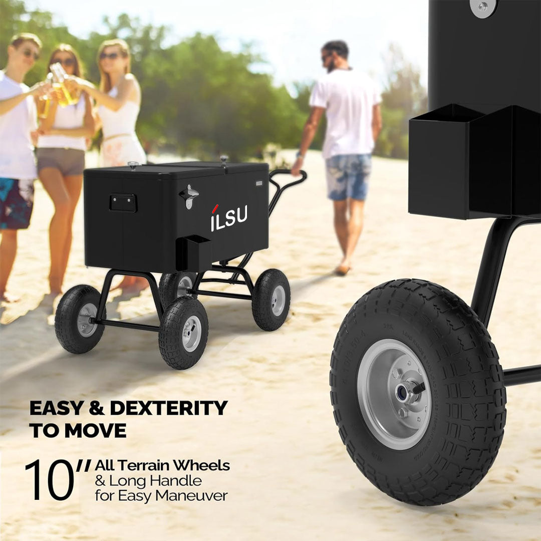 صندوق وعربة تبريد متحرك بسعة 73 لتر من ILSU مع يد قابلة للسحب مع اربع عجلات كبيرة وحامل خارجي وعربة تبريد للمشروبات والحفلات وحمام السباحة والحديقة