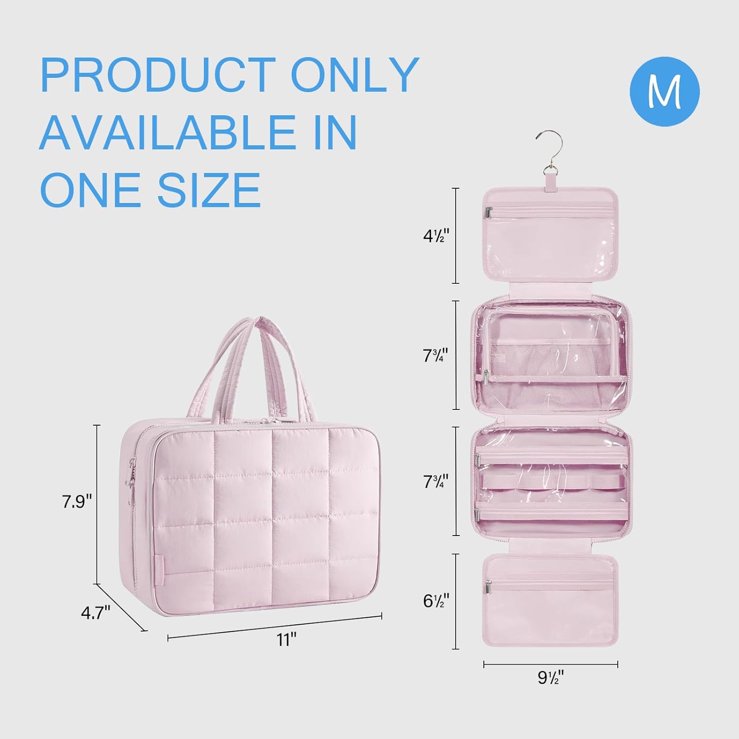 المقاس: متوسط الحجم - 27.94 سم طولاً × 11.44 سم عرضًا × 19.05 سم ارتفاعًا (مغلق). المقاس الكبير - 12.2 سم طولاً × 11.44 سم عرضًا × 22.86 سم ارتفاعًا (مغلق). يمكن لحقيبة أدوات الزينة أثناء السفر تنظيم أدوات الزينة الضرورية أثناء السفر وتخزين المكياج بشكل مثالي