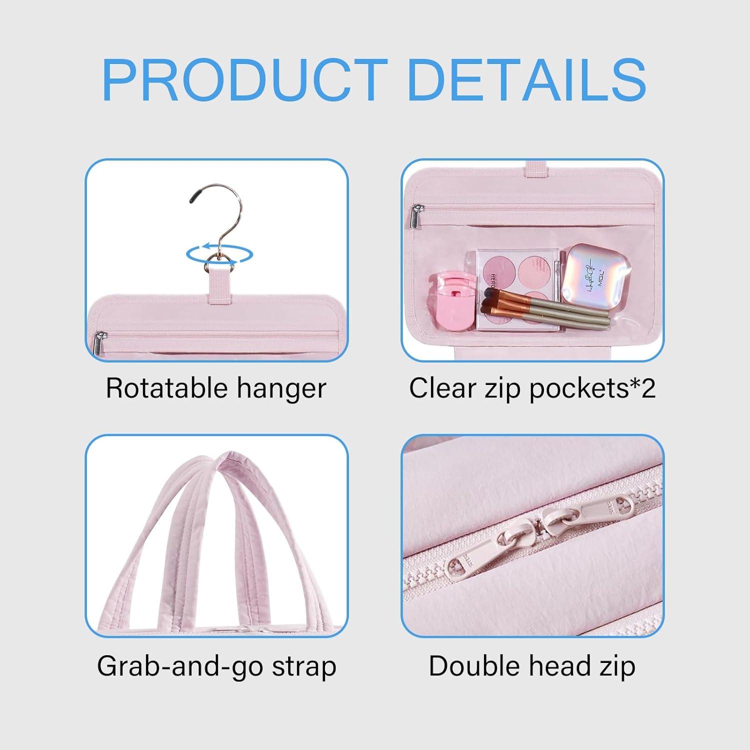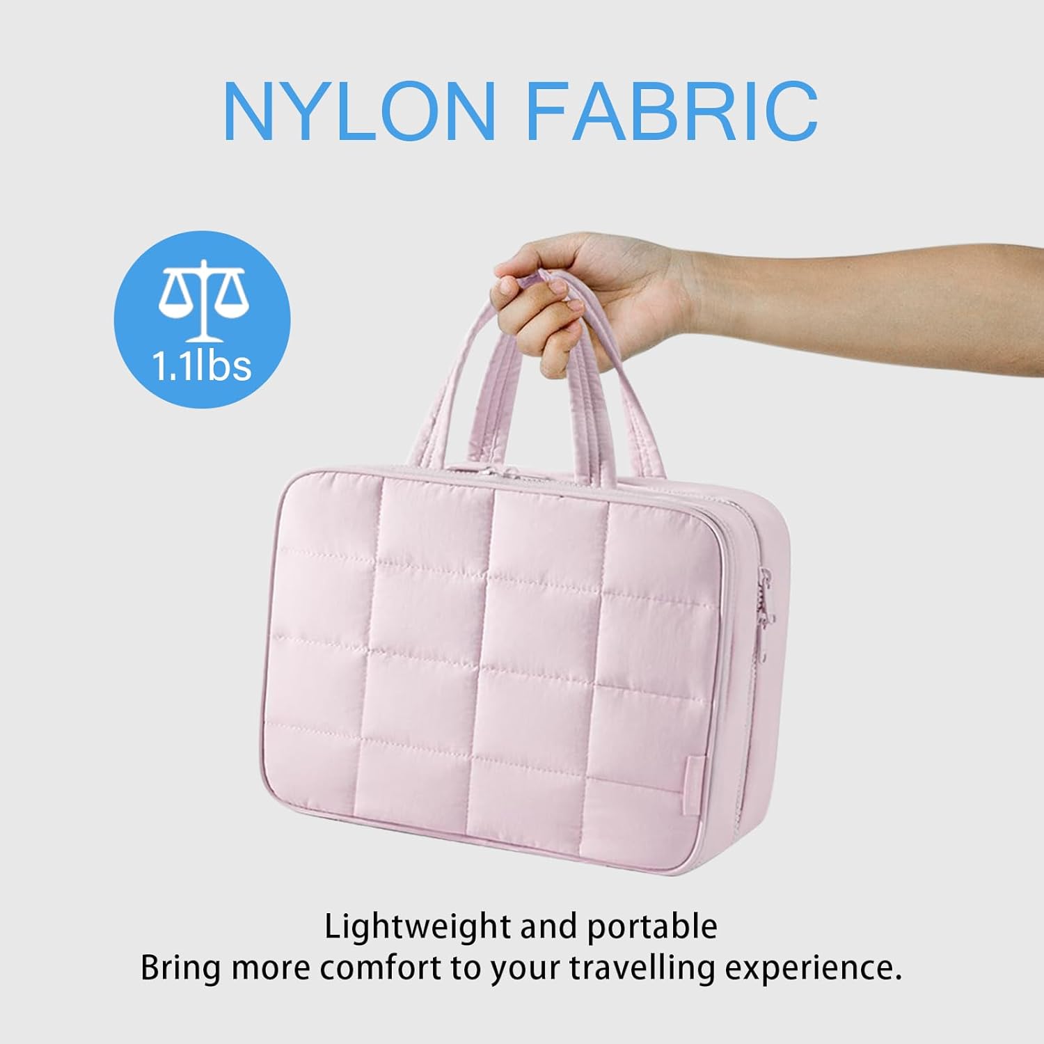 حقيبة أدوات الزينة: حقيبة أدوات الزينة المعلقة مصنوعة من قماش منتفخ ويزن 1.1 رطل إلى 1.5 رطل فقط. نسيج نايلون فائق النعومة وخفيف الوزن يوفر راحة الحمل طوال اليوم