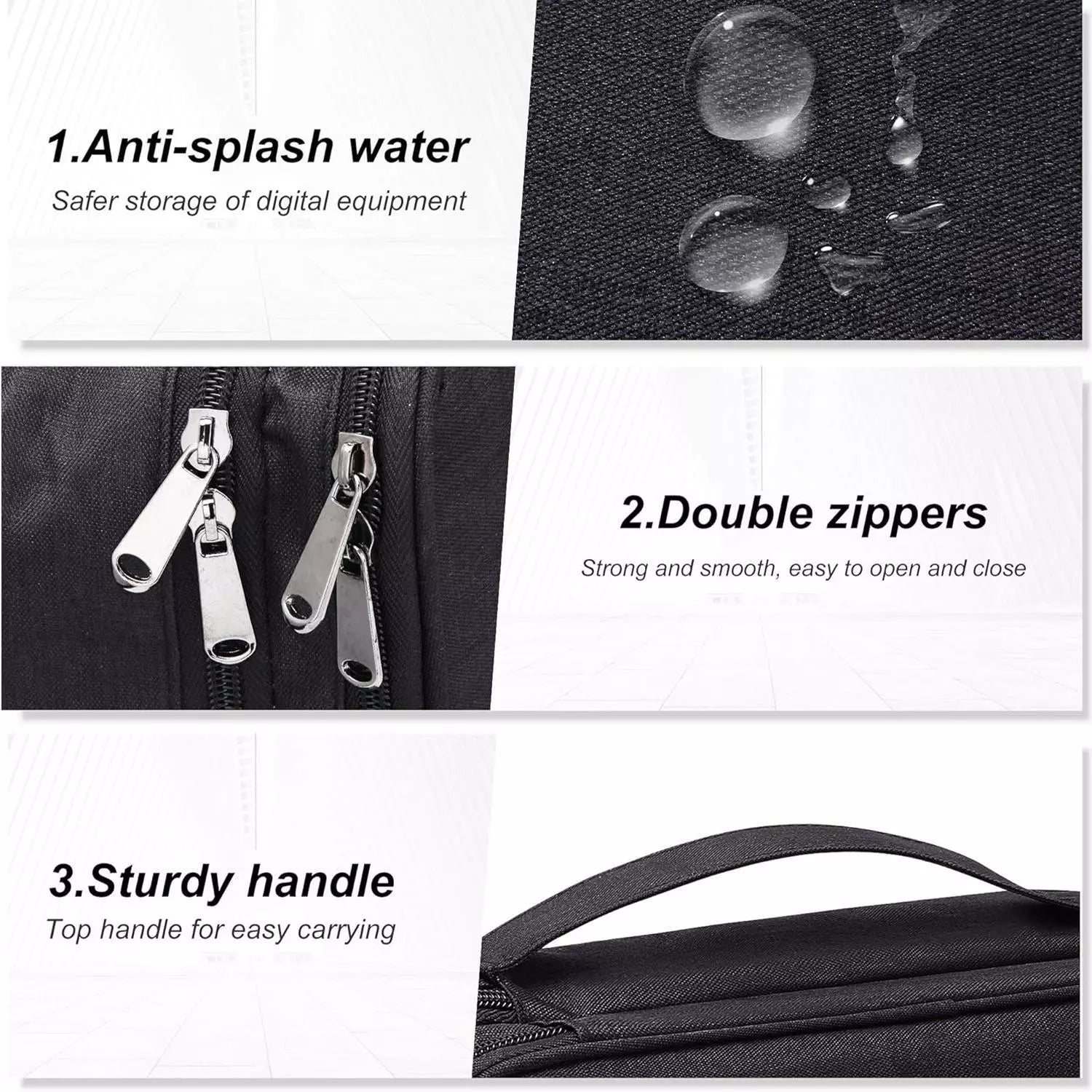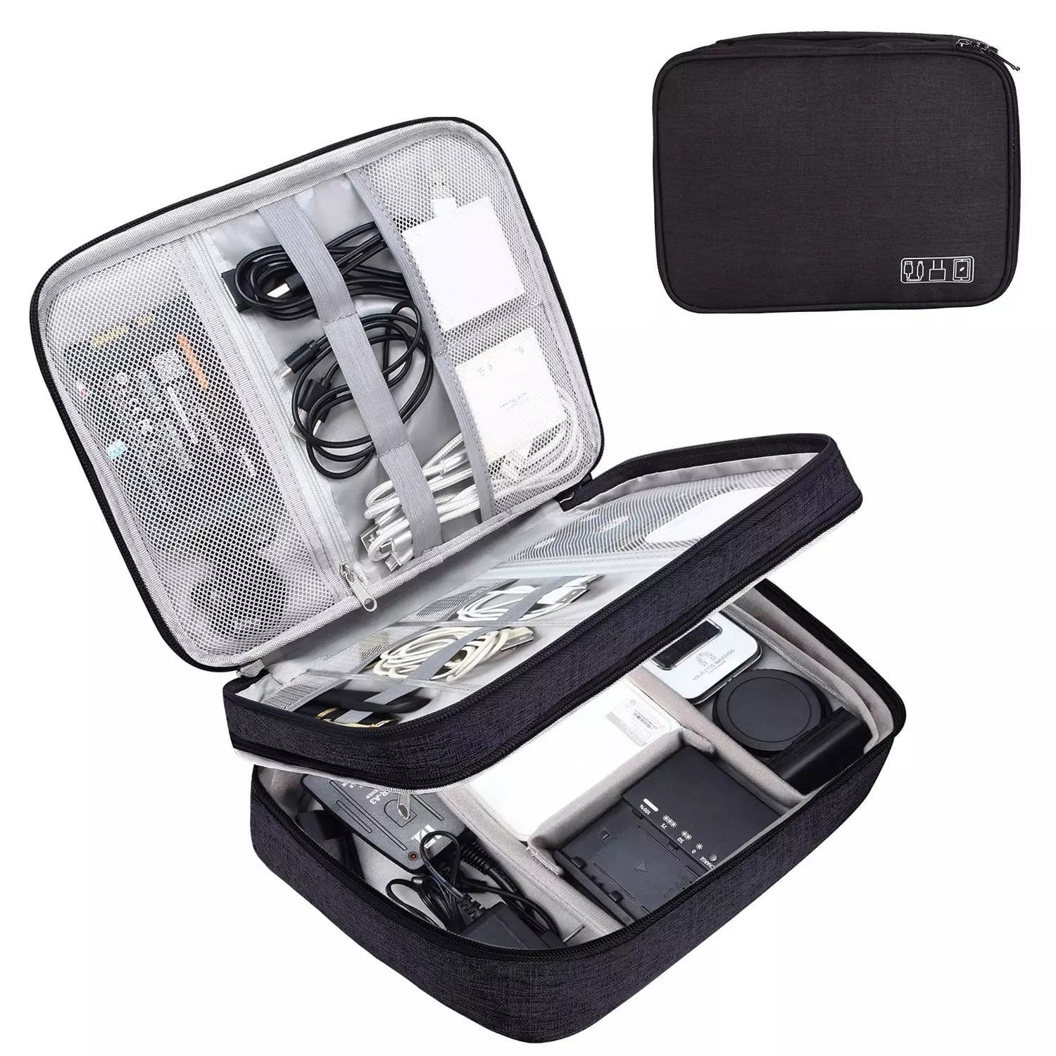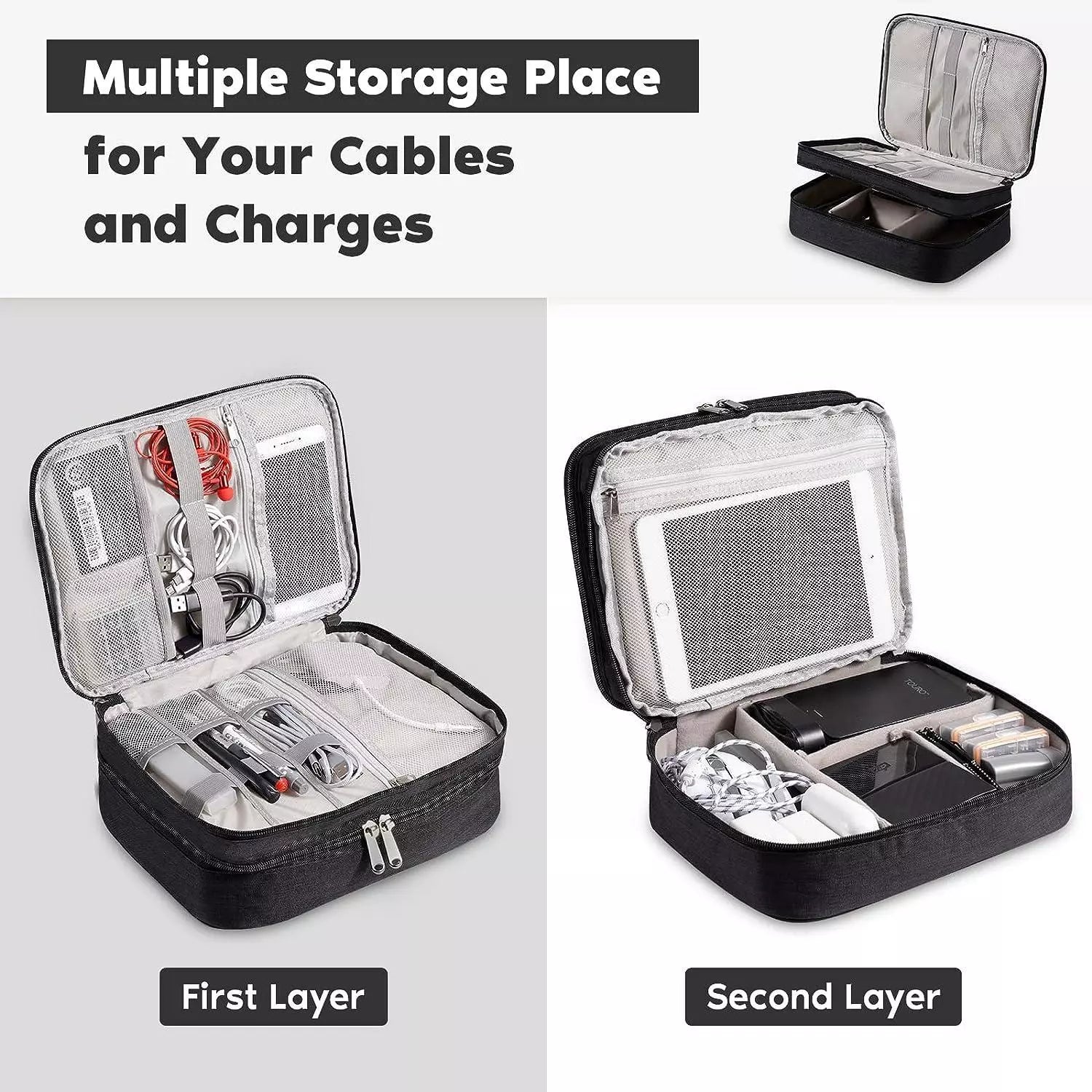 تصميم مزدوج الطبقات: تم تصميم حقيبة الإلكترونيات بمساحة داخلية مكونة من طبقتين، يمكن استخدام المساحة العلوية لتنظيم العناصر الصغيرة، مثل الكابلات، ويو إس بي، والشواحن، والقسم السفلي لتخزين العناصر الأكبر، مثل المحولات، والأقراص الصلبة الخارجية، والكمبيوتر اللوحي، وملحقات السفر الأخرى. بالإضافة إلى ذلك، فإن الفواصل المبطنة قابلة للتعديل ويمكنك تعديلها حسب احتياجاتك. جودة عالية ومقاومة للماء: منظم الإلكترونيات هذا مصنوع من مادة كاتيونية مقاومة للماء ومتينة، ويمكنه حماية ملحقاتك الإلكترونية من الانسكابات والأمطار والغبار والخدوش. تشمل الميزات البارزة الأخرى مقبض حمل قوي وإغلاق سحاب سلس لسهولة الاستخدام والسلامة والأمان. منظم سلك السفر هذا قوي للغاية ومتين. كل الأشياء بالداخل محمية بشكل جيد للغاية. محمول ومريح: مقاس محمول 10.63 × 7.87 × 3.54 بوصة، حجم مثالي للحمل والتخزين في حقيبة الظهر والأمتعة. تصميم المقبض المحمول يجعله سهل الحمل والاستخدام، منظم السفر الإلكتروني هو أداة سفر لا غنى عنها للاستخدام اليومي وإعدادات العمل والمدرسة والمكتب ورحلات العمل. فقط ضع جميع أجهزتك المهمة في منظم كابل السفر، مما يمنعك من ترك الأشياء خلفك. استخدام متعدد الوظائف: يحتوي منظم السفر الإلكتروني هذا على مجموعة متنوعة من الجيوب، بما يكفي لحمل أنواع مختلفة من الملحقات الإلكترونية. حقيبة منظم الكابلات ليست فقط لحماية ملحقاتك الإلكترونية، بل إنها مناسبة أيضًا لتخزين الأقلام والحبوب ومستحضرات التجميل وما إلى ذلك. حقيبة الشاحن هي هدية رائعة لعيد الميلاد ورأس السنة وعيد الحب.