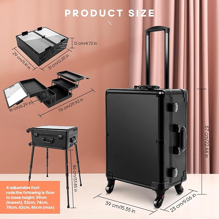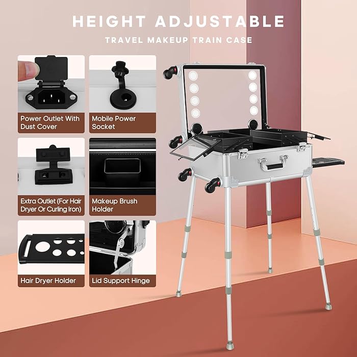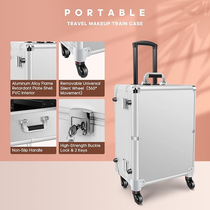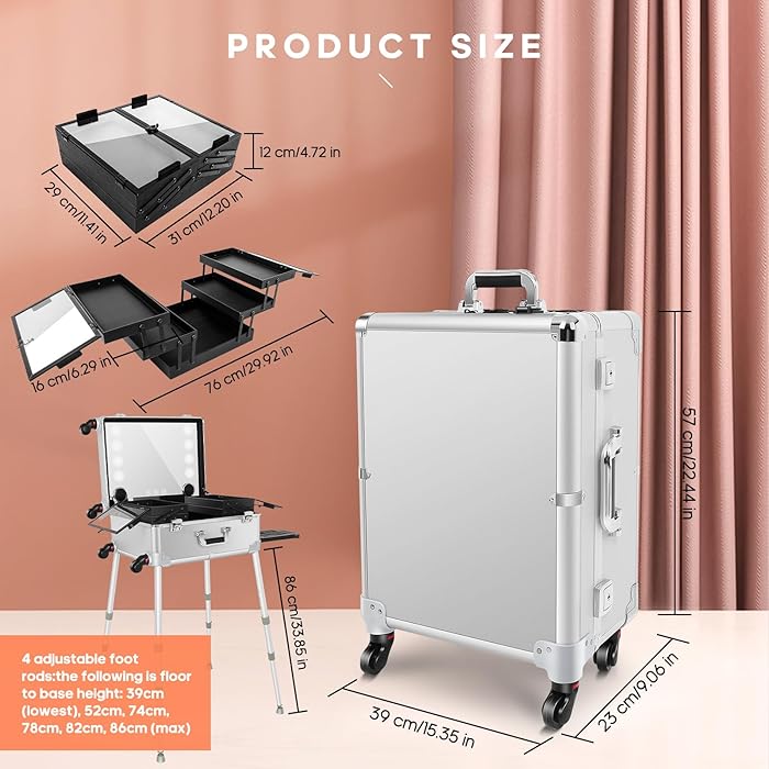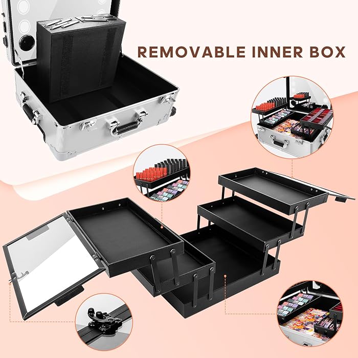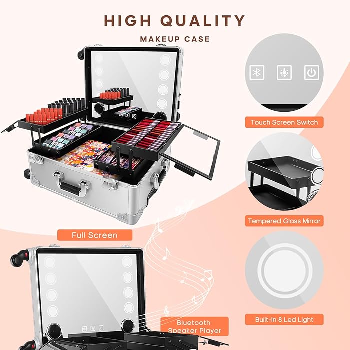 حقيبة مستحضرات تجميل من الألومنيوم مزودة بإضاءة LED، منظم مكياج احترافي 22 بوصة مع حامل مكبر صوت، محطة مكياج مضيئة متدحرجة، 3 درجات إضاءة (فضي)