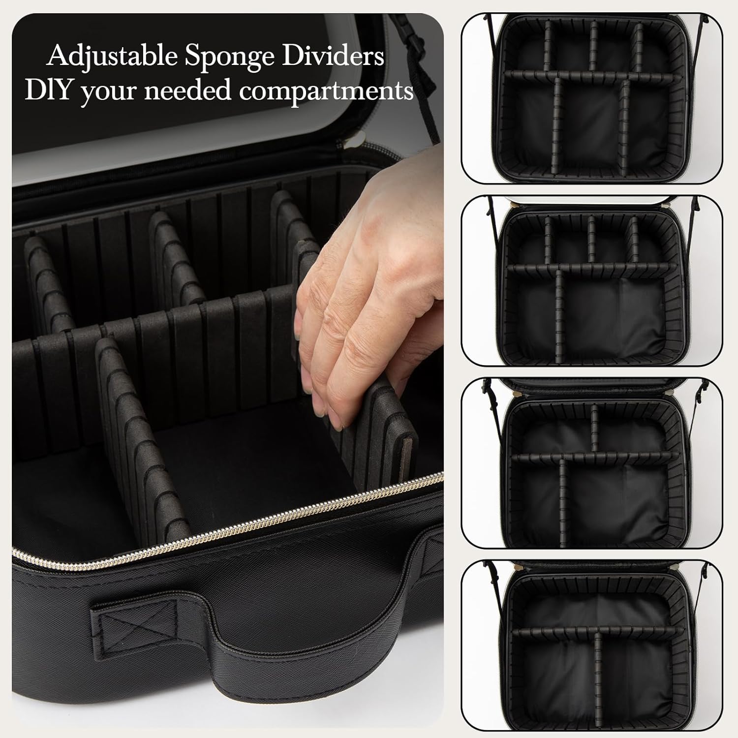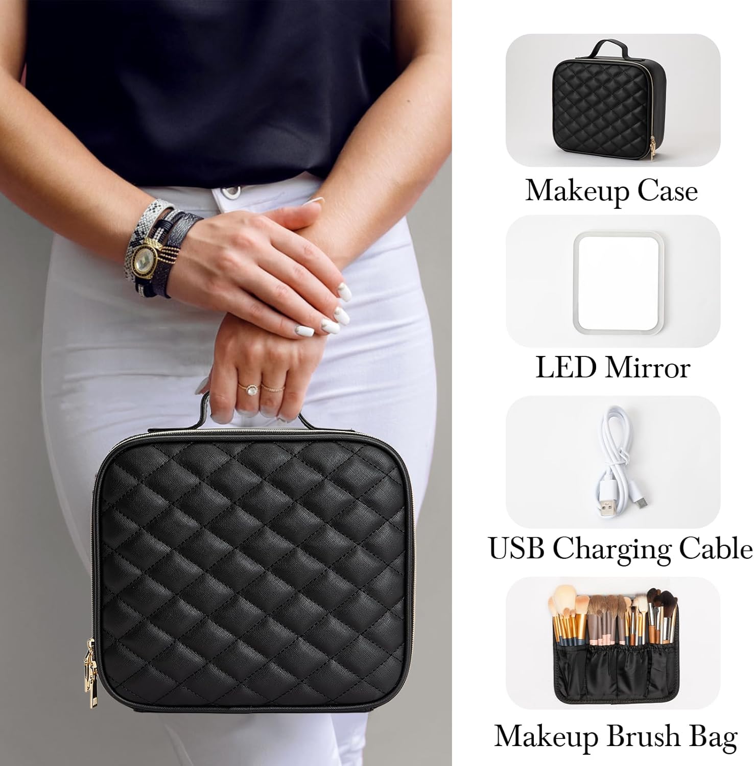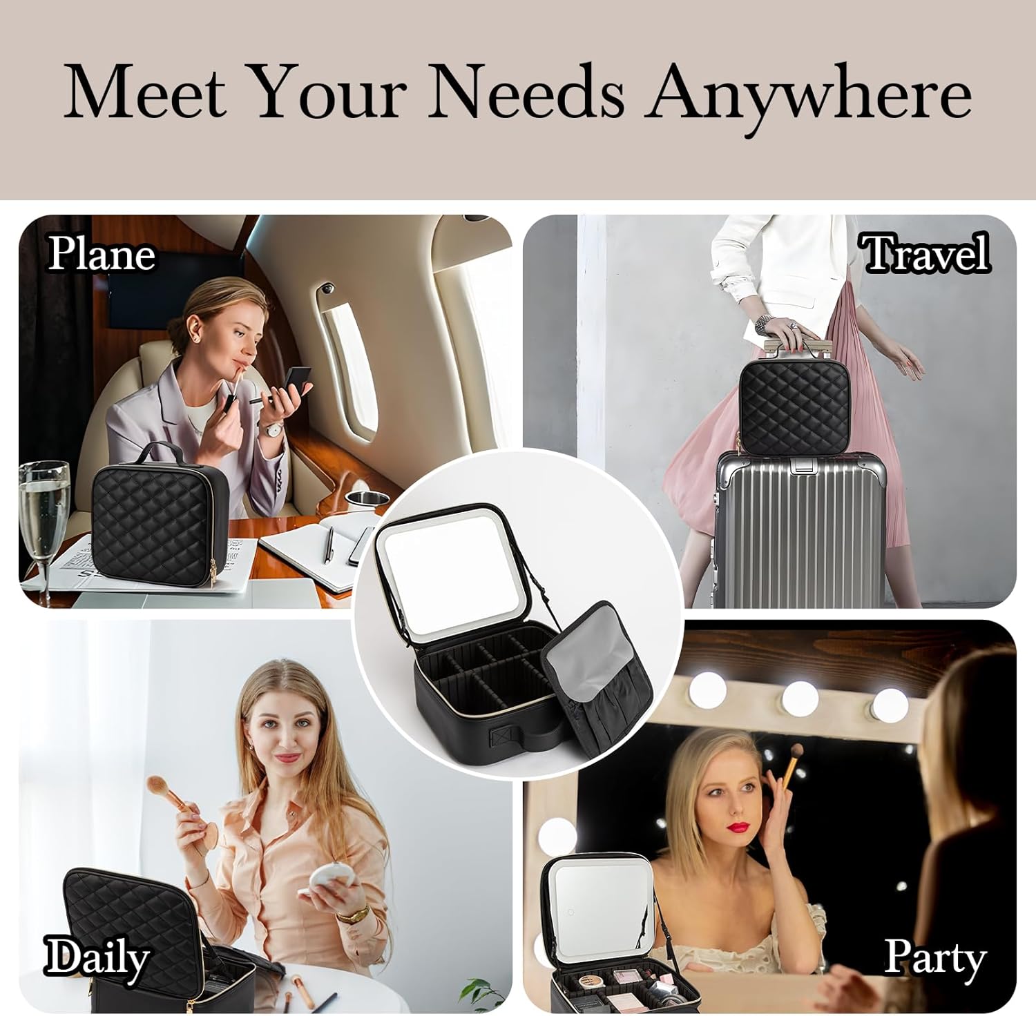 شنطة مكياج قابلة للشحن مع مرآة جلدية LED قابلة للشحن، حافظات لمستحضرات التجميل مع فواصل قابلة للتعديل، منظم مكياج مع لوح تخزين فرش المكياج للنساء والفنانين وغيرهم، أسود، حقائب مستحضرات التجميل