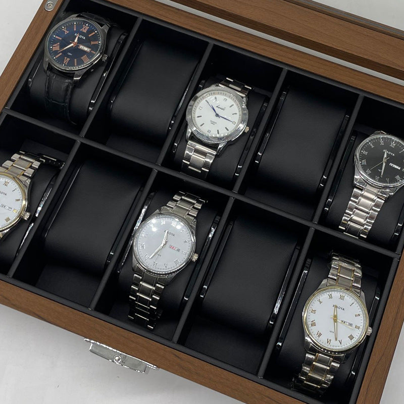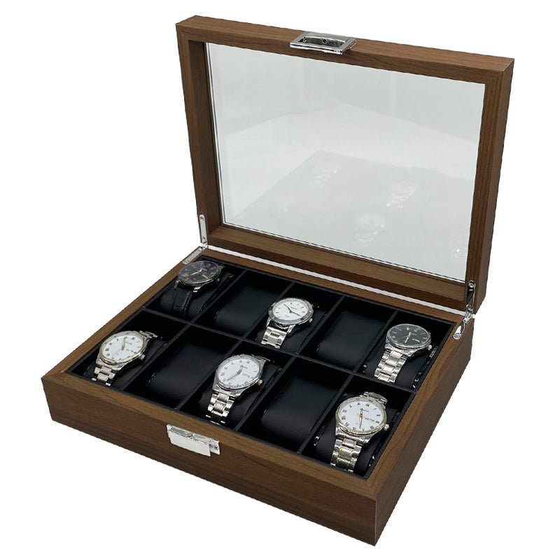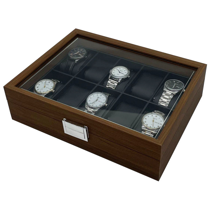 صندوق فاخر لتخزين الساعات من خشب الجوز البني 10 فتحة، صندوق تخزين لعرض الساعات من الداخل بقواعد جلدية من اللون الاسود مع غطاء من الزجاج