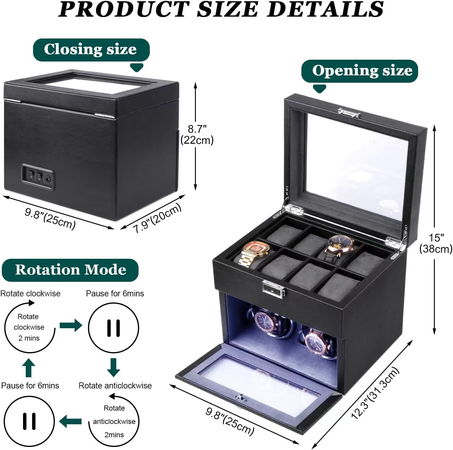 - إعداد الوضع التلقائي بدون مجهود: ببساطة قم بتنشيط مفتاح وضع الدوران، وسيعمل جهاز لف الساعة في وضع تلقائي بالكامل. ستدور في اتجاه عقارب الساعة لمدة دقيقتين ثم تتوقف لمدة 6 دقائق، تليها دوران عكس اتجاه عقارب الساعة لمدة دقيقتين وإيقاف آخر لمدة 6 دقائق. يضمن إعداد النظام هذا عدم تعرض ساعتك الميكانيكية للدوران المفرط، مما يحميها من التلف المحتمل.