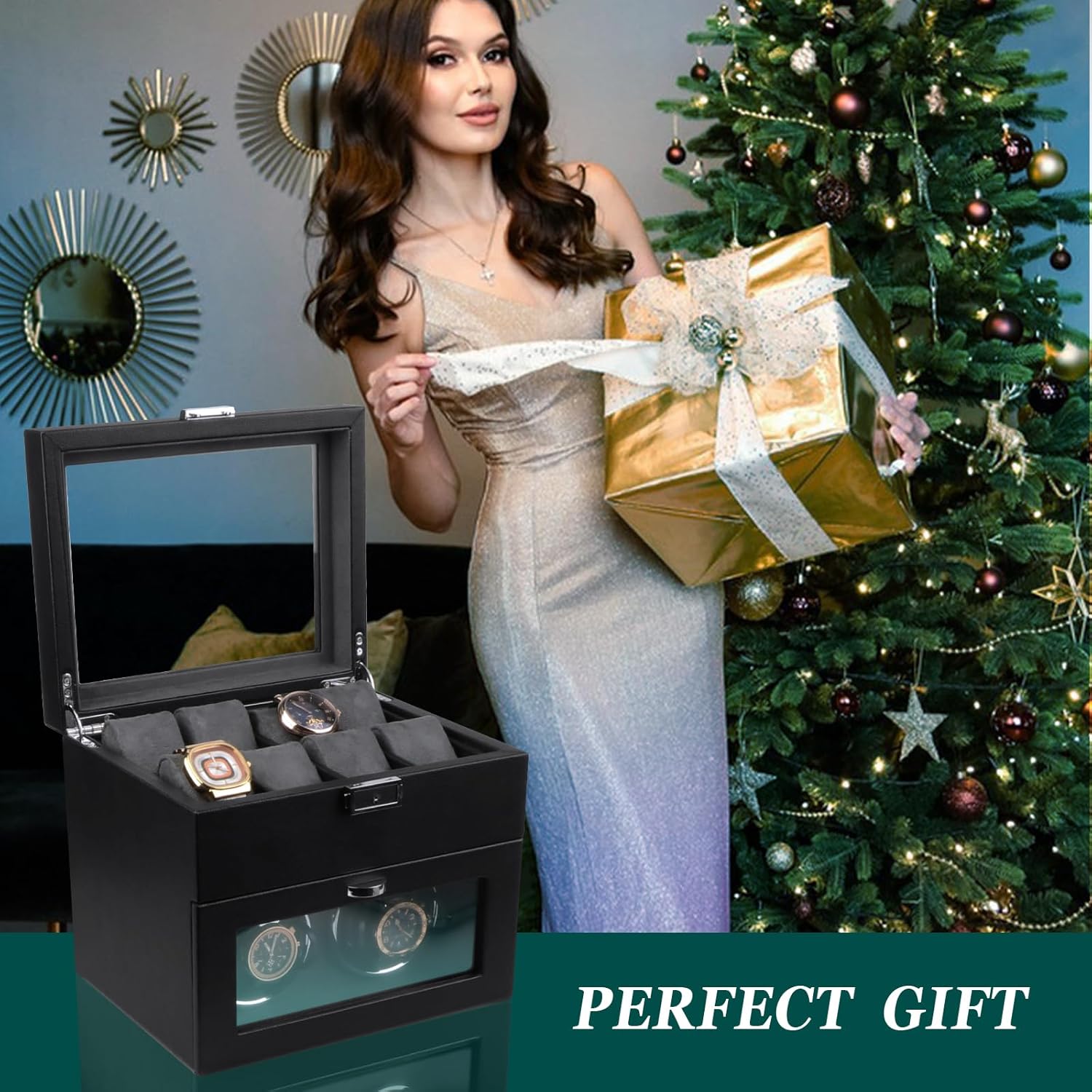 - تصميم مريح مزدوج الوظائف: يتميز جهاز لف الساعة هذا بمزيج من وظيفتين في وظيفة واحدة. مع منطقتين متعرجتين مصممتين خصيصًا للساعات الأوتوماتيكية، ومساحة صندوق ساعة إضافية بثمانية فتحات، فهو مناسب تمامًا لتخزين كل من ساعات الرجال والنساء، إلى جانب المجوهرات الأخرى. قل وداعًا لإضاعة الوقت في البحث عن إكسسوارات المجوهرات مع هذا الحل الشامل.