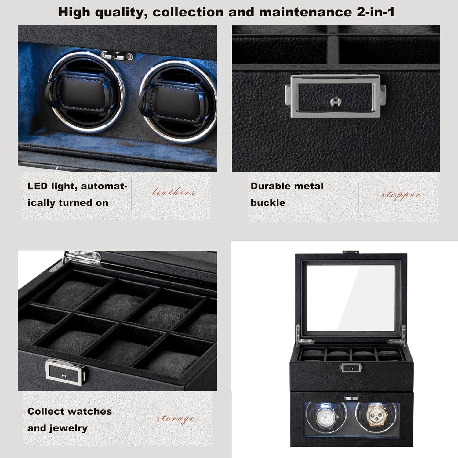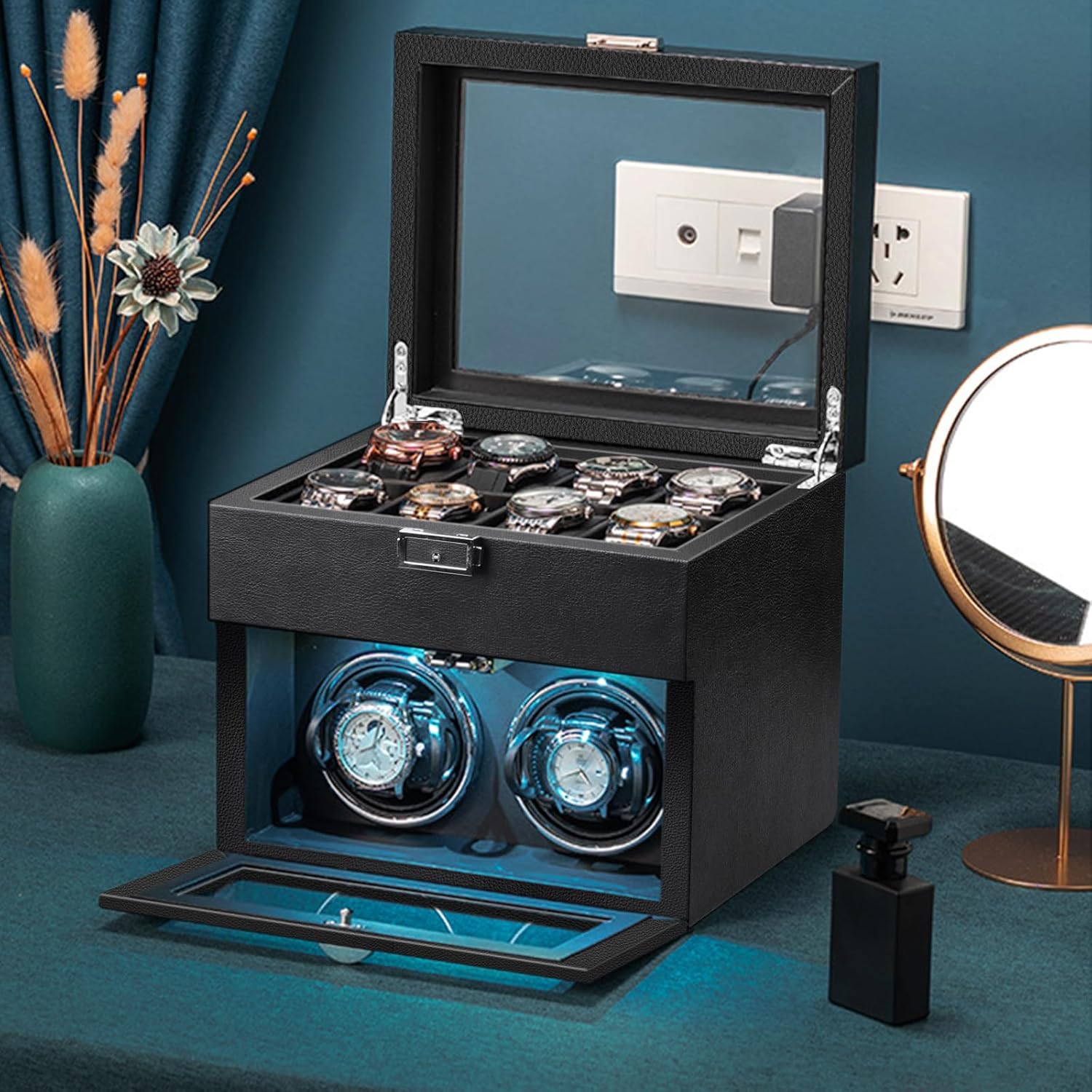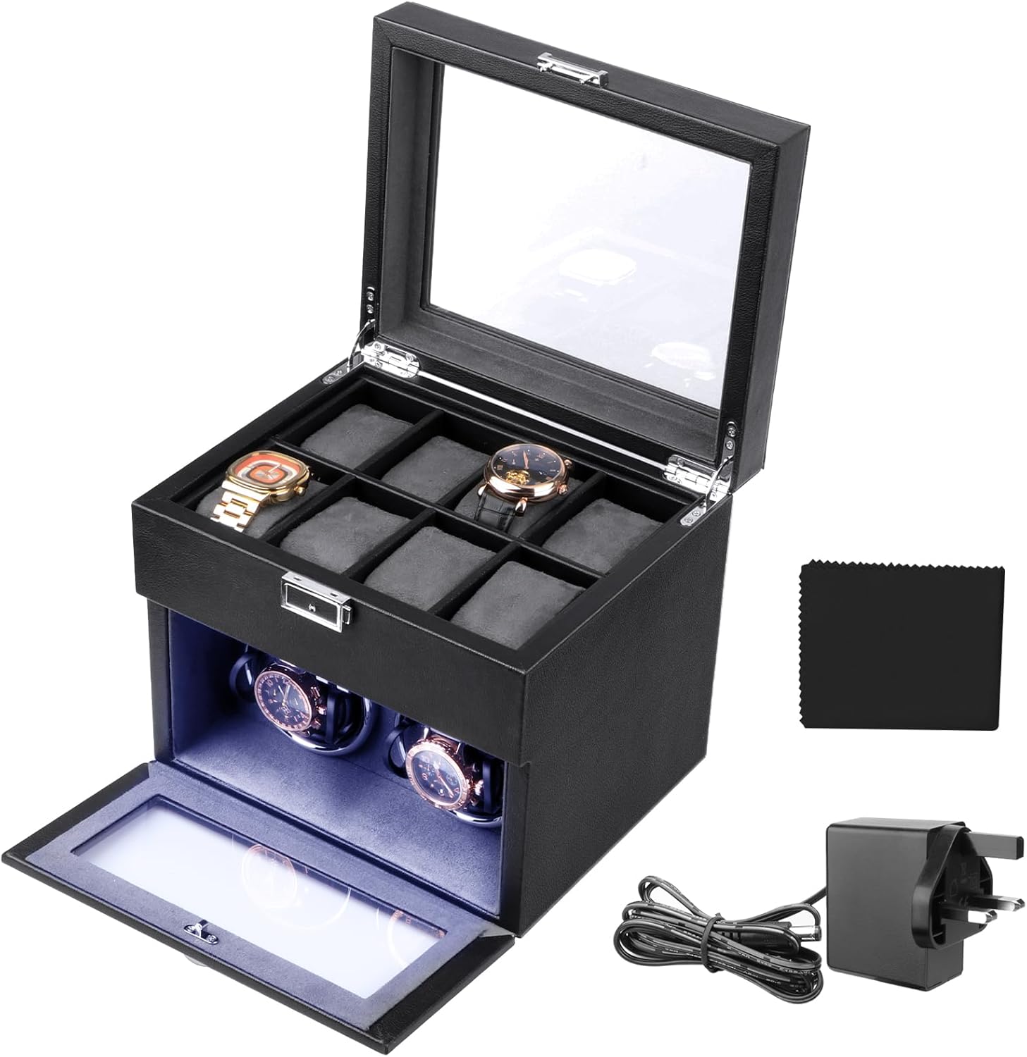 صندوق دوار تلقائي مزدوج للساعات - محرك هادئ، ضوء LED مع 8 فتحات وسائد قابلة للتعديل - منظم مجوهرات للرجال والنساء